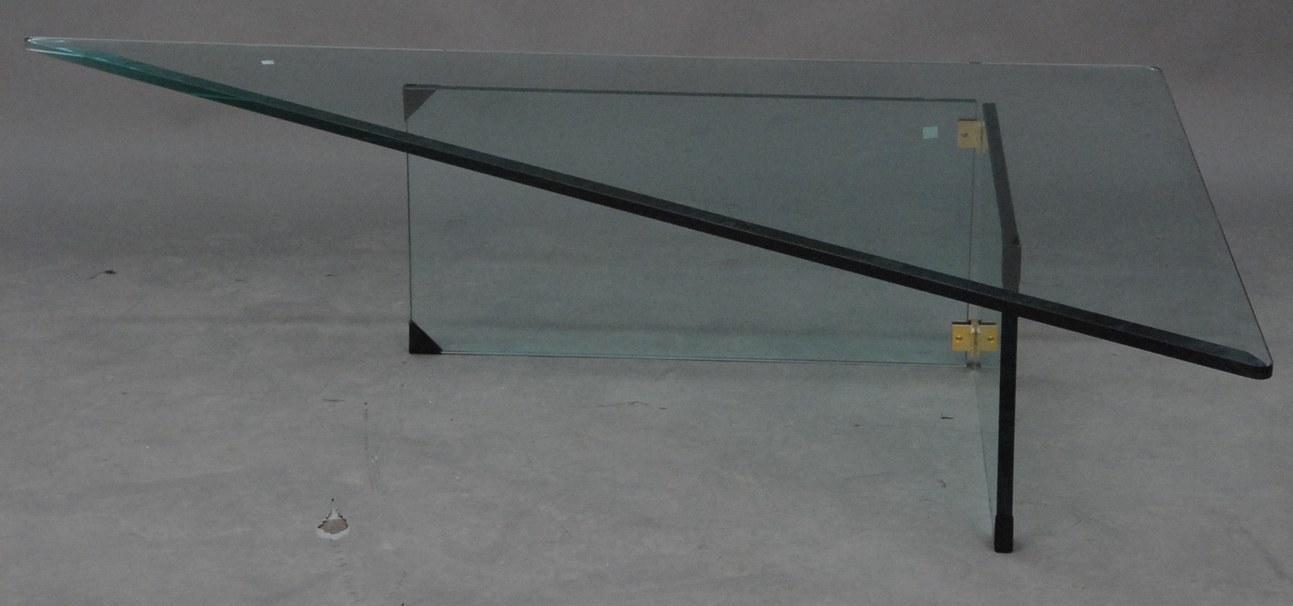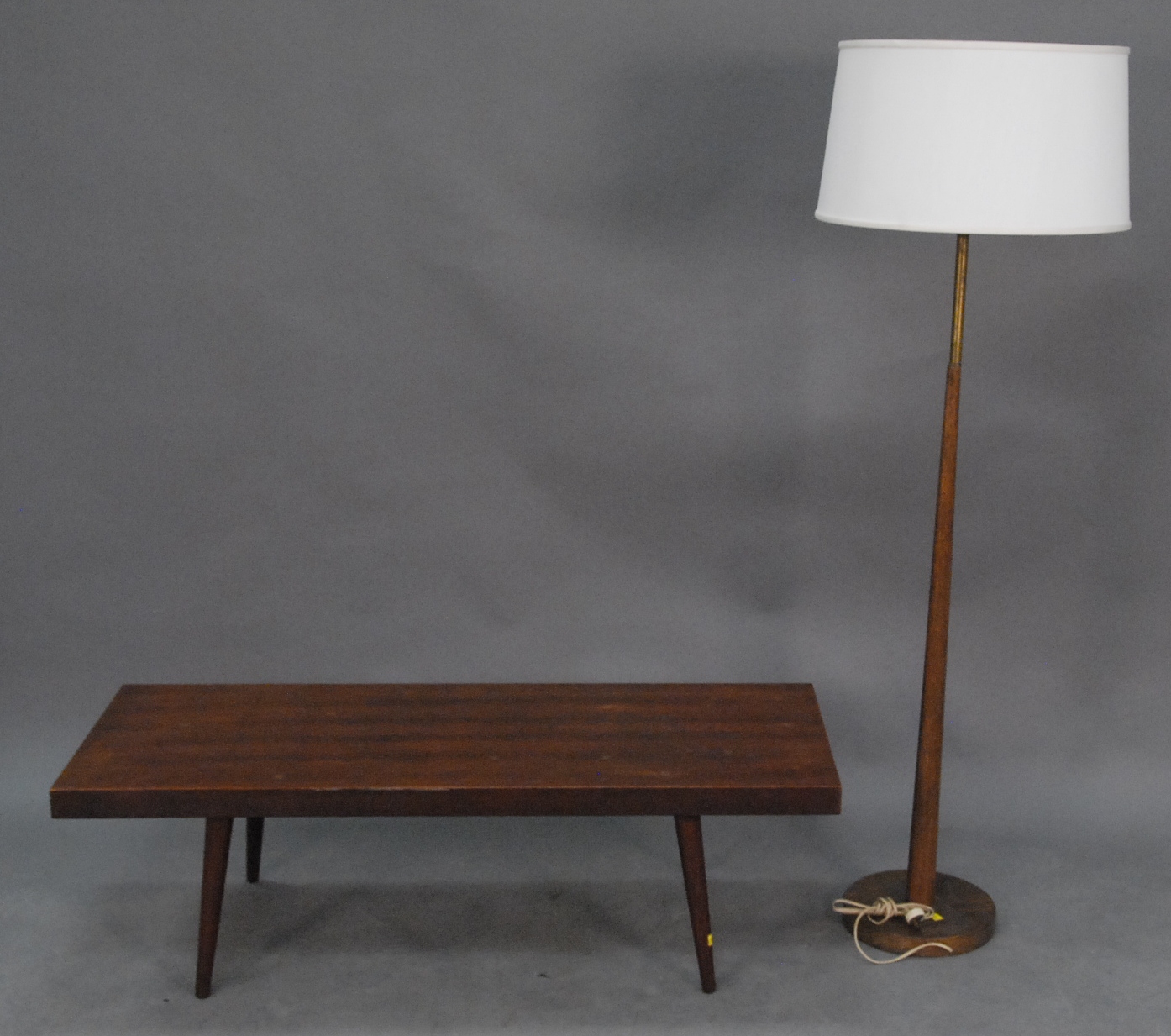 Two piece lot Lightolier style floor lamp of oak and brass with a round base and tapered shaft, circa 1944 and Mid-Century modern coffee table, ht. 59.