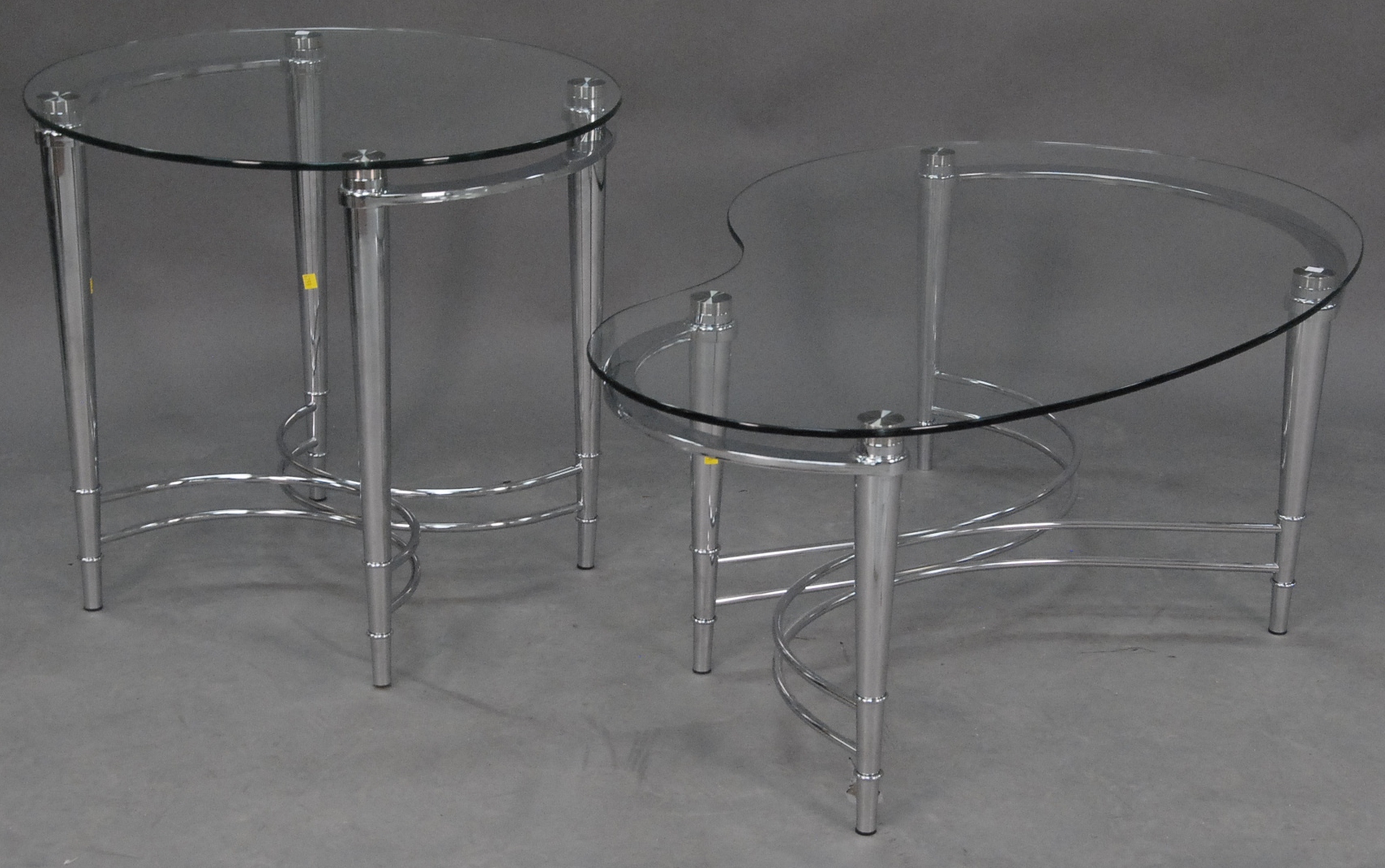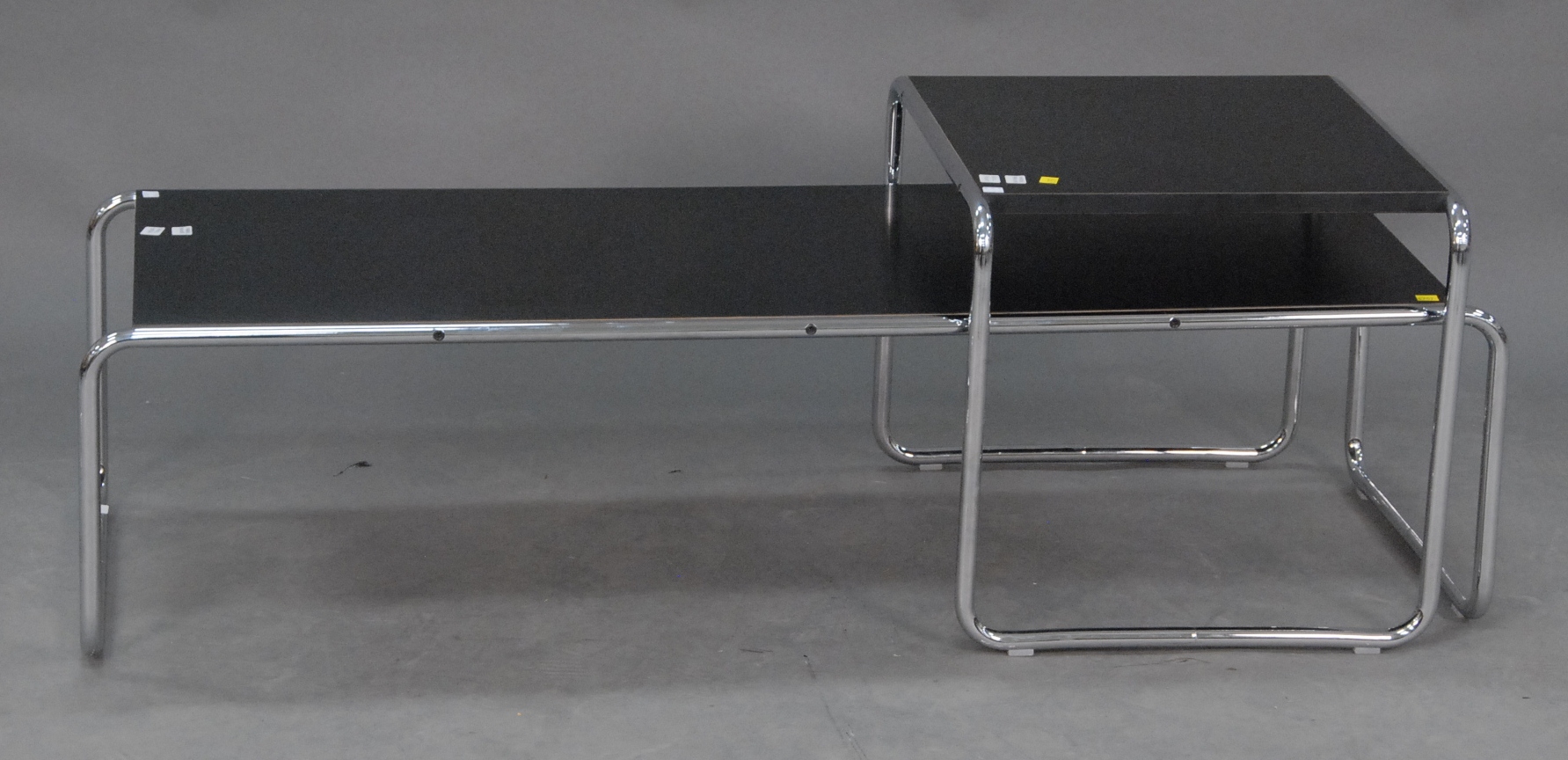 Two Marcel Breuer tubular chrome tables with black laminate tops by Knoll Studio, circa late 1990s edition coffee table: lg. 52 wd. 18 1/2, side table: 18 1/2 x 18 1/2.