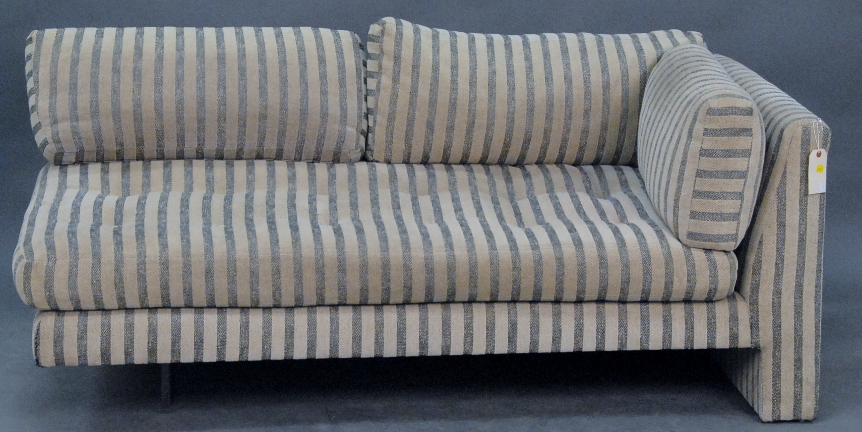 Vladimir Kagan Omnibus one arm sofa model # R7076 supported at one end by a vertical plinth of clear lucite circa 1970. Believed to be original upholstery, lg. 66.