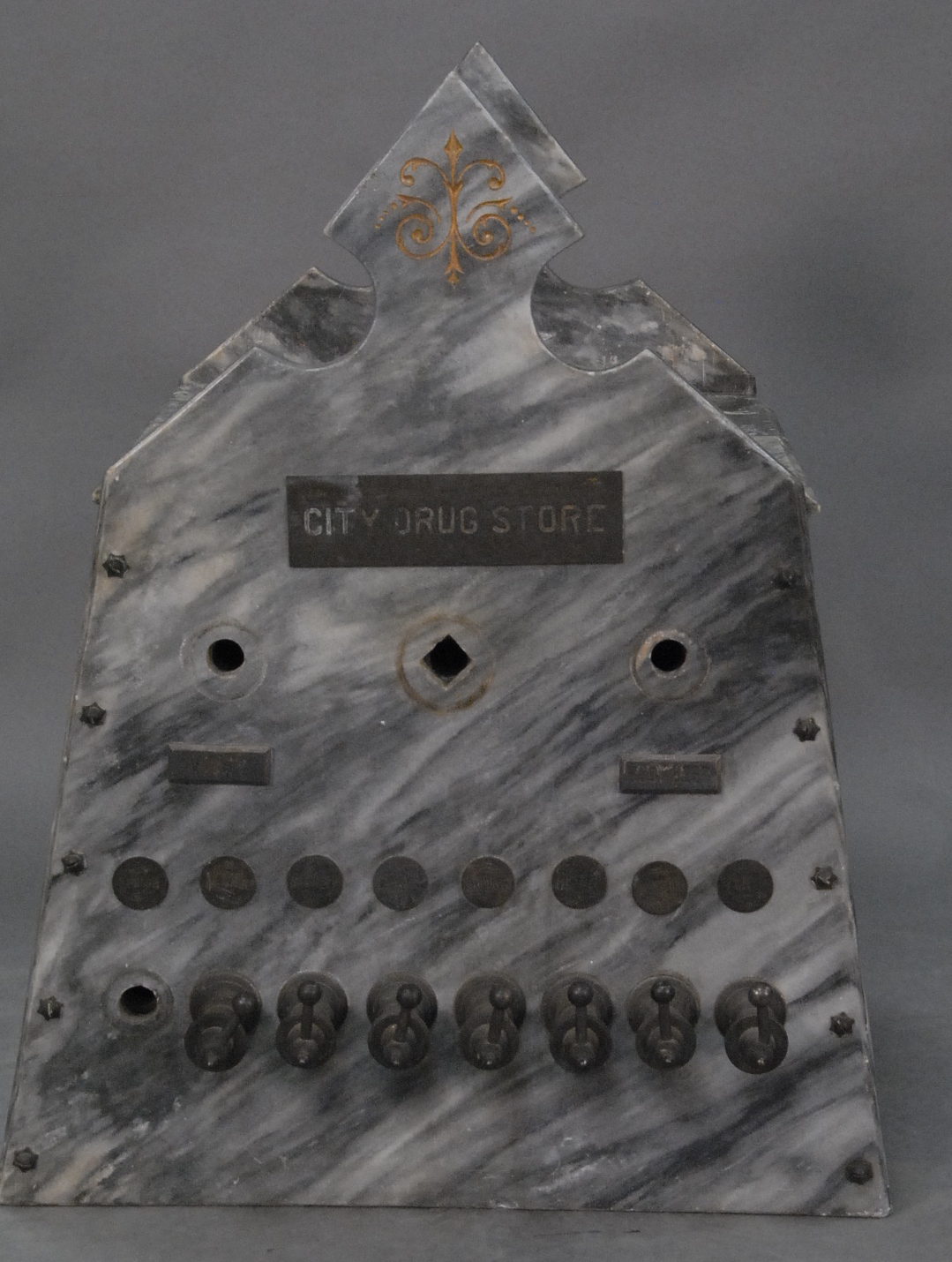 Marble soda dispenser with plaque City Drug Store and side plaque marked The Arctic Soda Apparatus J. W. Tufts Boston, Mass, with seven spigots with flavors one missing, ht. 31, wd. 20.