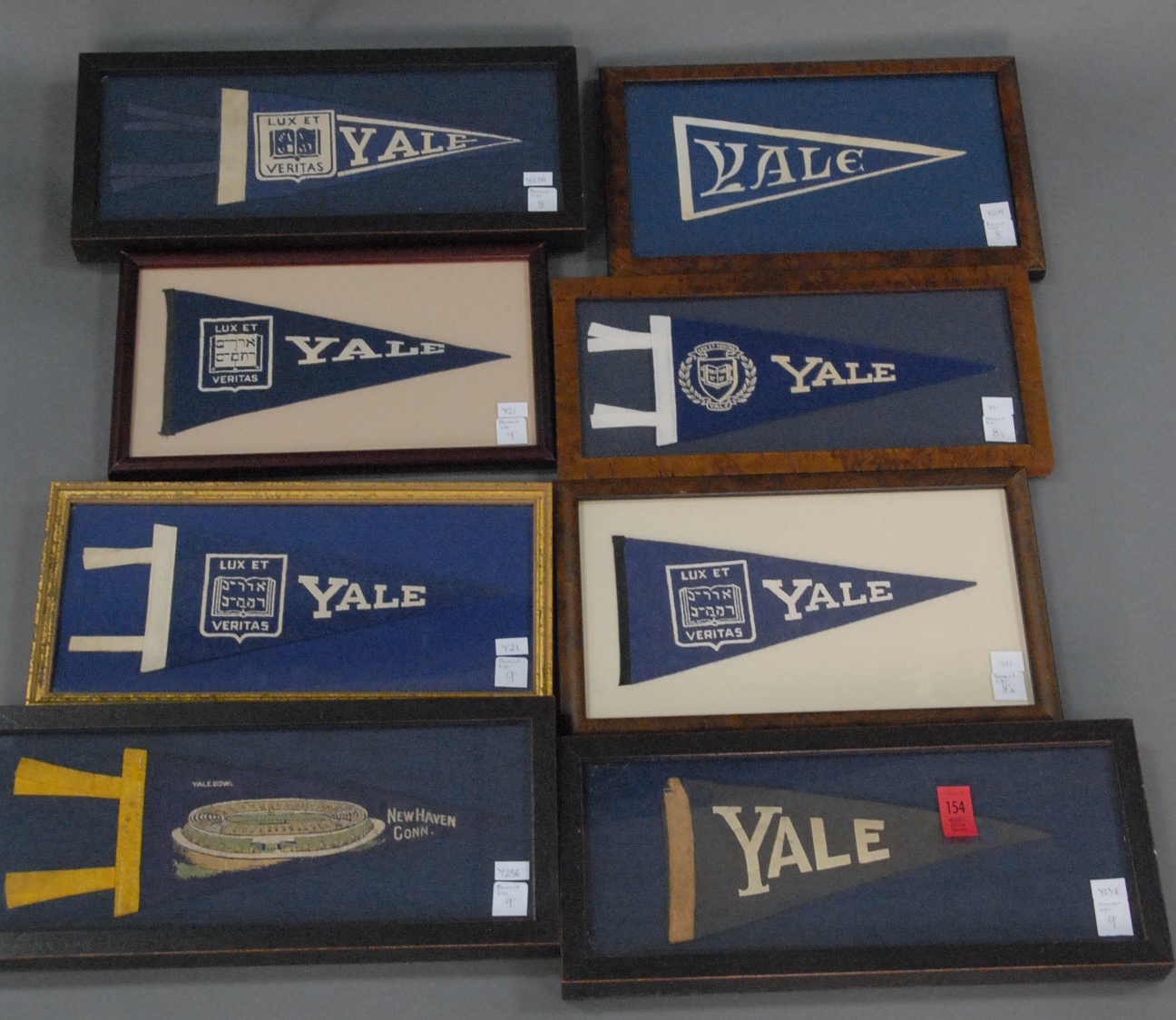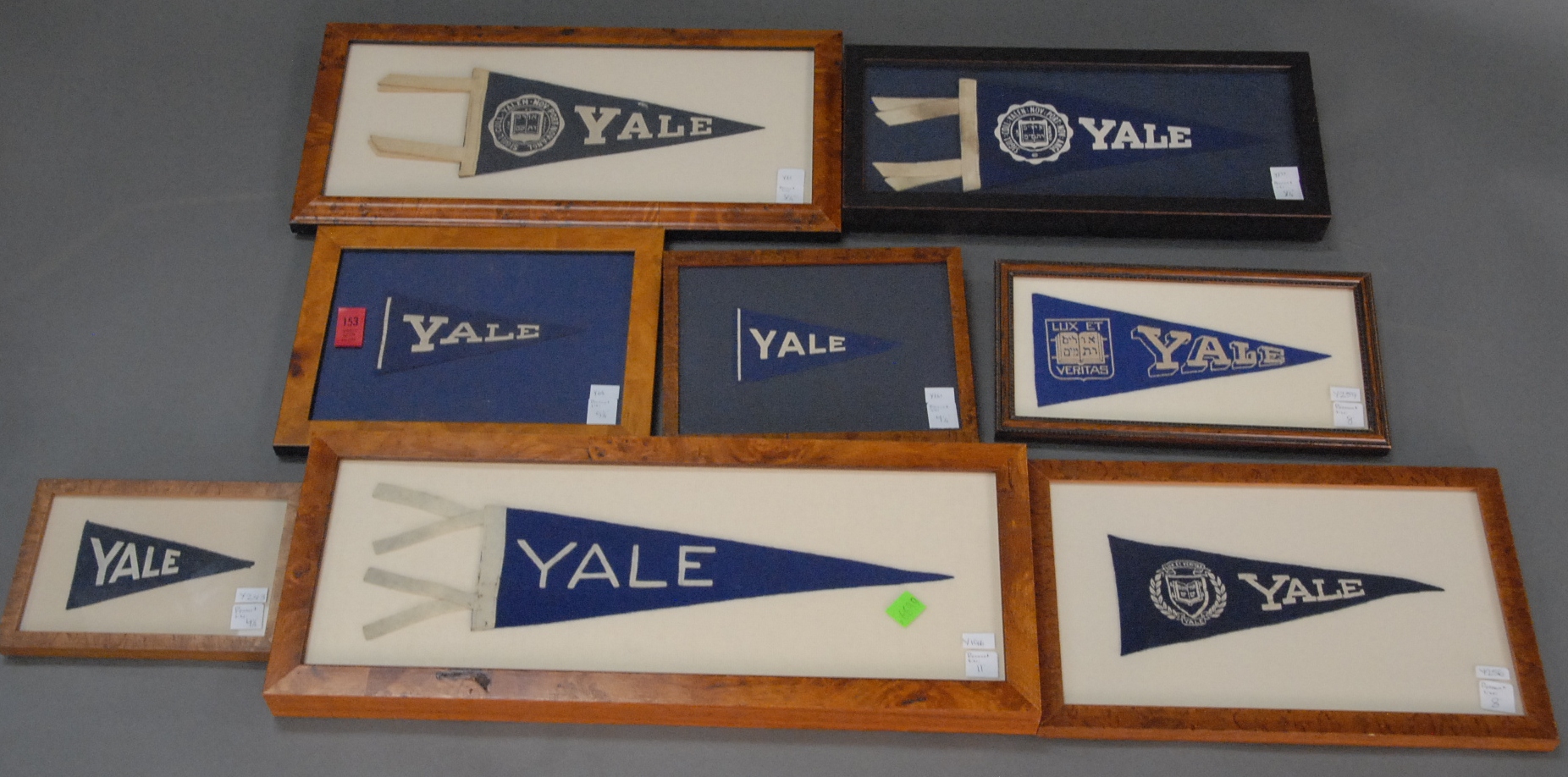 Three piece framed lot group of 17 Yale tobacco silks and leathers including six large felts and leathers and a silk with bulldog plus Yale Rah Rah, ten Yale tobacco felts and leathers including four pennants circa 1900-1920, and collection of ten Yale tobacco felts and leathers including five pennants circa 1900-1920.