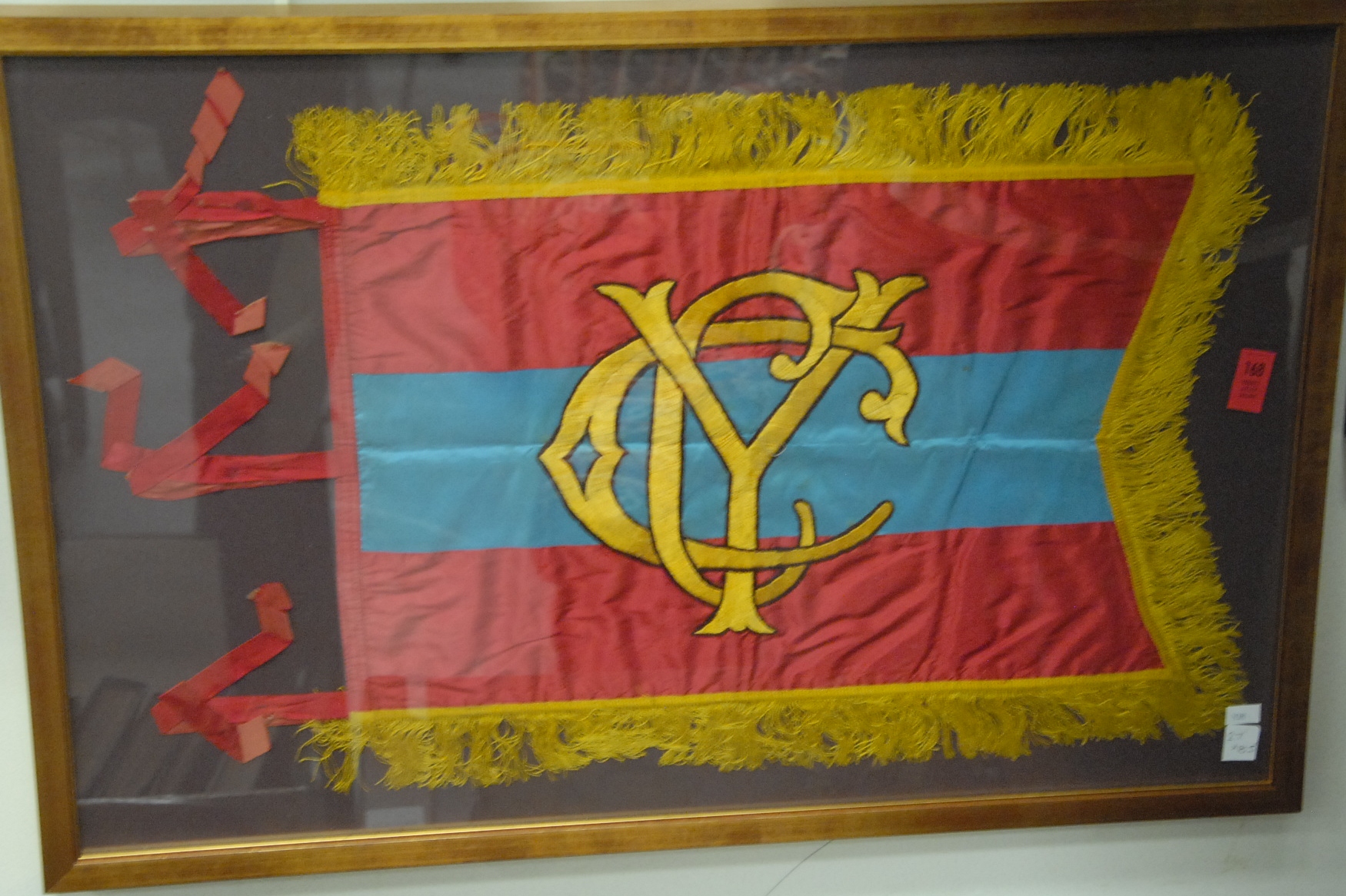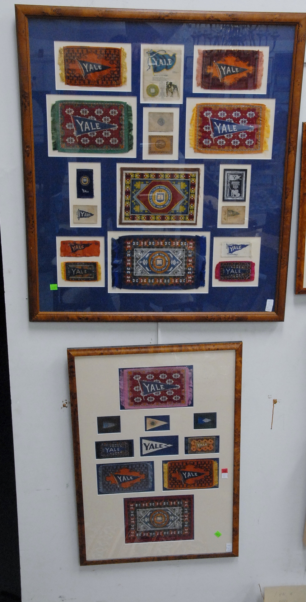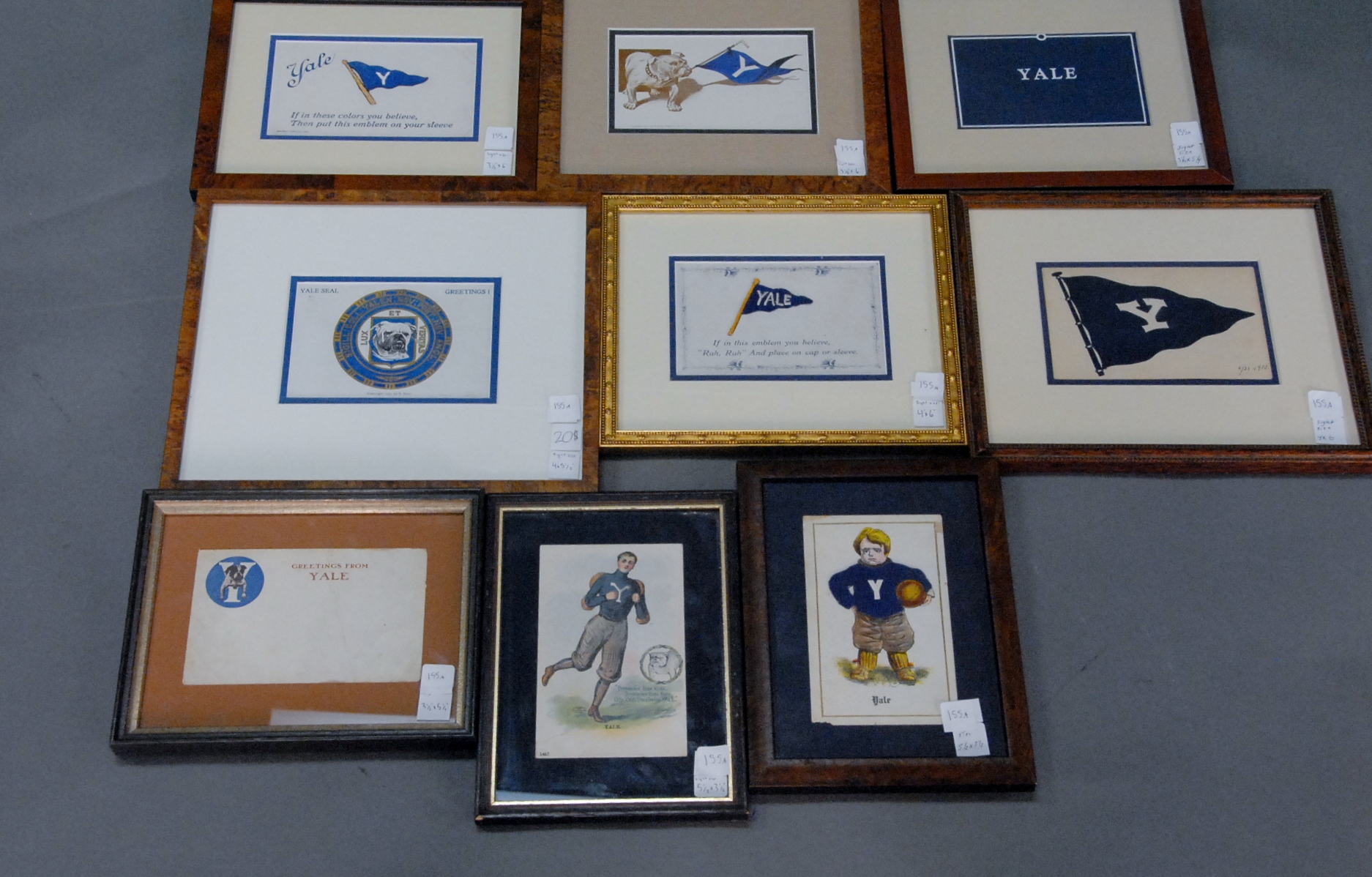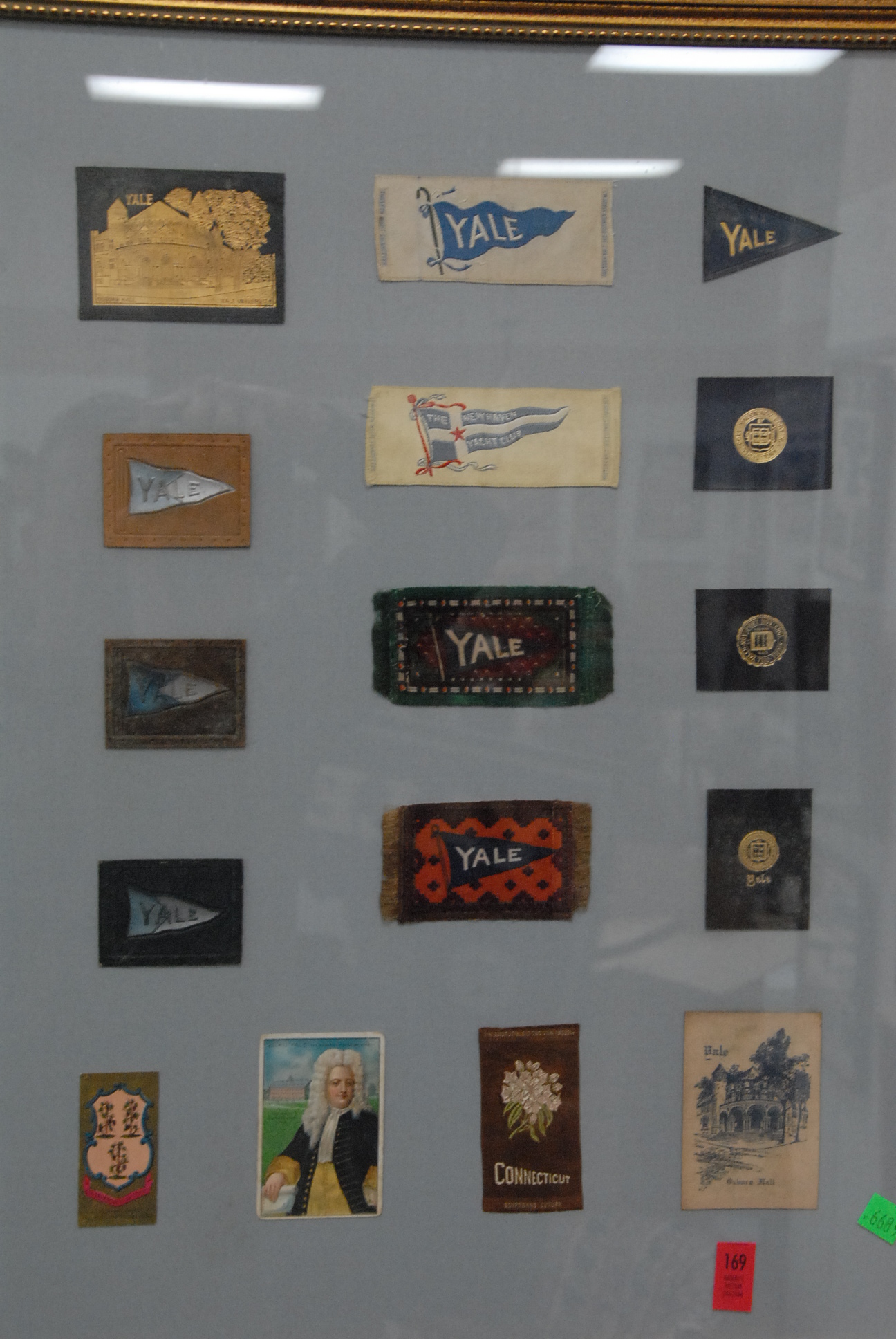 Collection of 16 tobacco silks and leathers 1900-1920 including two rare depictions of Osborne Hall, a portrait card of Elihu Yale, and New Haven Yacht Club banner, framed, 25 1/2 x 20.