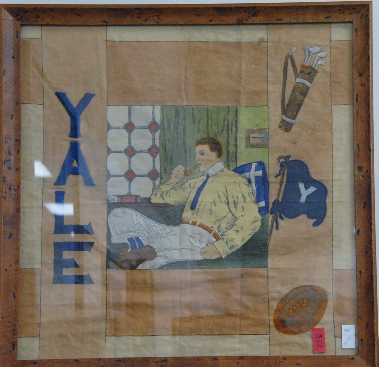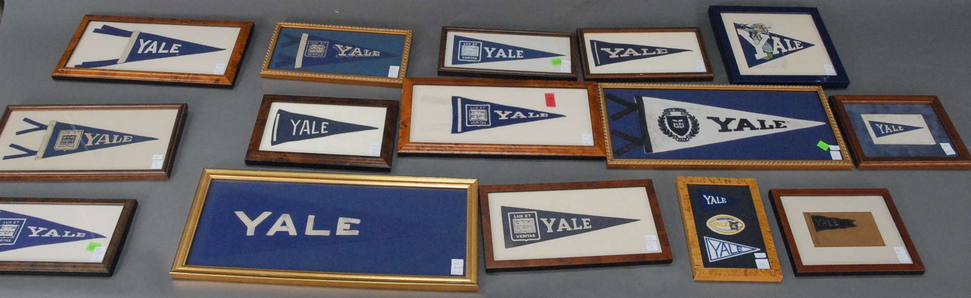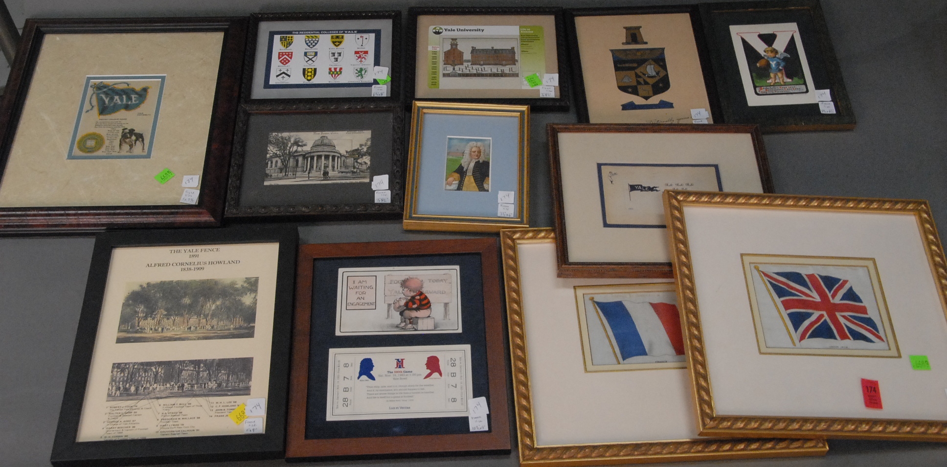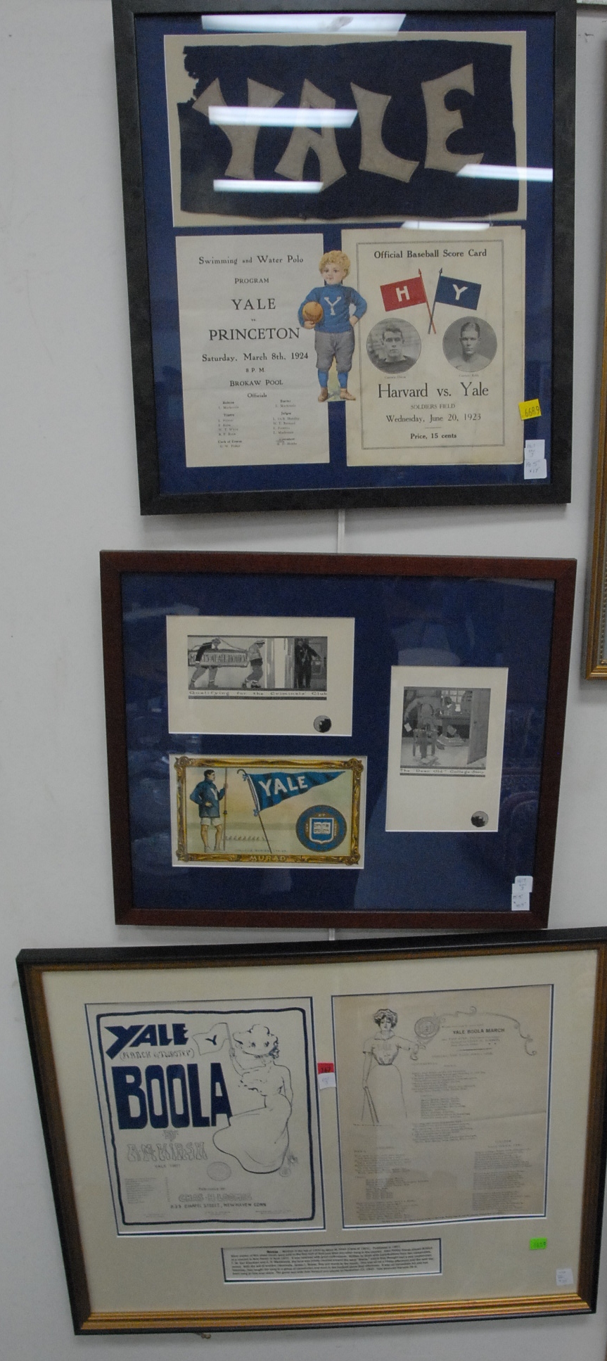 Three piece framed lot first piece is two dry point prints of mischievous Yale students by Blumenthal 1906 and large murad tobacco card depicting Yale Rowing circa 1910, second item is Yale Boola Boola original sheet music circa 1901, and the third is a framed collection of Yale memorabilia to include Yale Enameling advertising Paper Doll 1890, Yale pennant or arm band with stylized hand sewn vintage lettering on felt possibly student work 1895-1905, two Yale programs Harvard vs. Yale baseball 1923 and Yale vs. Princeton swimming and water polo 1924, frame sizes: 18 1/2 x 17, 15 1/2 x 18 1/2 & 26 x 21.