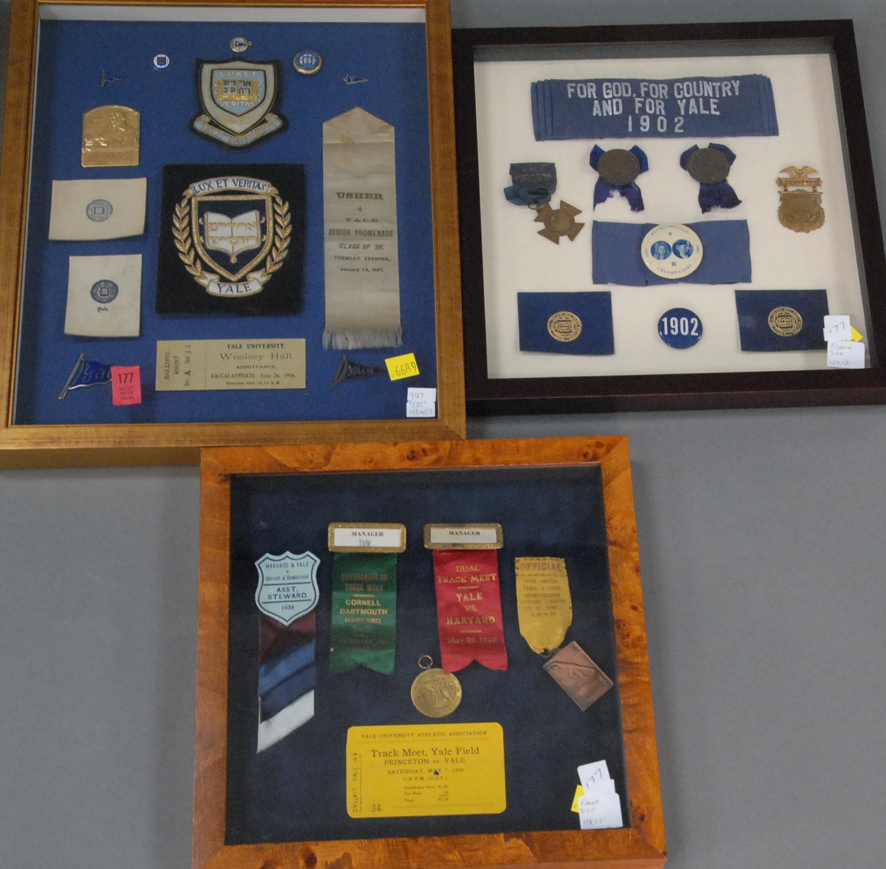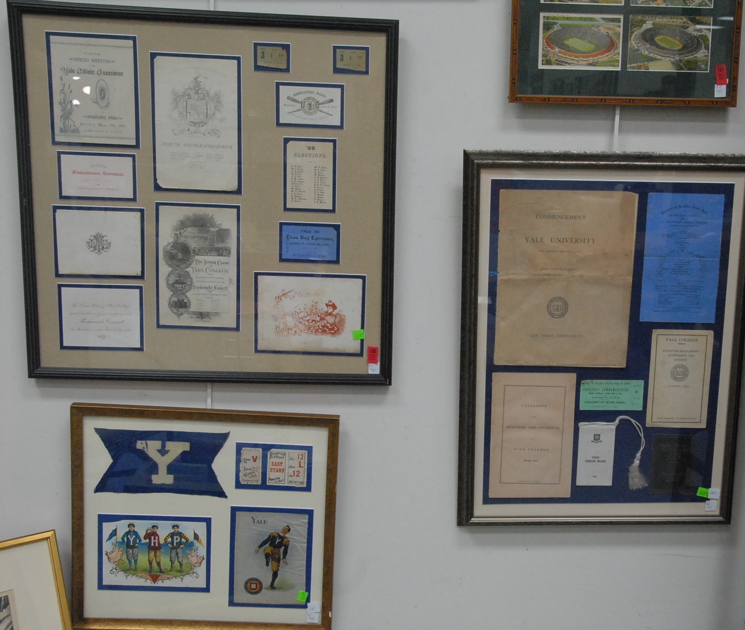 Four piece lot of framed collections ephemera, pledges, Rowing Club tickets, tickets, invitations, Class Day folder and ticket, baseball tickets, commencement program 1906, Class Day program, dance card 1935, Yale football ticket stubs for Harvard at Yale 1894 and Princeton at Yale 1899, cigar box label, Yale football, and Whiffenpoof Song 23 x 34.