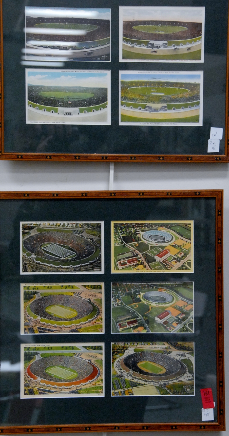 Two piece framed lot six linen and chrome postcards with aerial views of the Yale Bowl 1920-1950 and four color linen postcard views of the Yale Bowl 1915-1930, size of frames: 12 x 16 & 15 1/2 x 15.