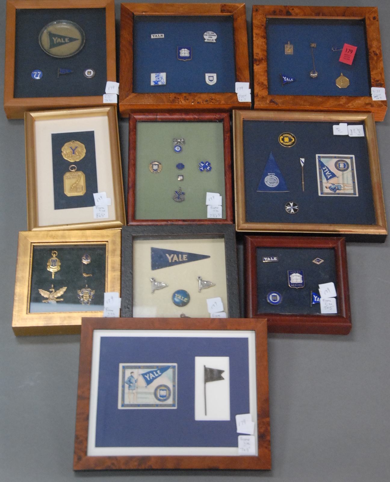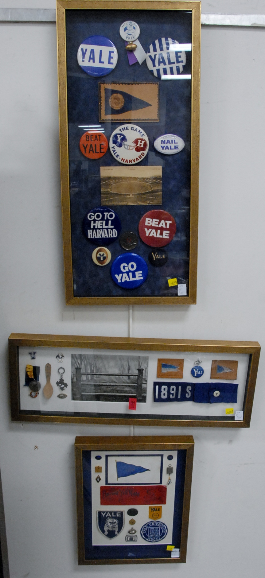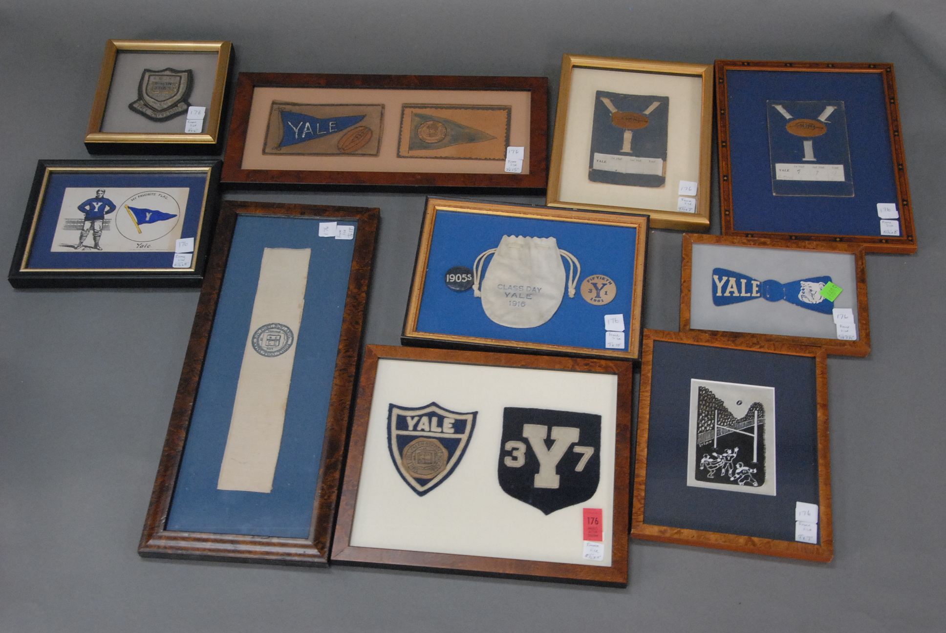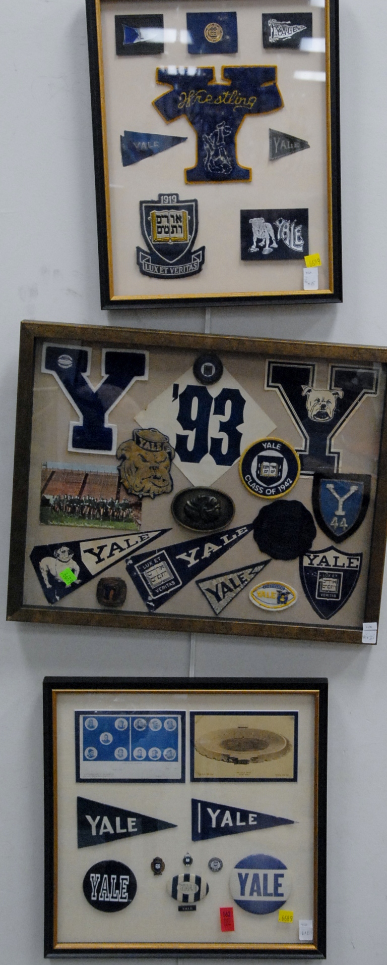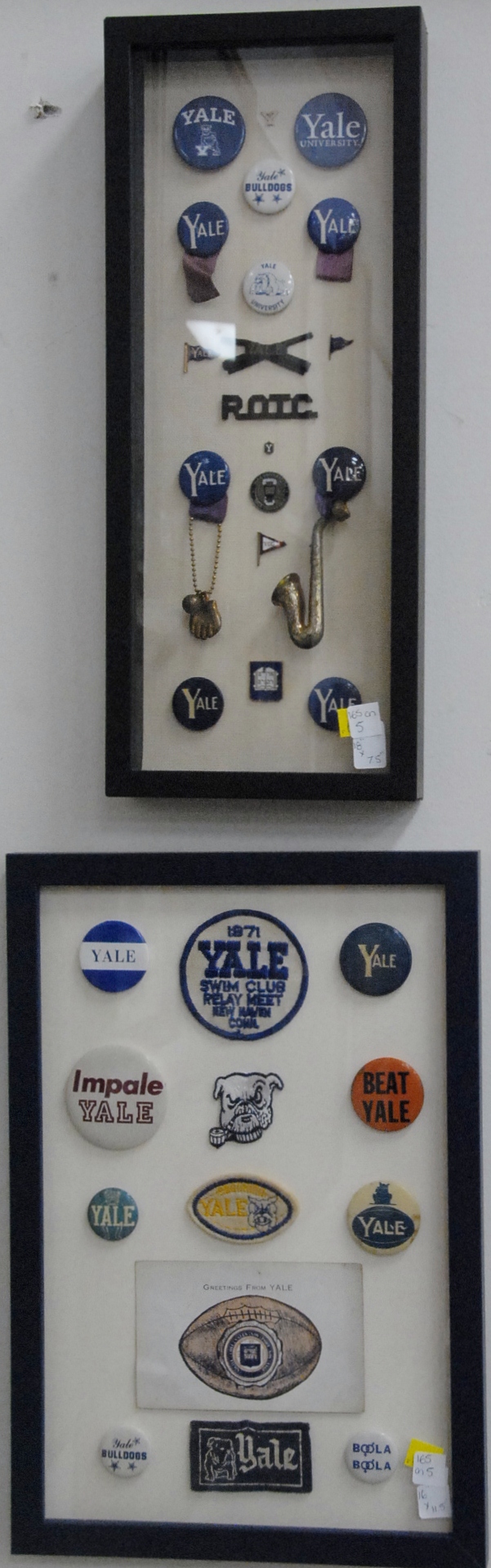 Five piece lot to include framed collections of Yale memorabilia Yale Secret Society Illustrations circa 1890, post card, tobacco felt, tobacco leathers, patches 1940-1950’s, pin backs, patches, advertisements, pins, lapel pins and badges, frame size: 18 x 7 1/2, 16 x 11 1/2, 21 x 17, 16 x 10 1/2 & 16 x 10.