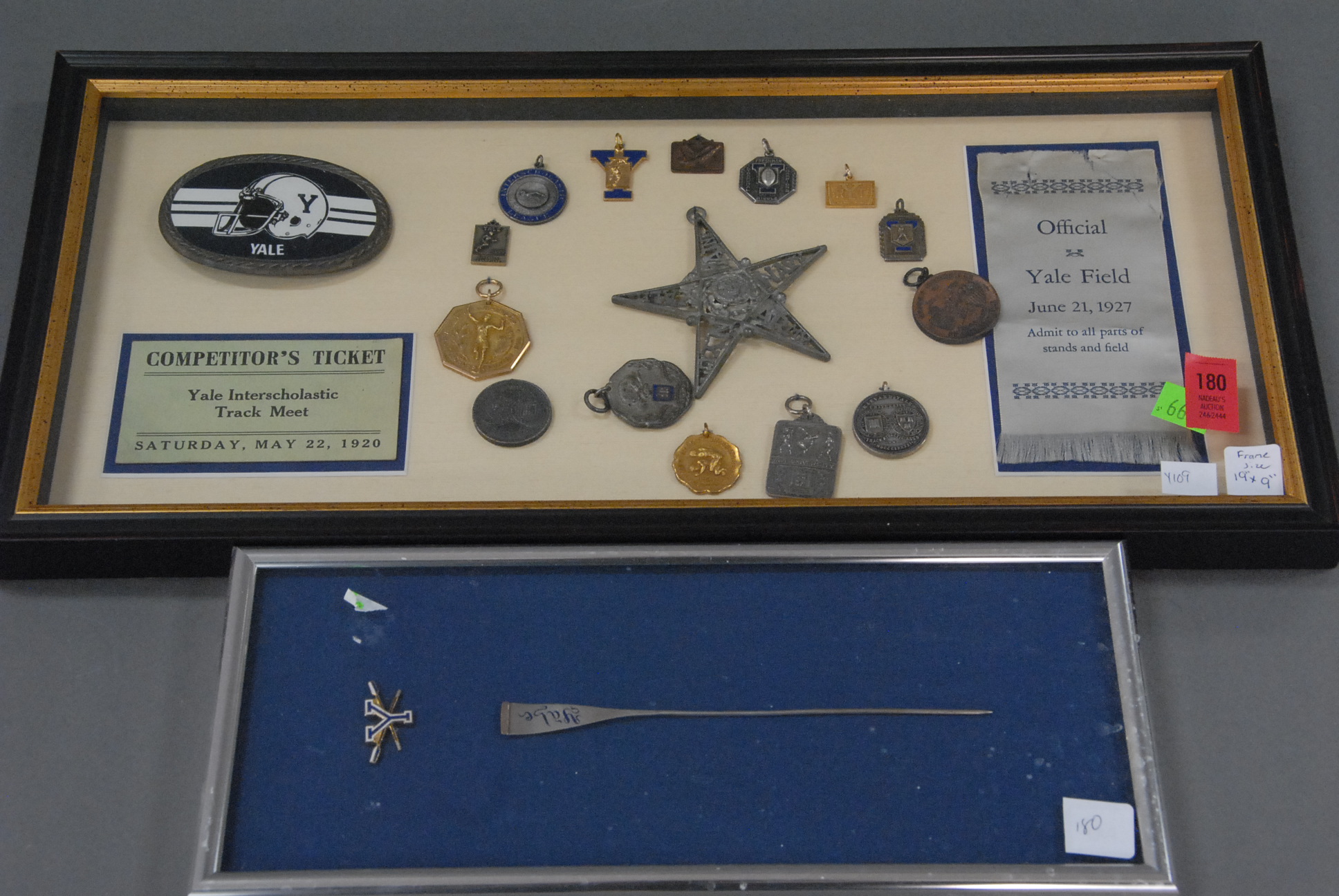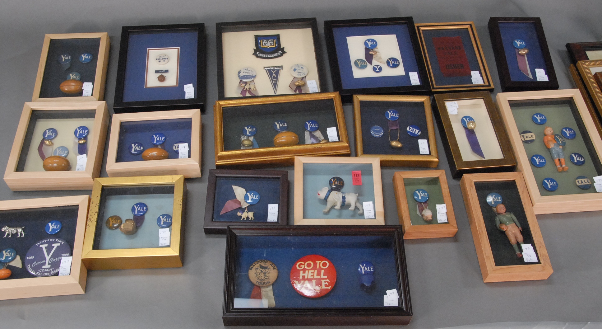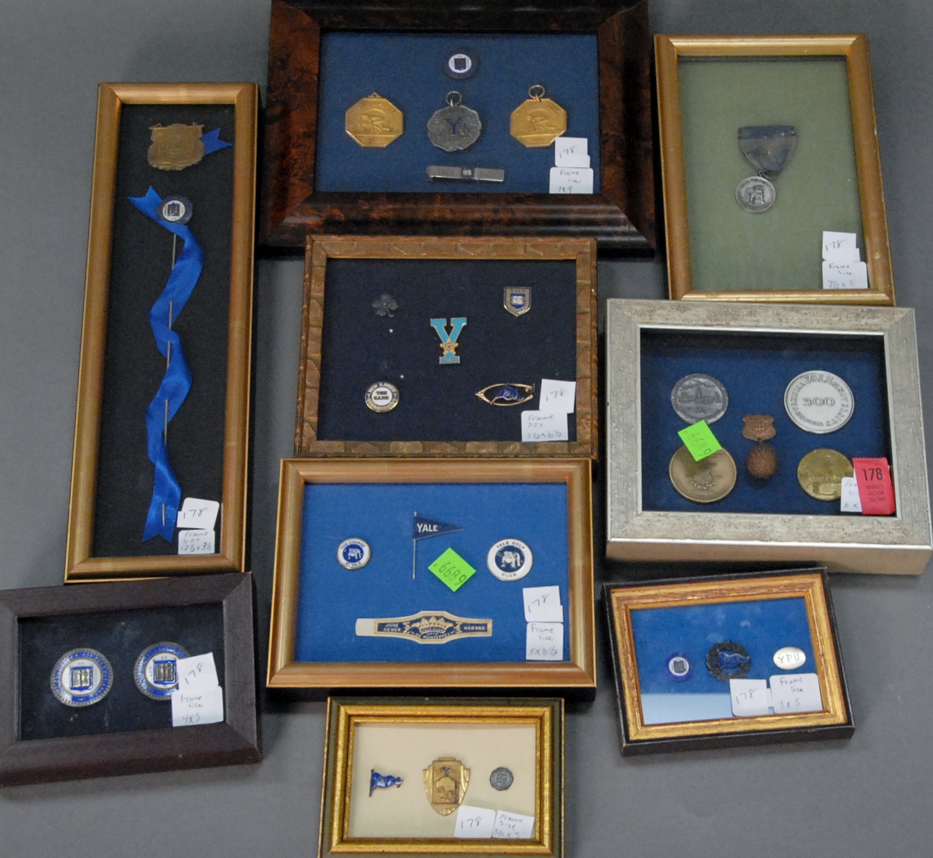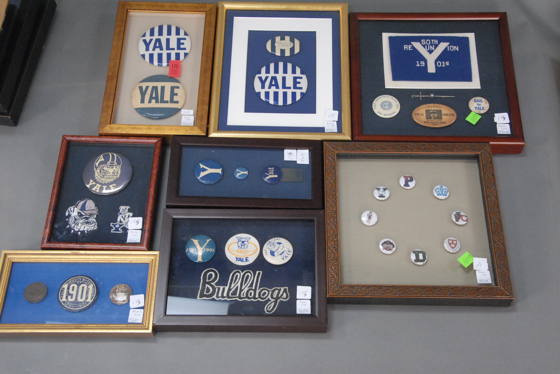 Five piece lot to include framed collections of Yale memorabilia Yale Secret Society Illustrations circa 1890, post card, tobacco felt, tobacco leathers, patches 1940-1950’s, pin backs, patches, advertisements, pins, lapel pins and badges, frame size: 18 x 7 1/2, 16 x 11 1/2, 21 x 17, 16 x 10 1/2 & 16 x 10.