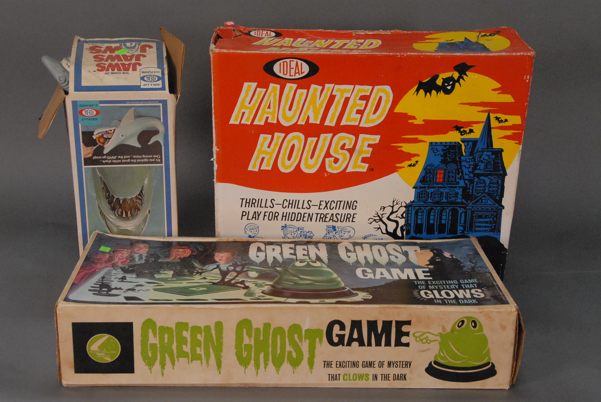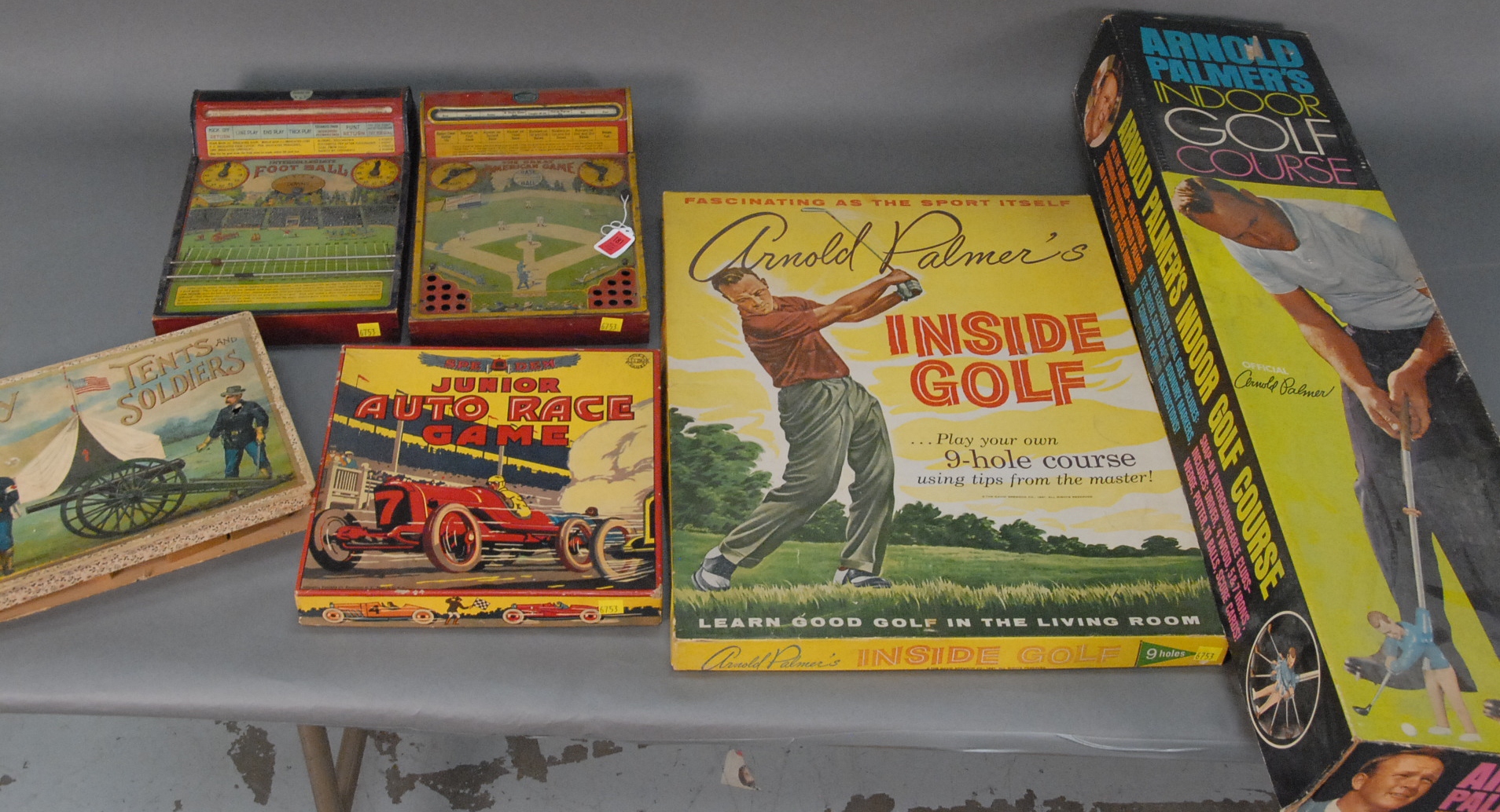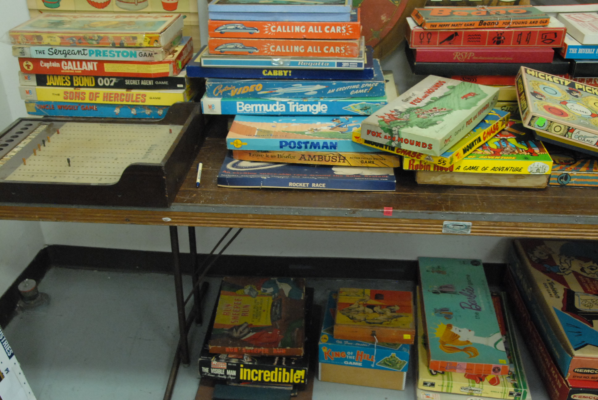 Fifty-seven various games in boxes Old Maid, Monopoly Elvis Edition, Chutes and Ladders, vintage Table Crochet, Barney Google and Spark Plug, Aviation, Calling All Cars, Scavenger Hunt, Spin It, early to late 20th century.