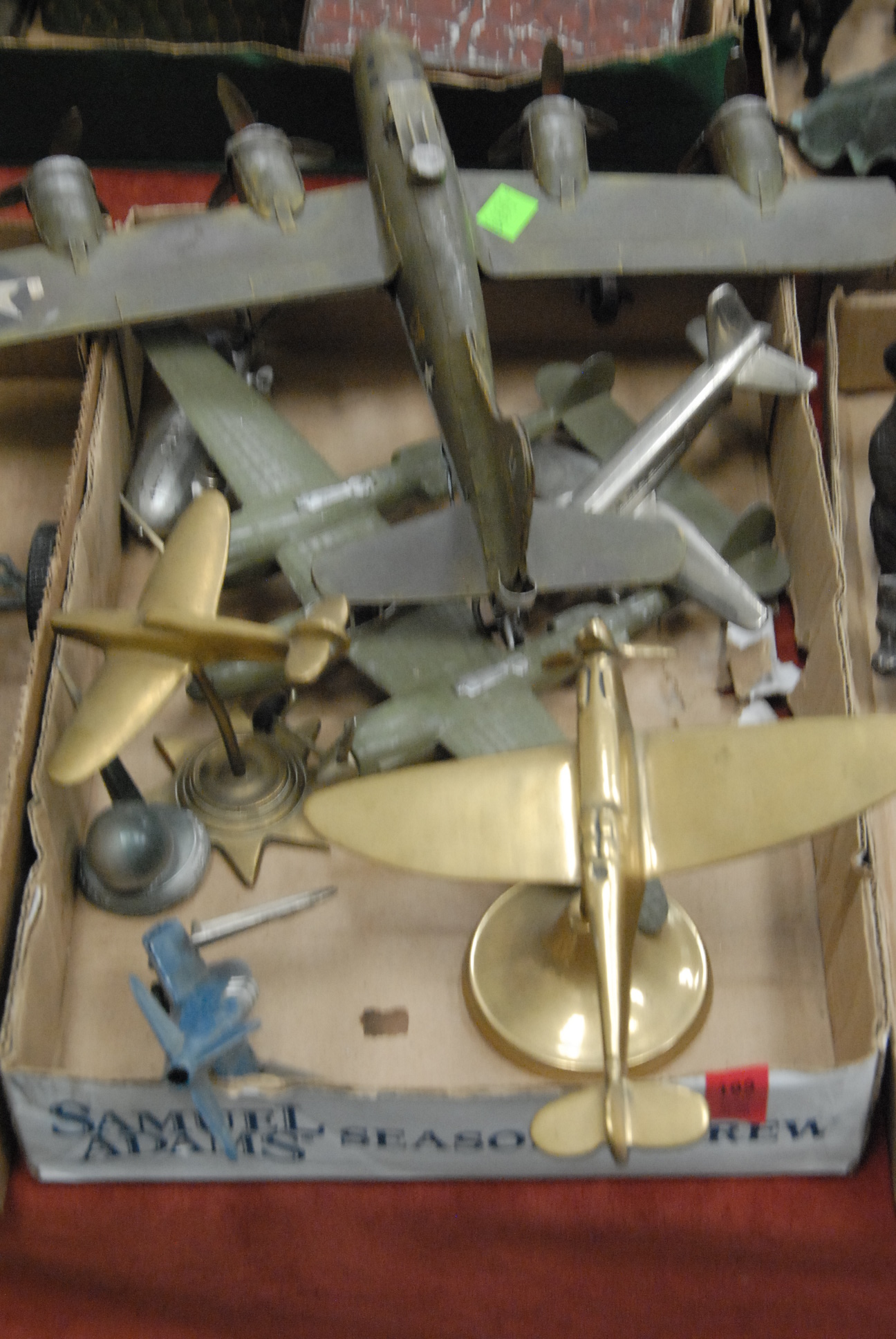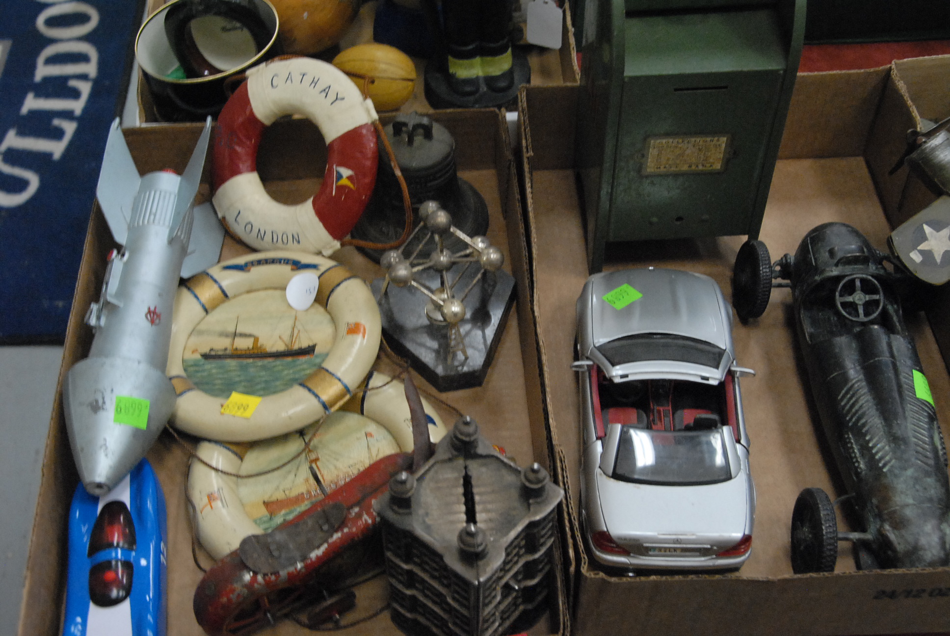 Four box lots Planters Peanut iron still safe, mailbox safe, bronze car, building still safe, wind up motor cycle, toy rocket ship and car, pair of chair bookends, pair of ash trays, pair of late 20th century globes, five tins, and miscellaneous.