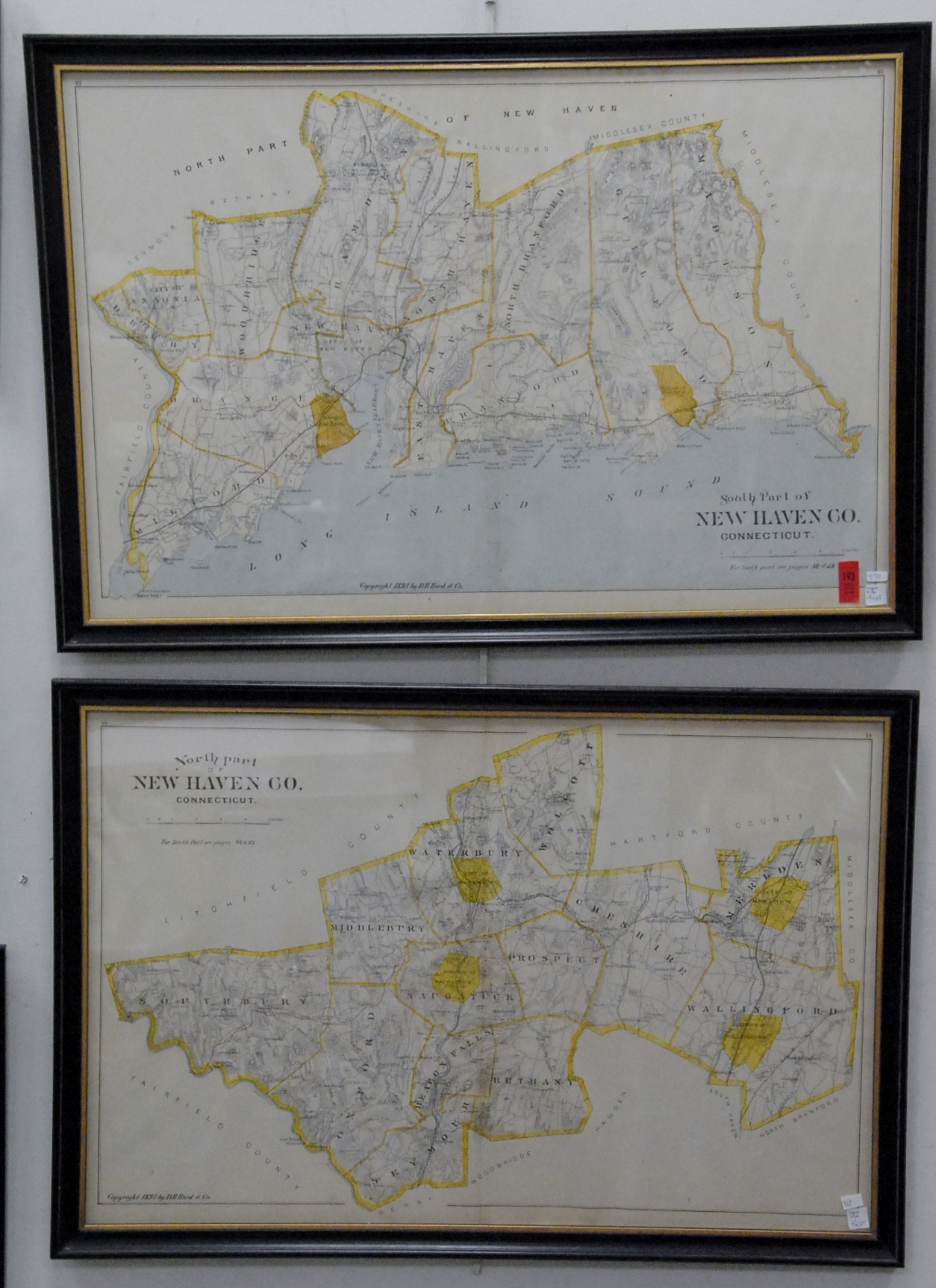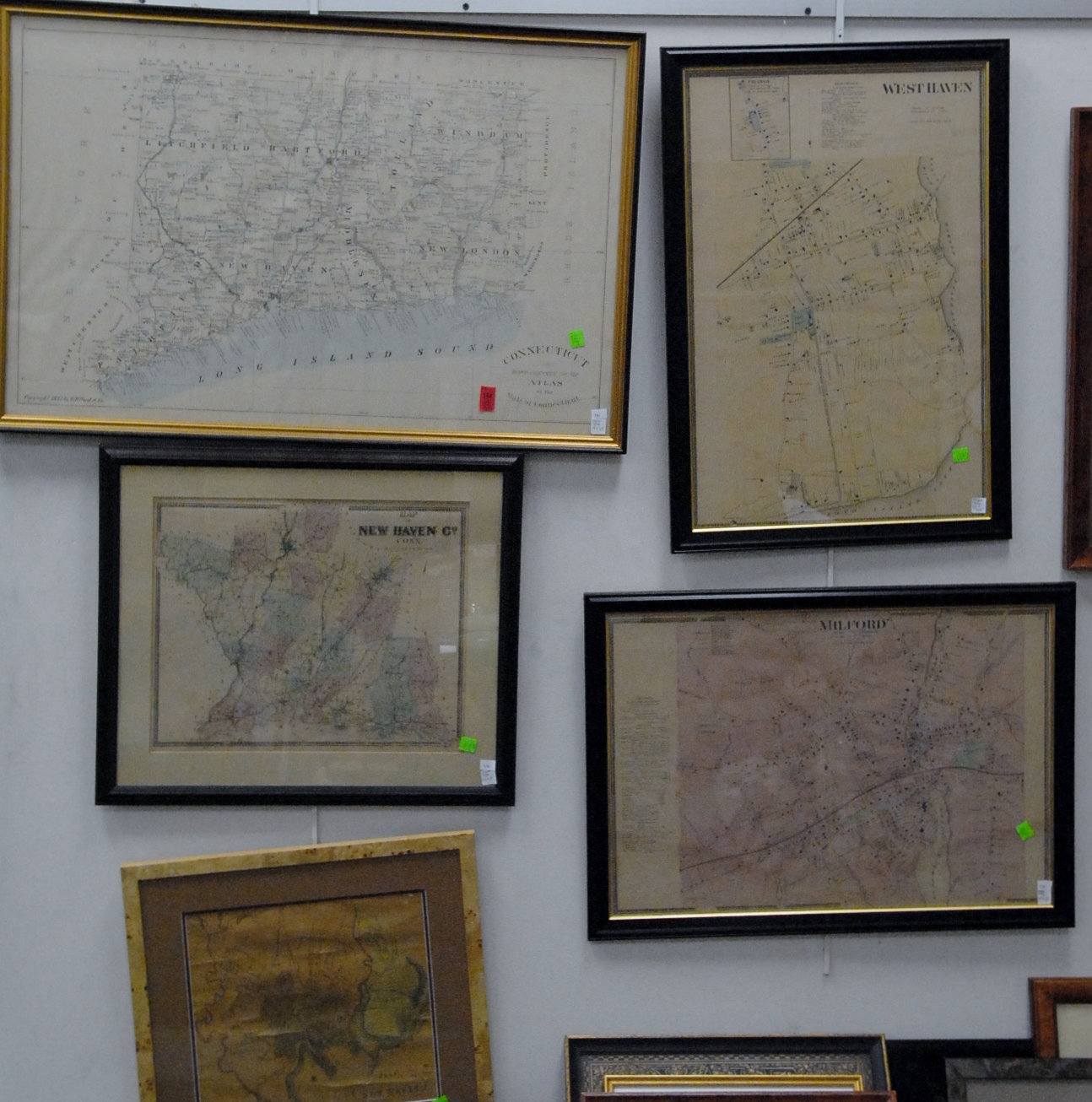 Five framed maps Town Of West Haven Beers 1867, fragment of 1851 wall map City Of New Haven, Town Of New Haven Ward Map Beers 1867, New Haven County Connecticut Beers 1867, and Town Of Milford Beers 1867, 19 x 29, 12 x 15, 15 x 22, 10 1/2 x 11 1/2 & 22 1/2 x 15.