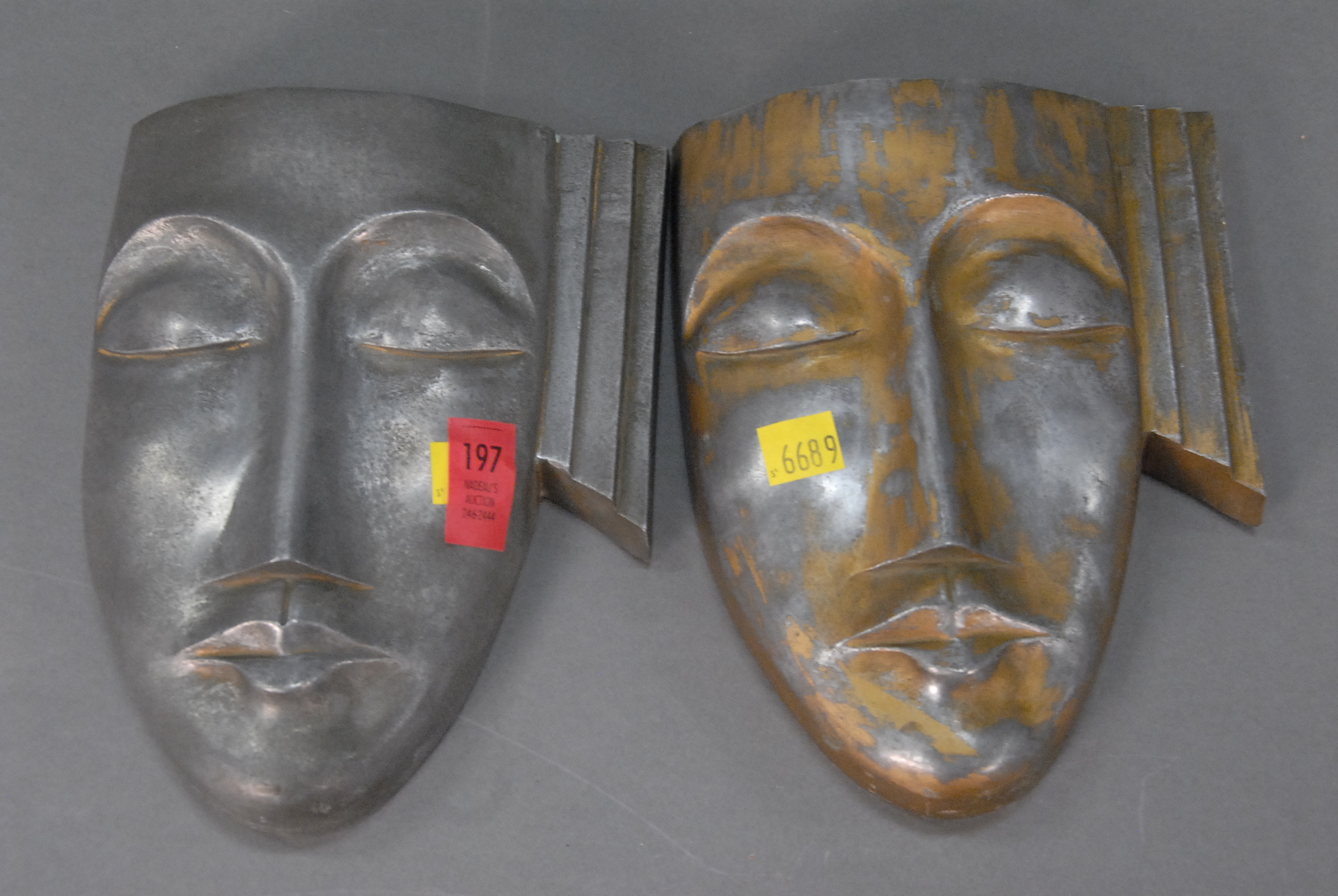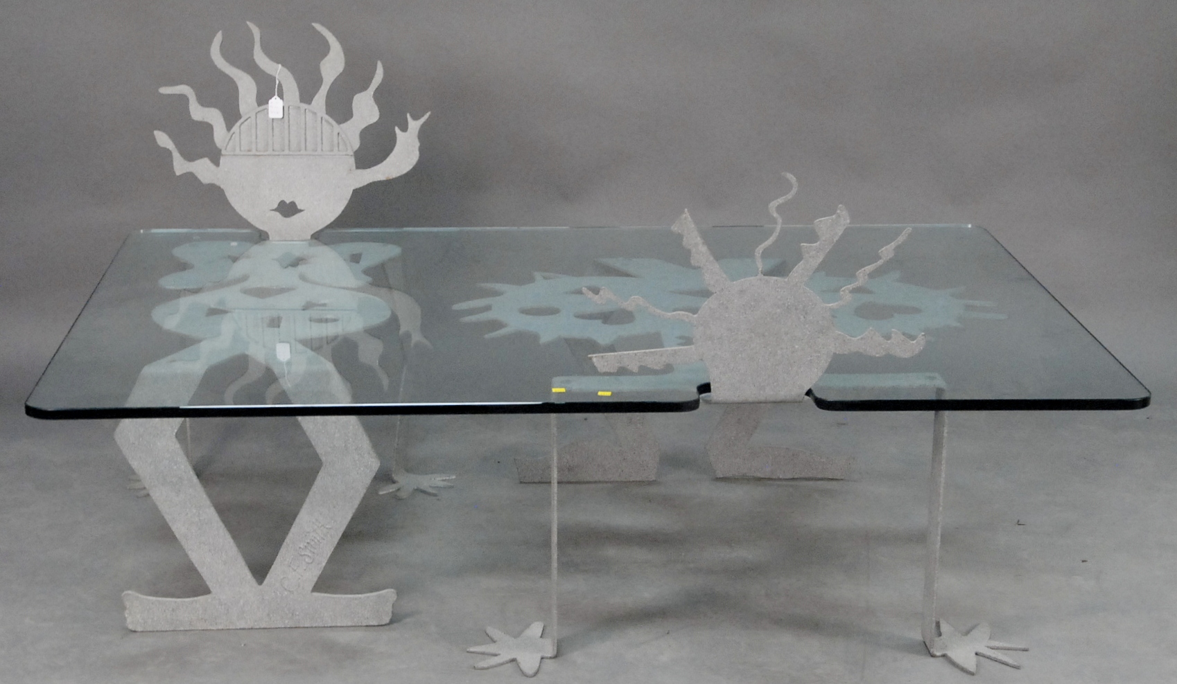 Cheryl Farber Smith fanciful coffee table of flat formed steel consisting of two separate bases of stylized women supporting a single, thick glass top. Signed, circa 2001, ht. 19, top: 50 x 70, ht. of heads 36.