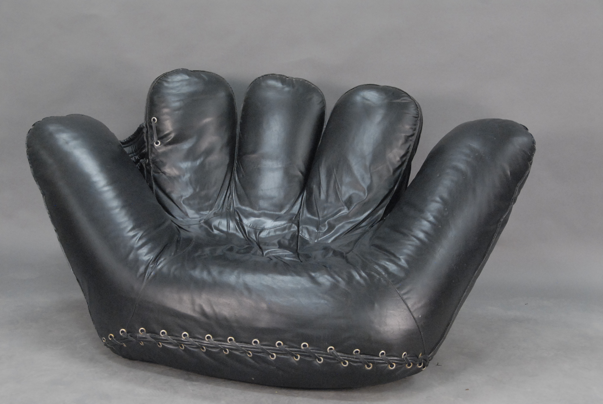 De Pas D’Urbino & Lomazzi Joe lounge chair in the shape of a baseball glove, black leather having embossed signatures and Joe Made in Italy, ht. 36 x lg. 76.