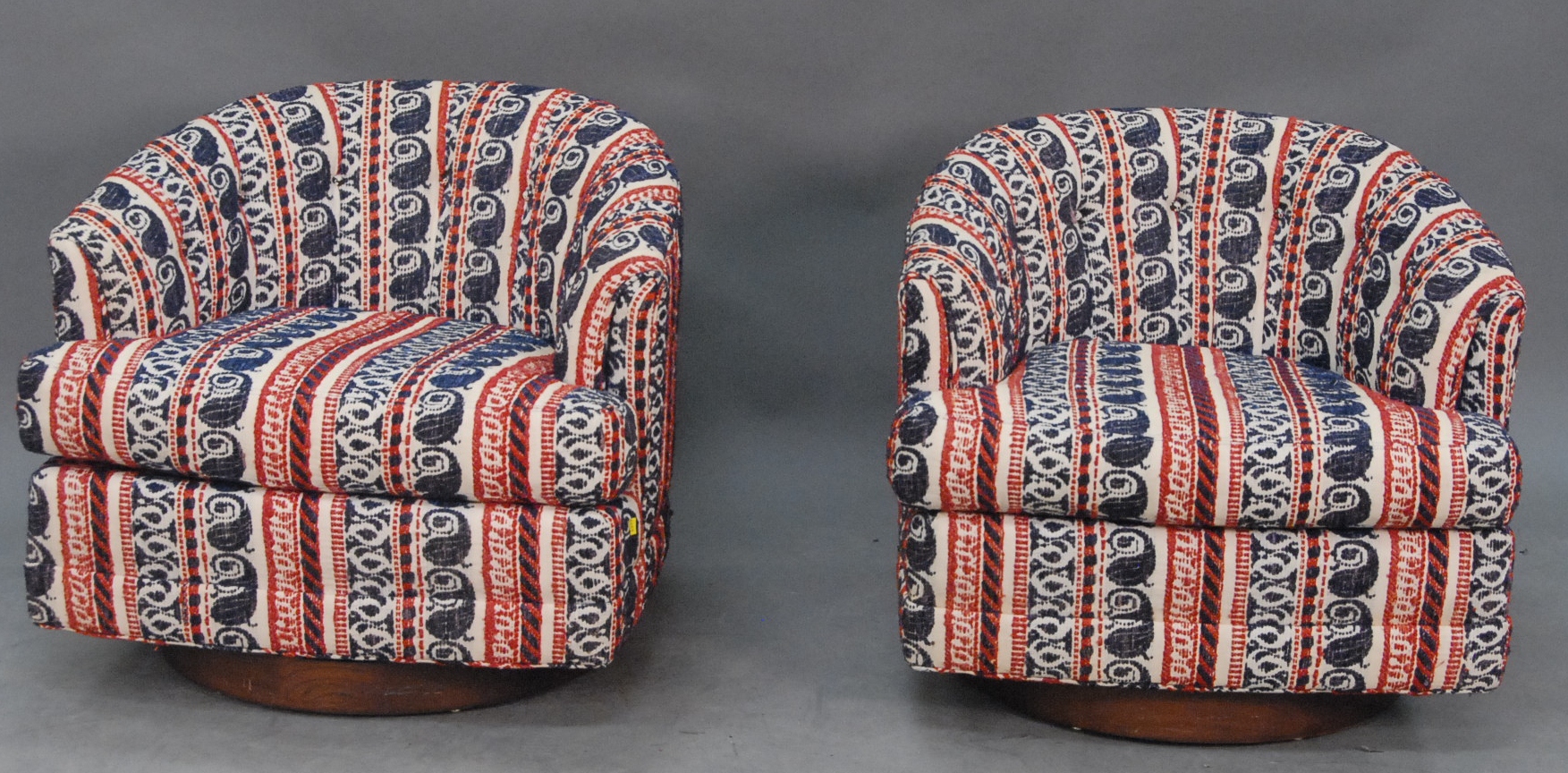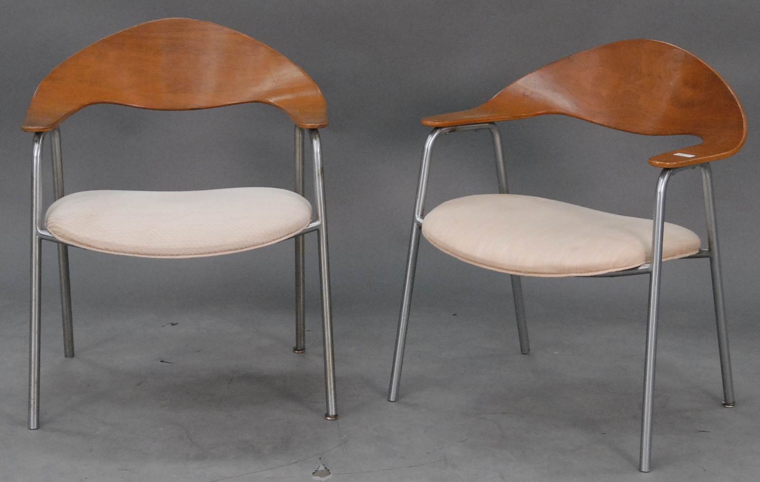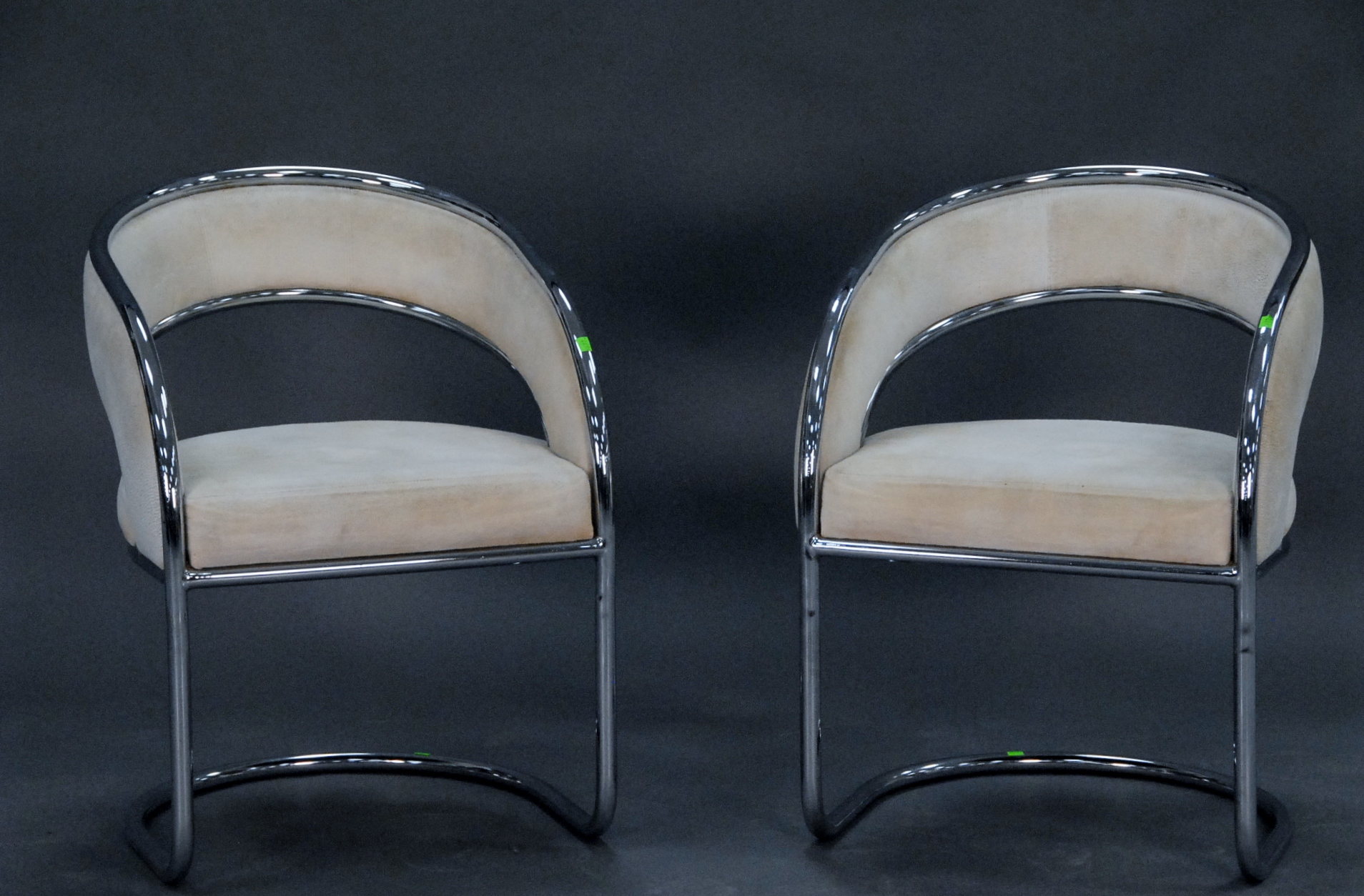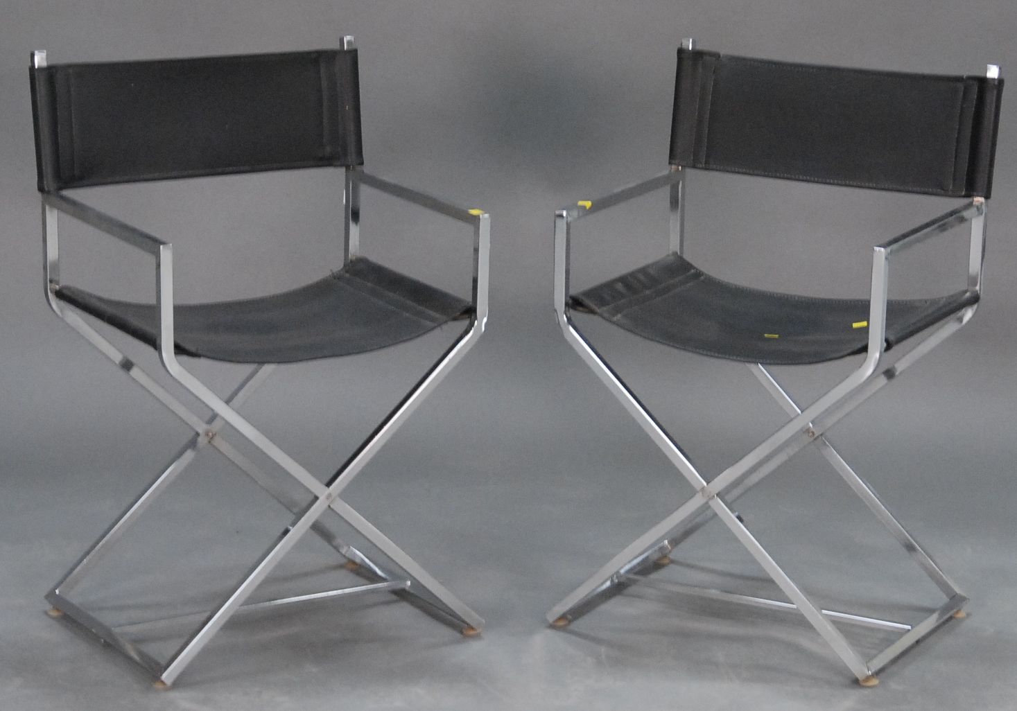 Pair of Director style arm chairs by Virtue of California made of square, tubular chrome forming an X which supports black vinyl sling seat & back, circa 1975.
