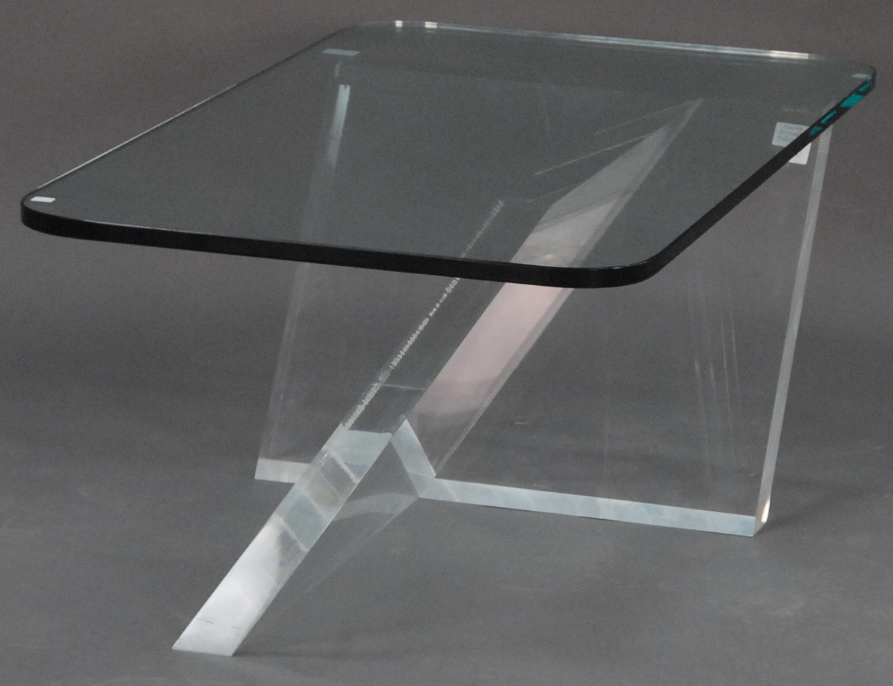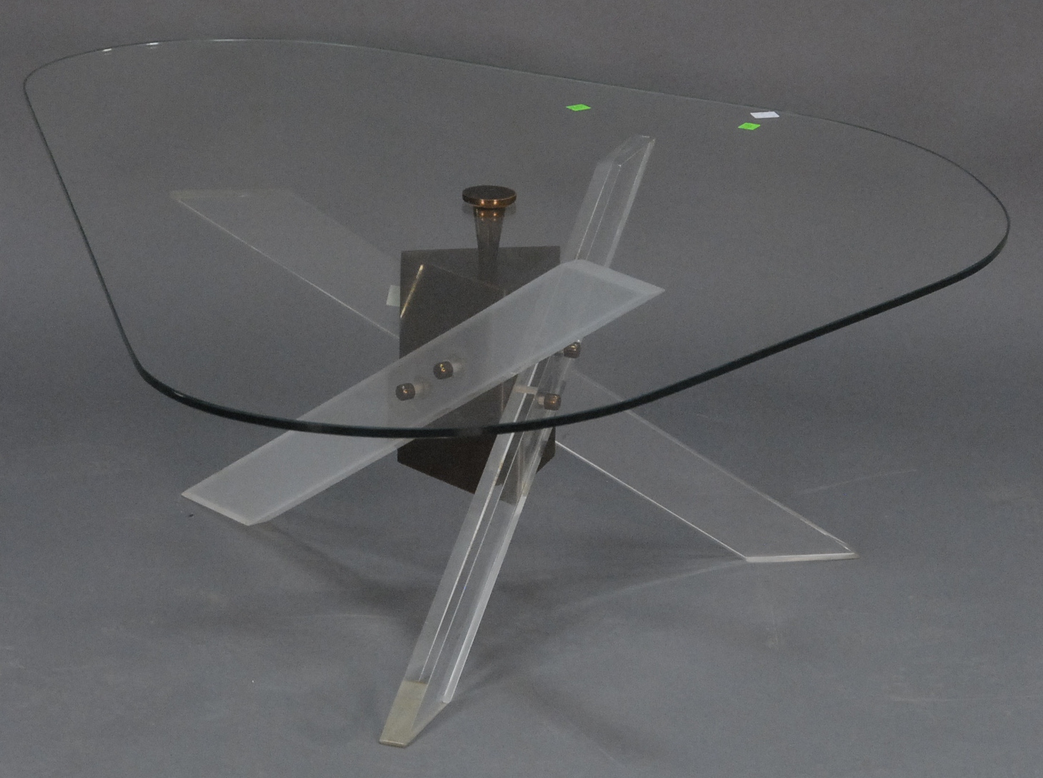 Lucite, brass, and glass coffee table attributed to Ben Karpen of NY having a base configured of three angled pieces of lucite joined by a central brass connector, circa 1975, ht. 15, top: 34 x 50.