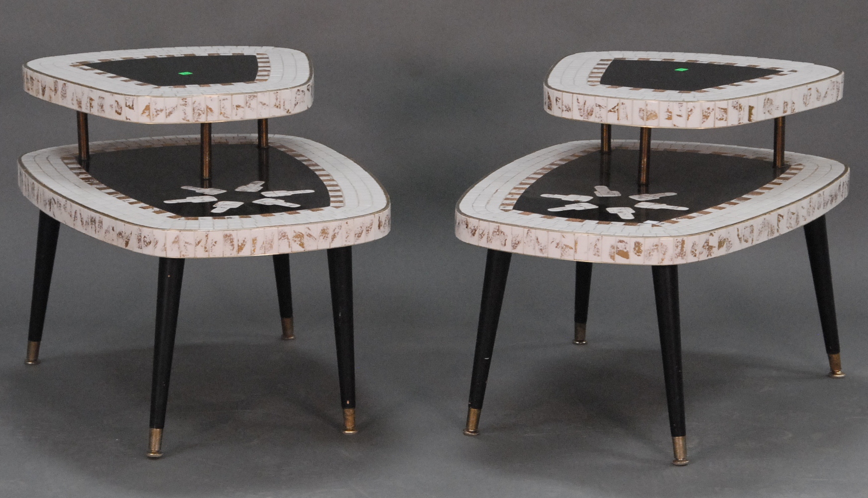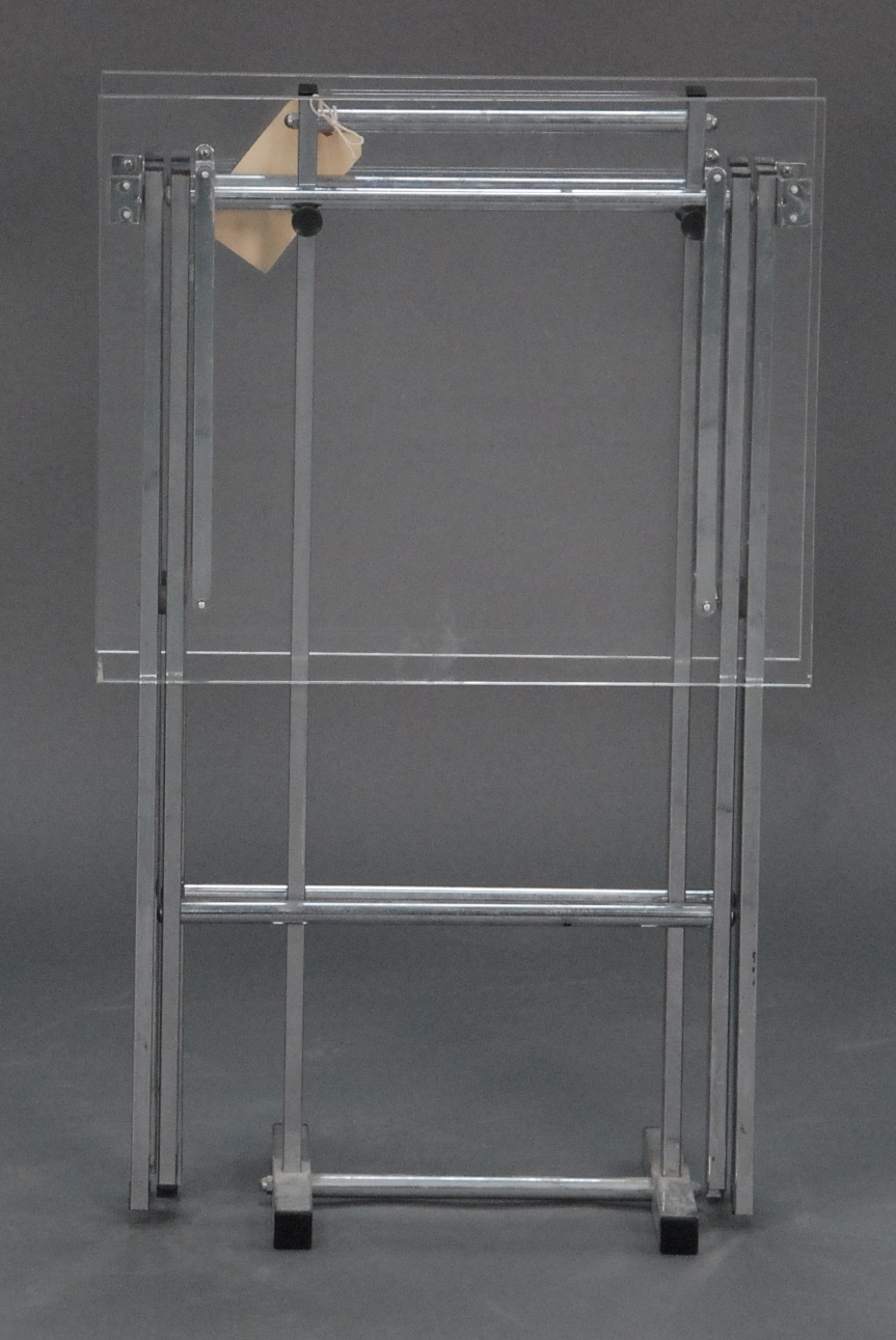 Pair of Lucite & chrome folding accessory tables in the manner of Charles Hollis Jones together with their matching storage stand for hanging upright when not in use.