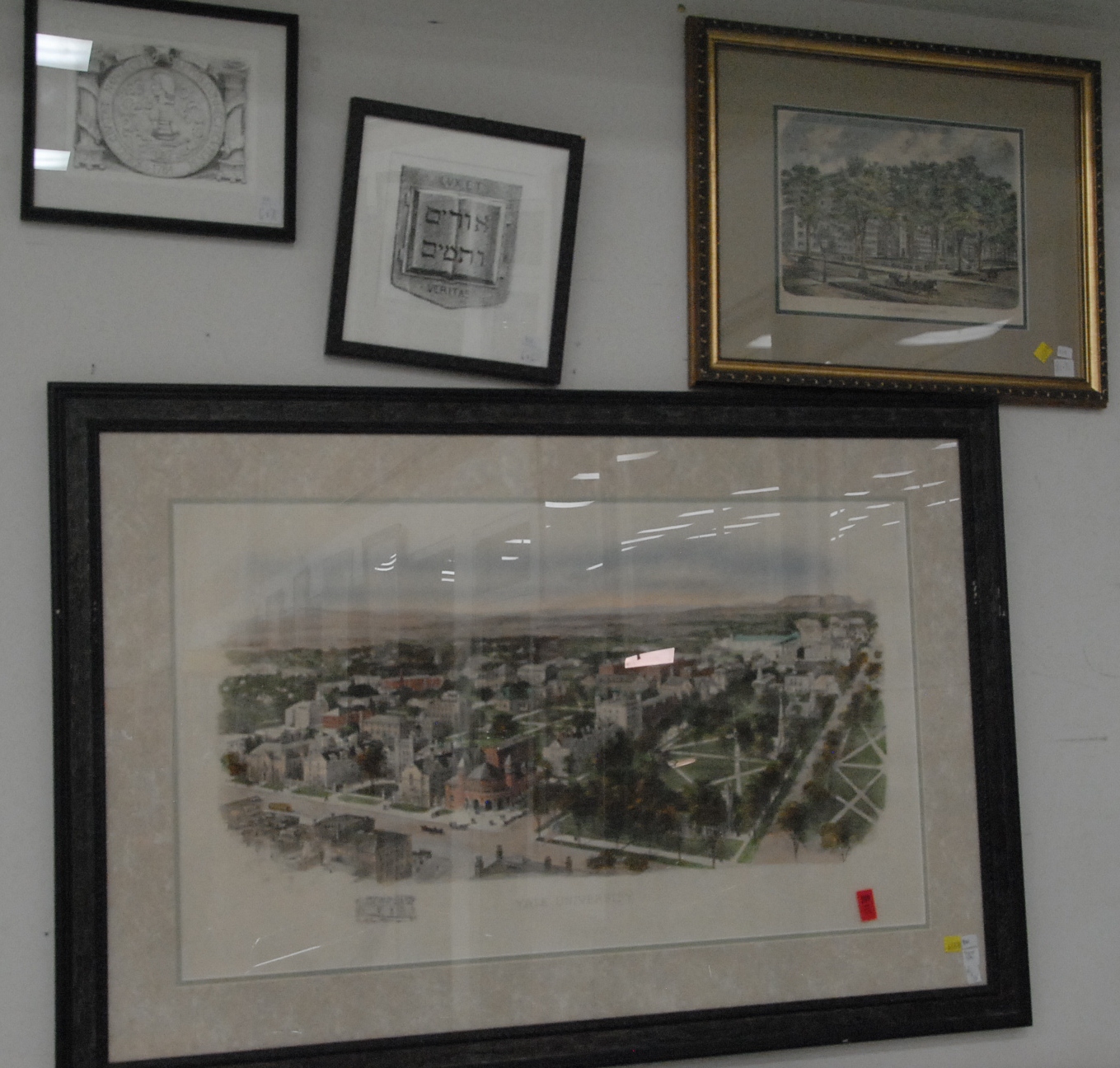 Four piece lot Yale University seal signed Colonna from ‘Yale A Portrait’, New Haven City seal signed Colonna from ‘Yale A Portrait’, birdseye view of Yale University signed in plate Rummel/Littig 1906, Yale College New Haven Connecticut The Old Brick Row with later hand coloring Harpers Weekly circa 1860, 8 1/2 x 9 1/2, 6 x 6, 6 x 7 1/2 & 18 x 31.