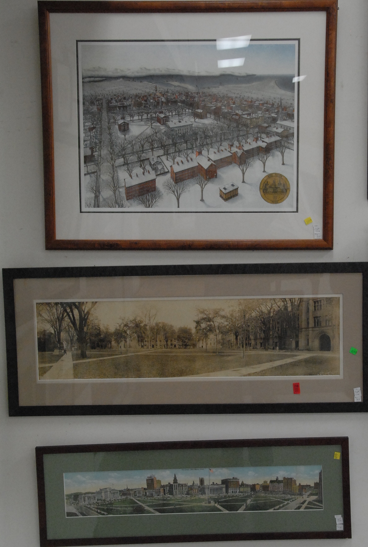 Three framed pieces panoramic view of The New Haven Green 1919, original panoramic photo of The Old Campus dated 1909 and The Brick Row and New Haven around 1860, 19 x 24 1/2, 9 x 34 1/2 & 5 x 30.