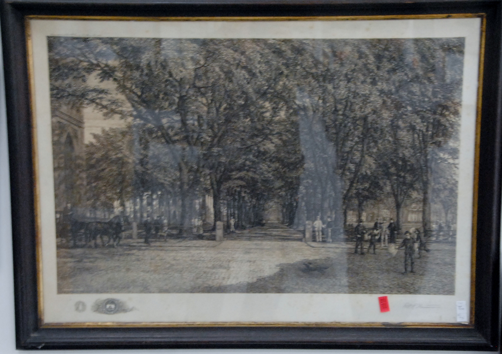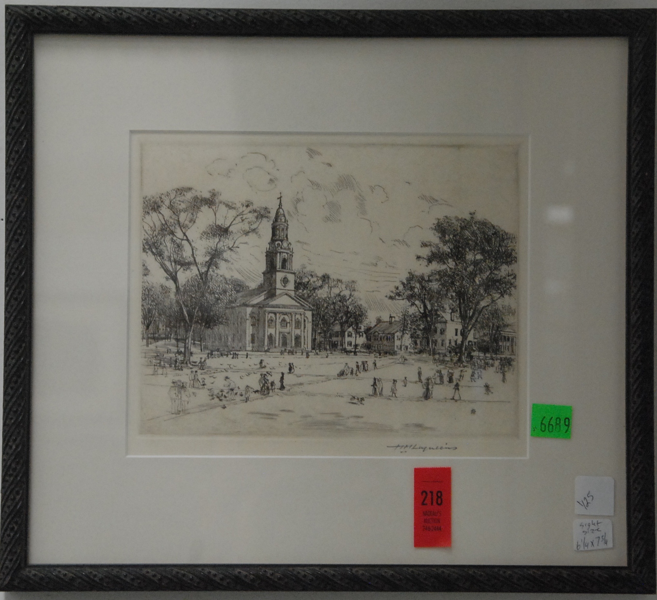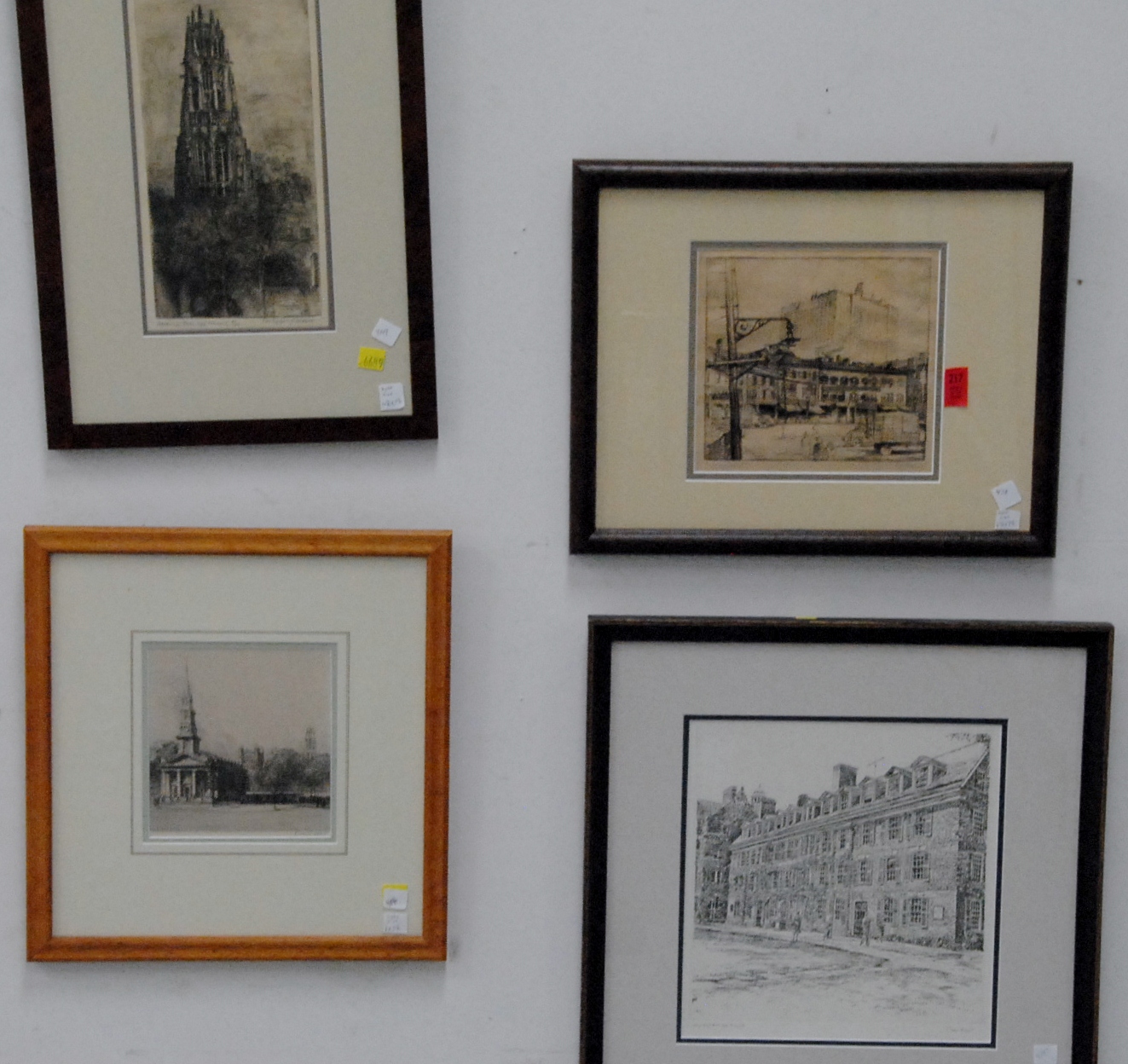 Group of four framed pieces lithograph pencil signed Old Broadway, etching pencil signed Orr 1928 of Center Church, etching of Batell Chapel Yale pencil signed Wiseman 1908, and New Haven Ems circa 1872, smallest: 6 x 5 1/2, largest: 10 x 10.