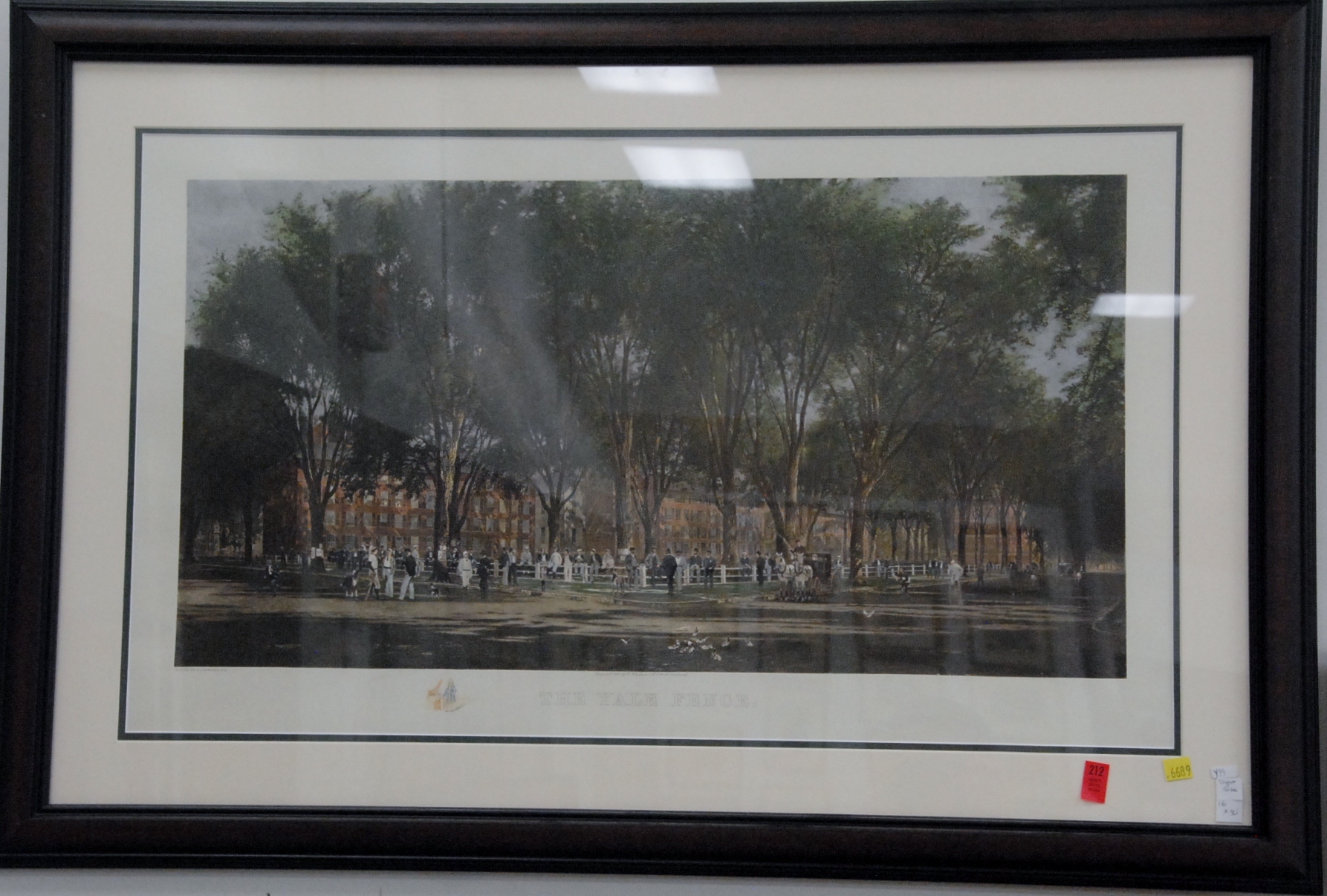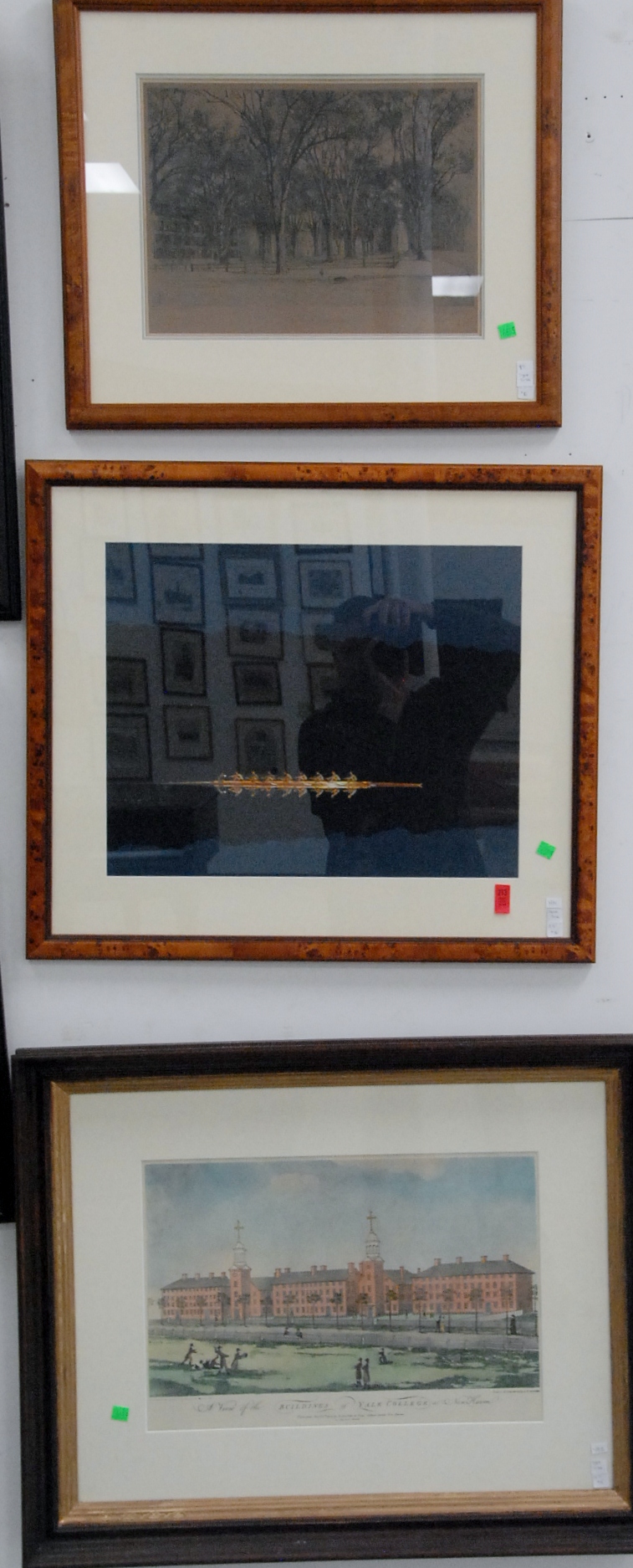 Three framed pieces Yale College 1807, lithograph of Yale rowing signed Andasgg, and etching of Yale Brick Row 1888, 11 1/2 x 16, 15 1/2 x 20 & 12 1/2 x 19.