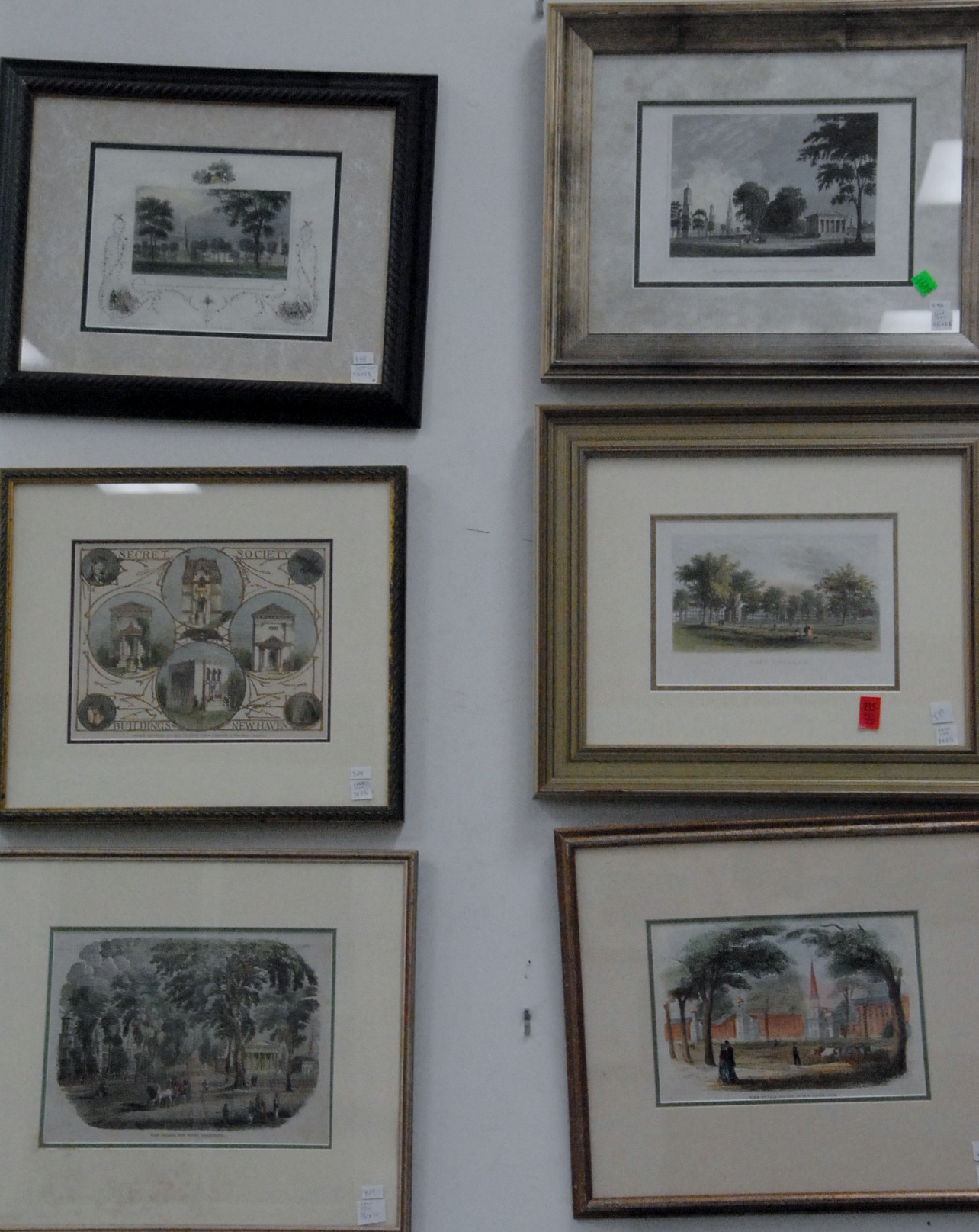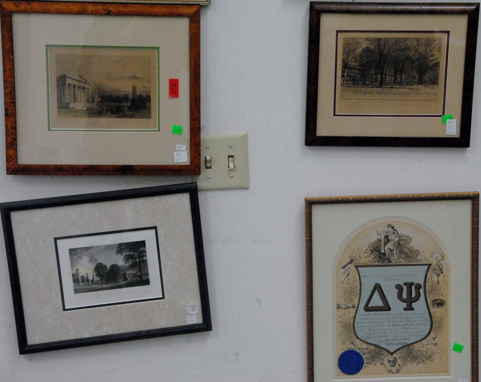 Six framed pieces woodblock of Yale 1850, woodblock of Yale 1853, steel engraving Gothic Church 1838, etching The Brick Row 1890, Yale college hand colored 1834, and Yale Delta Psi Fraternity certificate 1906, smallest: 6 1/2 x 5, largest: 13 x 9.