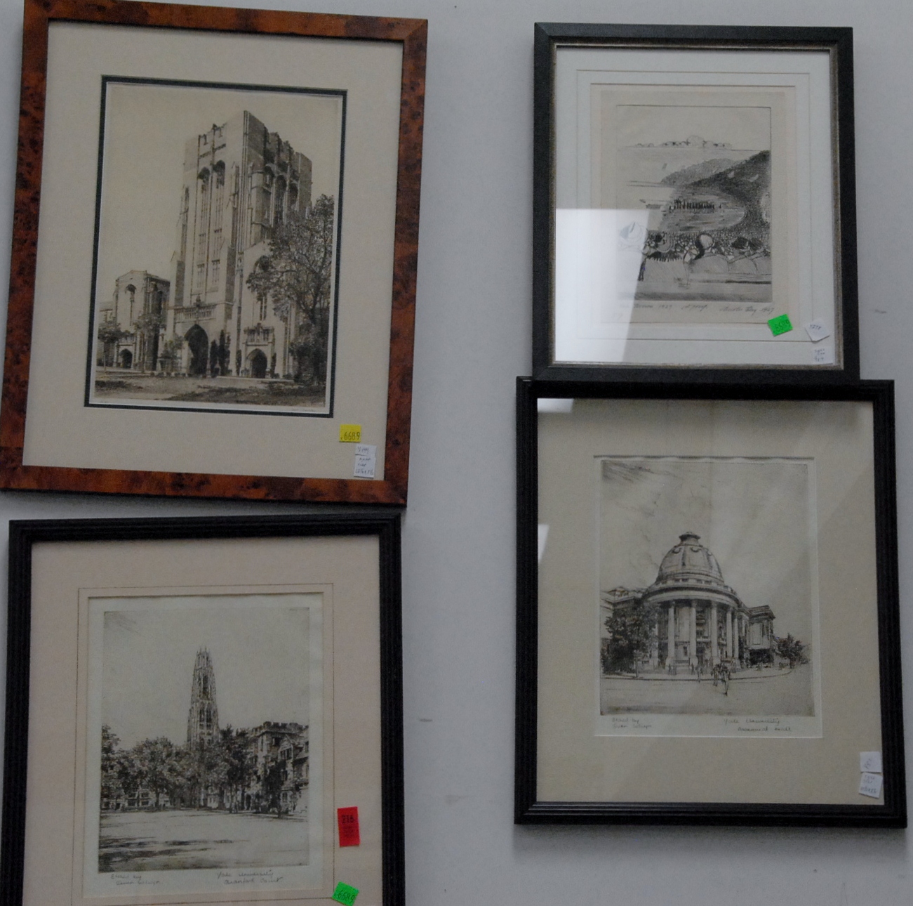 Four framed etchings etching signed Chamberlain 1933-1934, engraving pencil signed Charles Downing Lay of Yale football game, and two pencil signed Owen Selwyn, and smallest: 9 x 7, largest: 12 1/2 x 8 1/2.