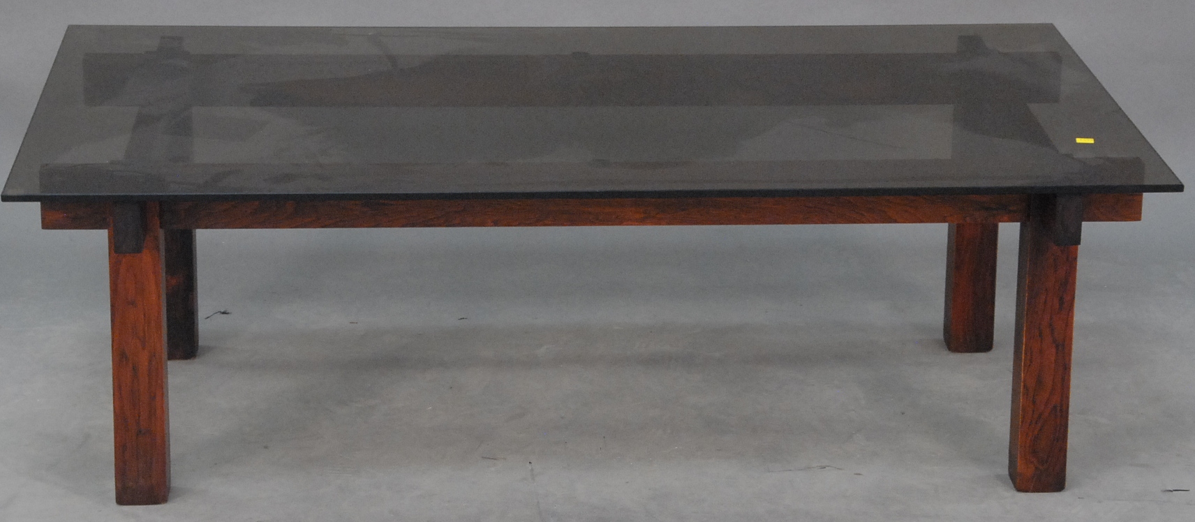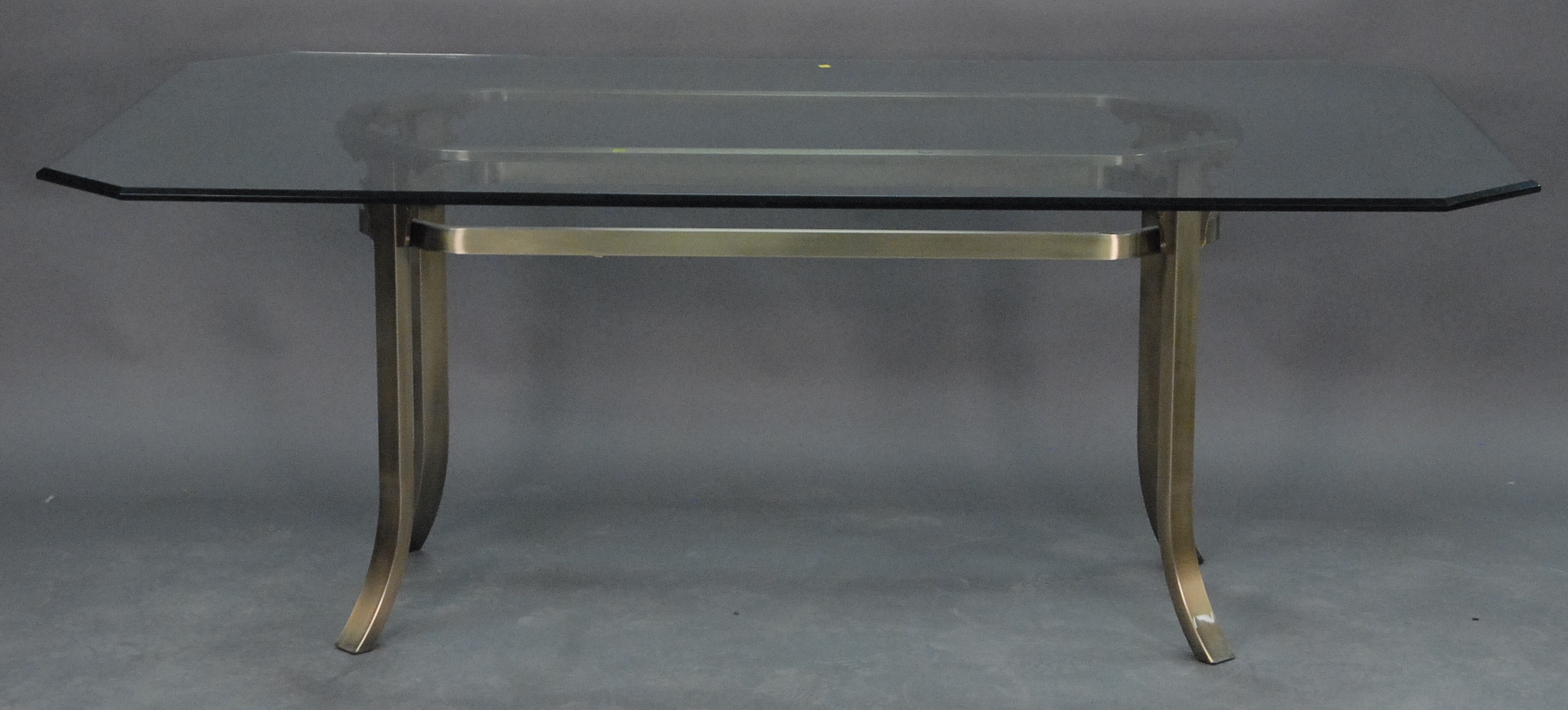 Large dining table in the style of Mastercraft of Grand Rapids having a thick glass top set upon a metal, brass colored base with slight Asian influence, circa 1970/80s, top: 48 x 77.