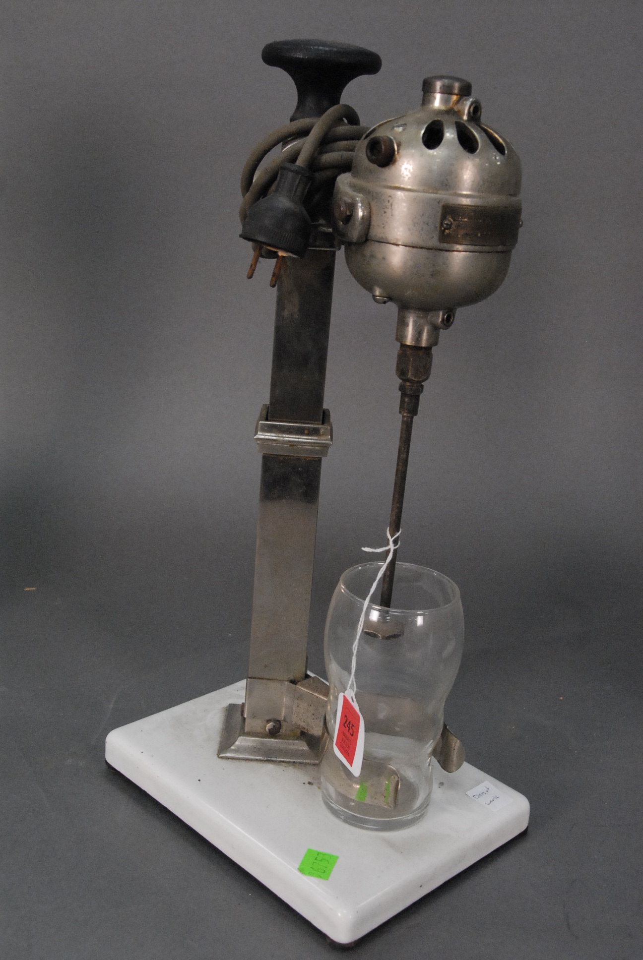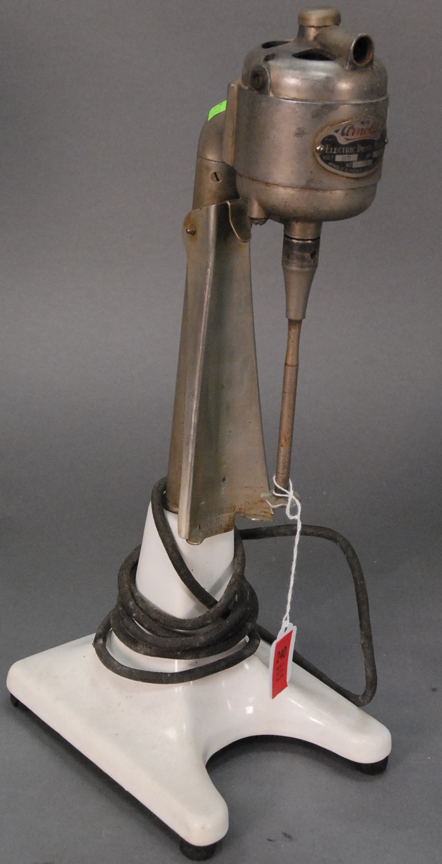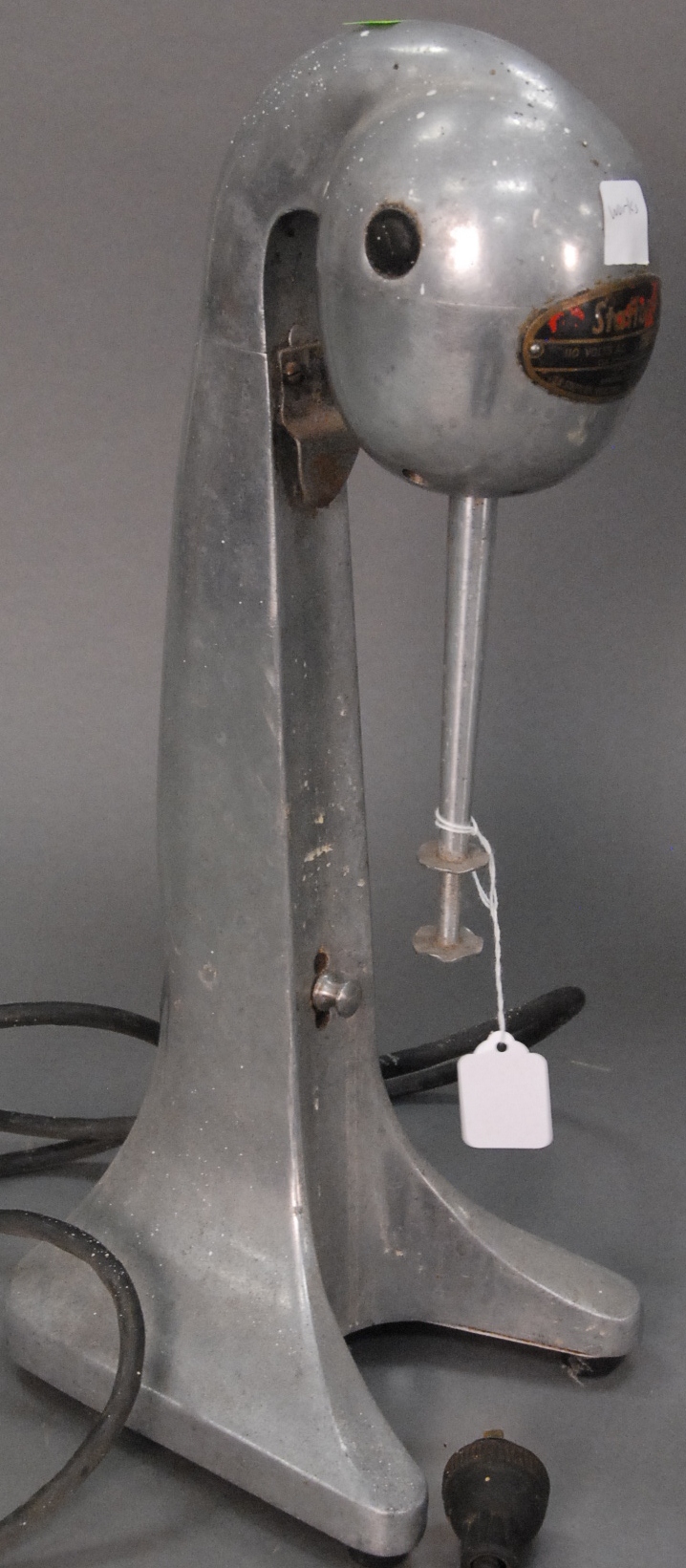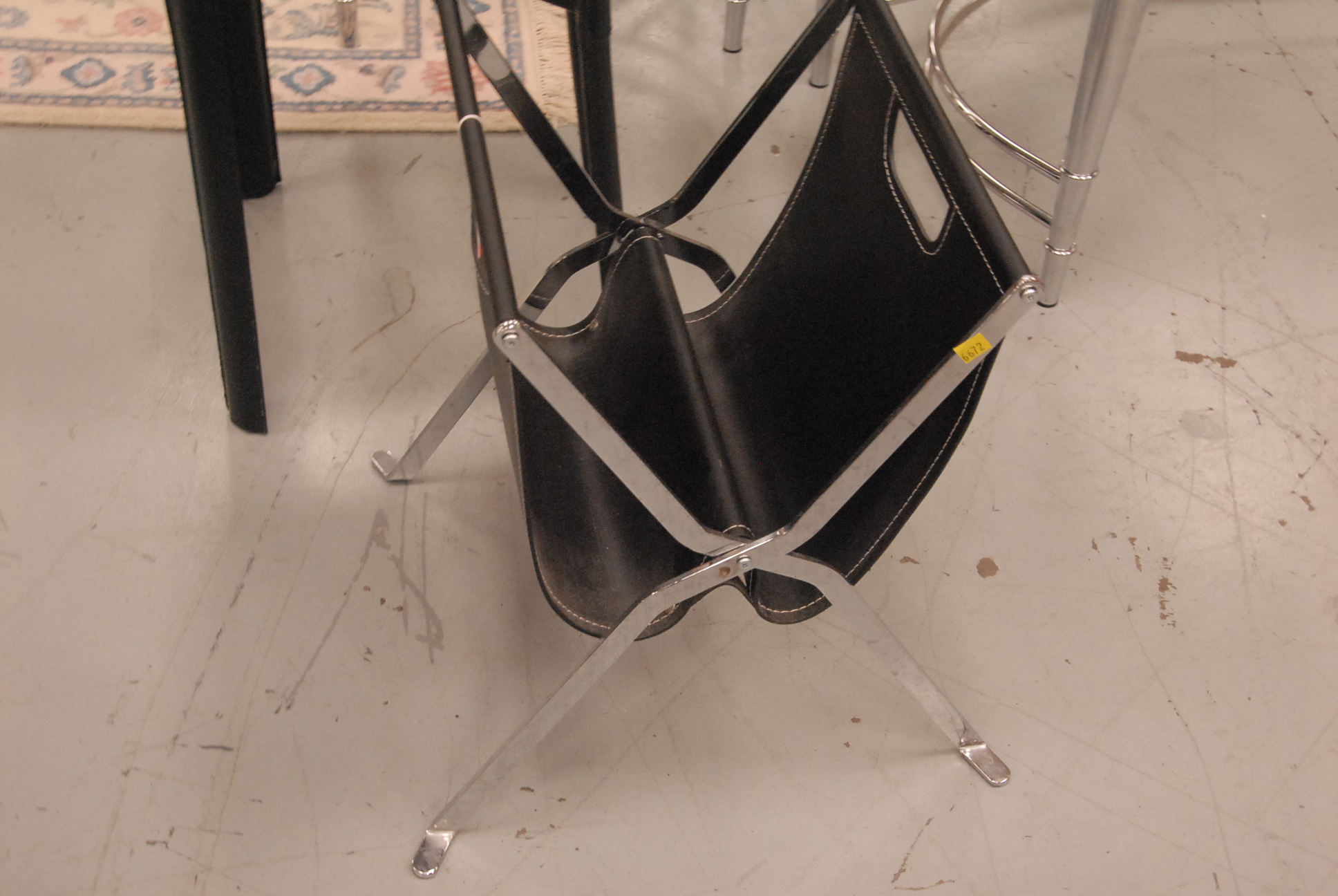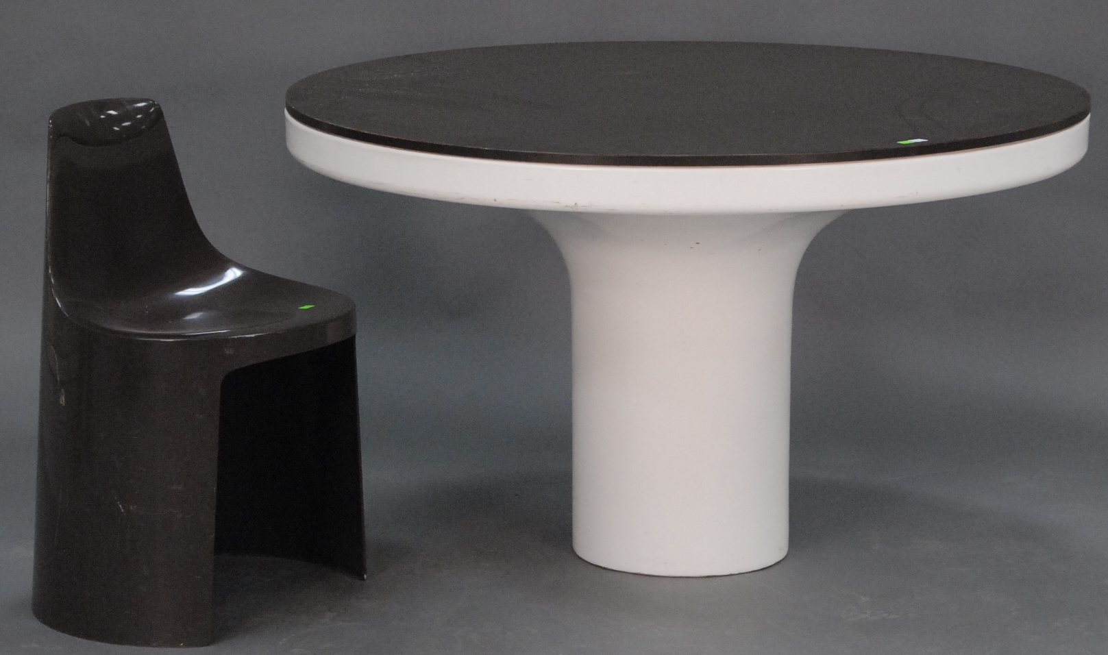 Two piece lot Giuseppe Raimondi ‘Torino’ dining table imported & distributed by Stendig. Flared mushroom shape with a white enamel finished base & a round melamine top, circa 1965 together with a 1960s molded plastic side chair. Table deaccessioned from the architect Bimel Kehm’s home in New Canaan with matching chair.