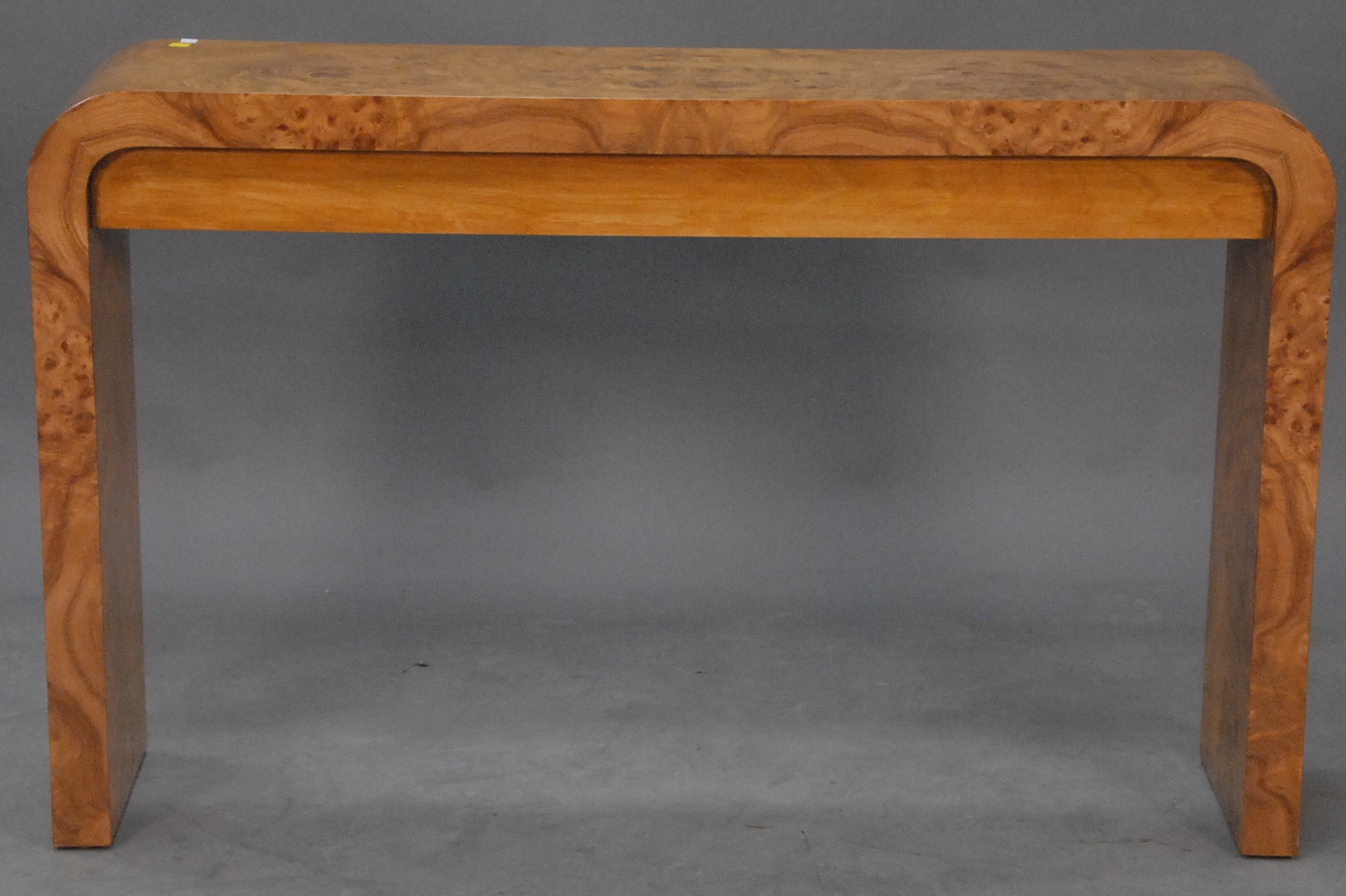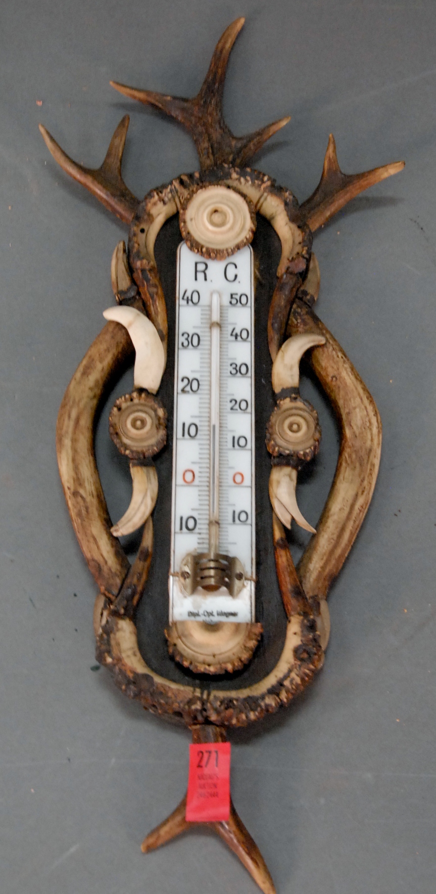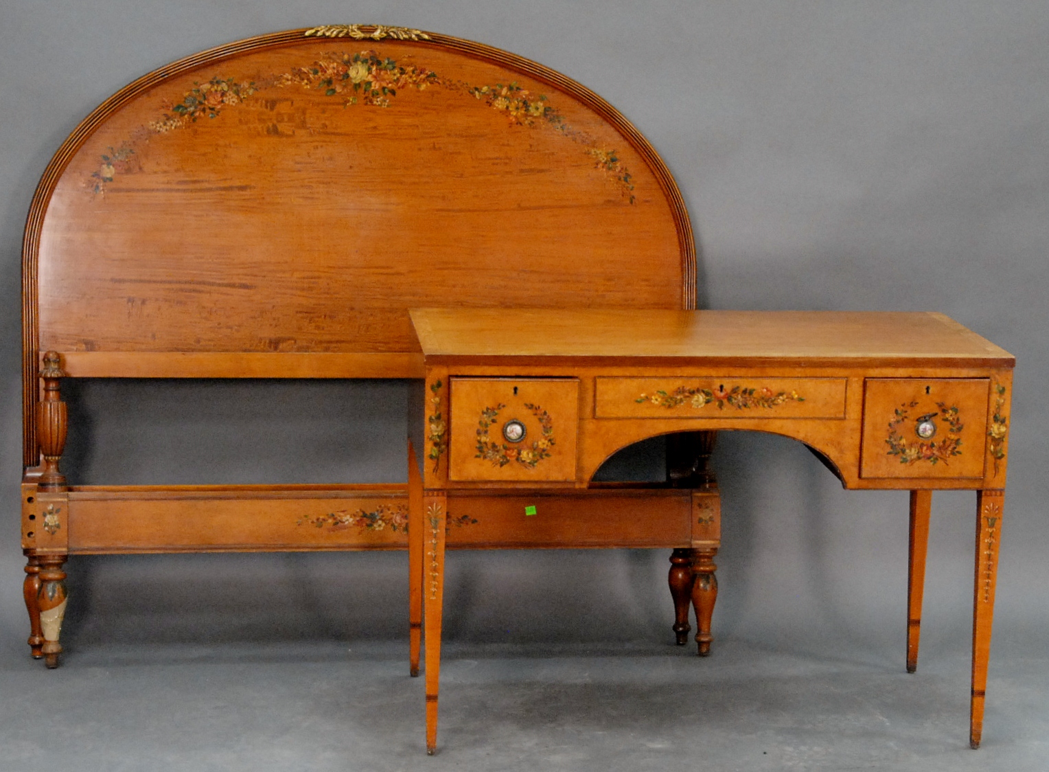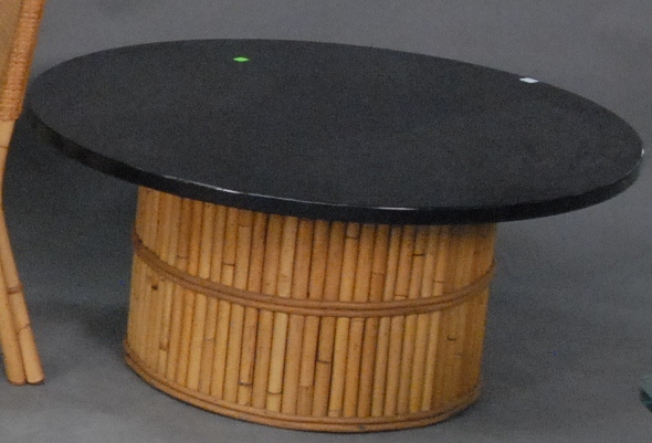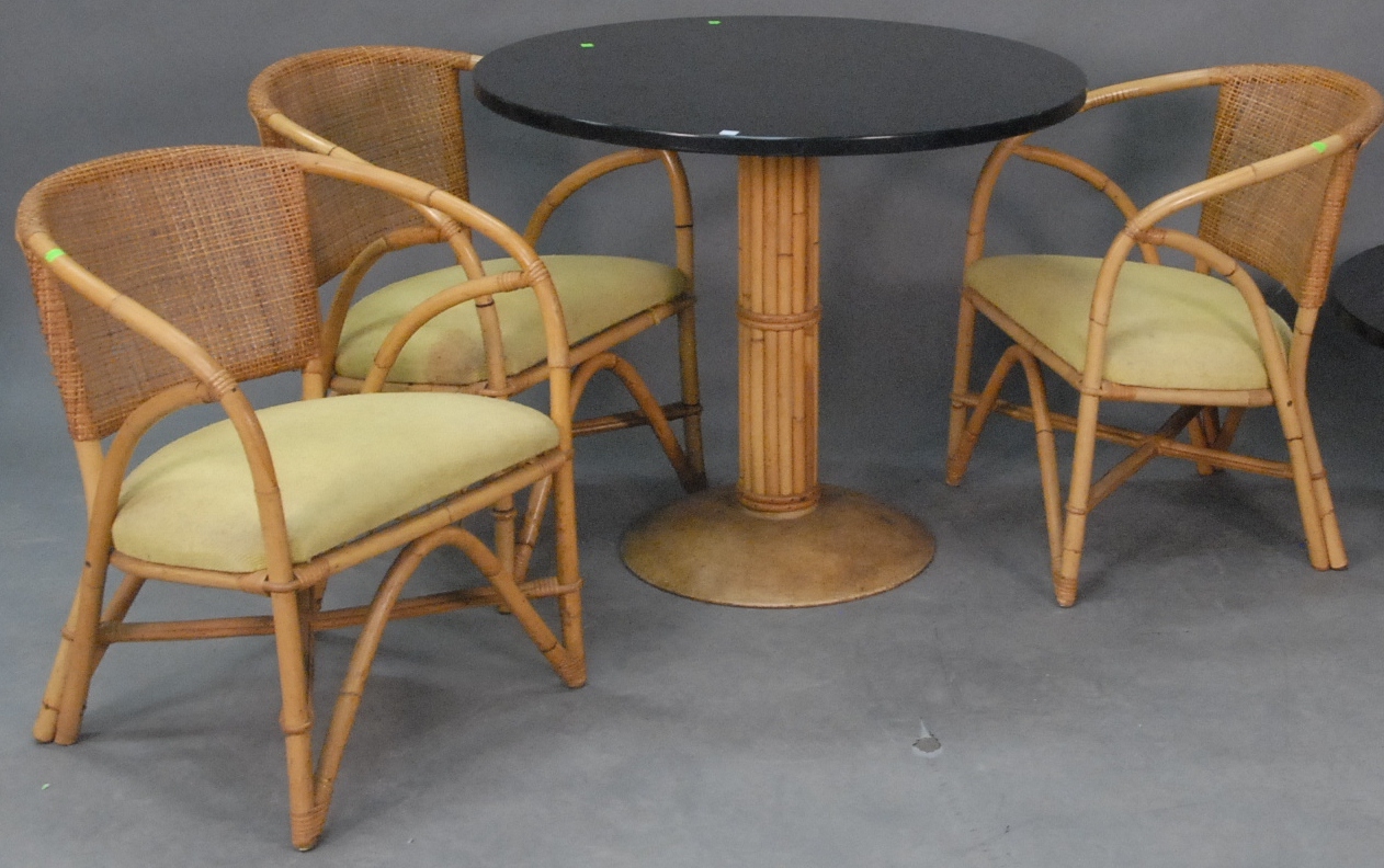 Signed Ficks Reed luncheon set being a round, black lacquered top supported by a bamboo column set in a painted steel circular base together with three matching bamboo arm chairs with wicker backs and padded seats, circa 1935, dia. 36.