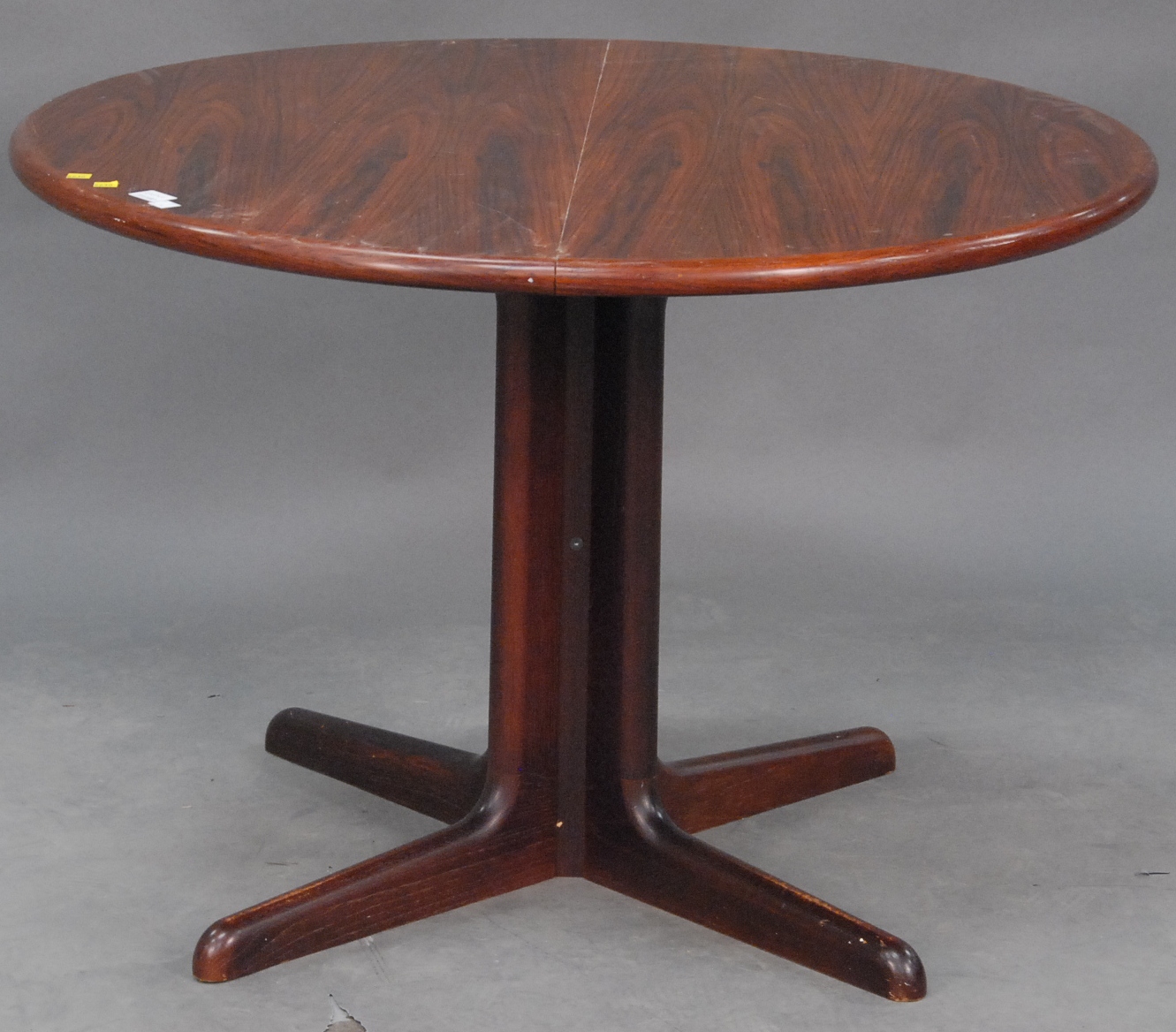 Laminated rosewood dining table manufactured by Gudme Mobelfabrik A/S together with four laminated rosewood dining chairs by Anderstrup Mobelfabrik A/S, all made in Denmark.