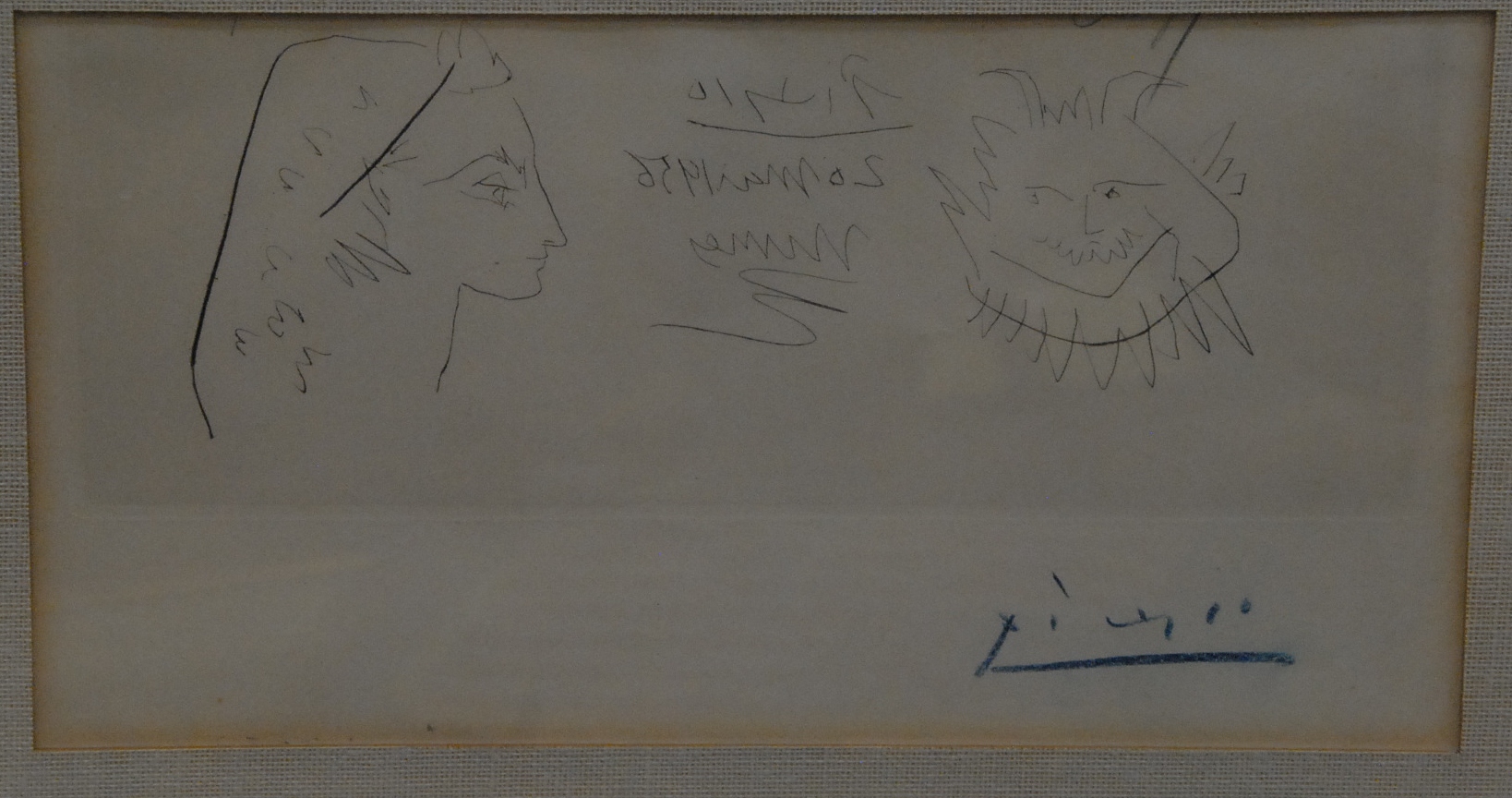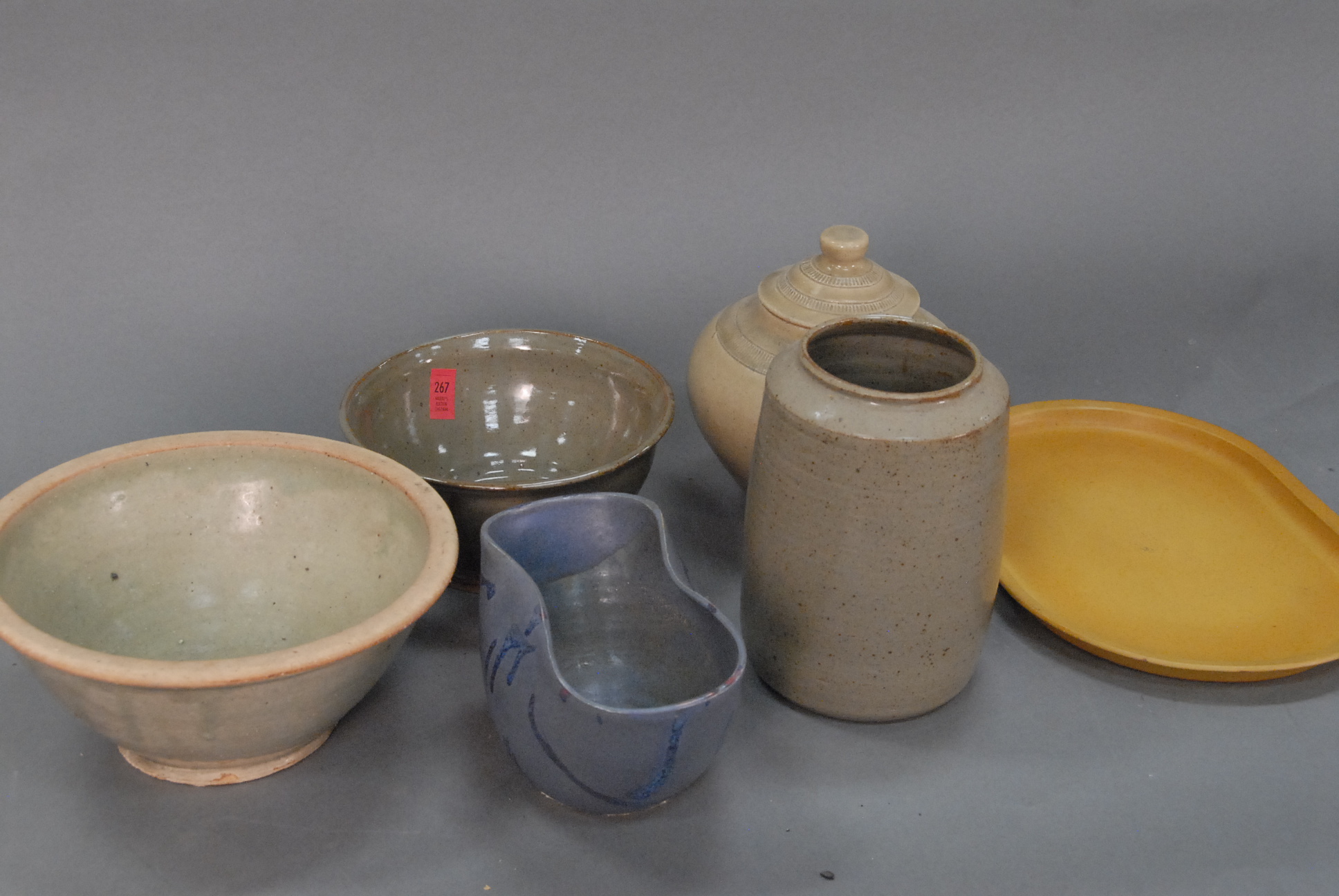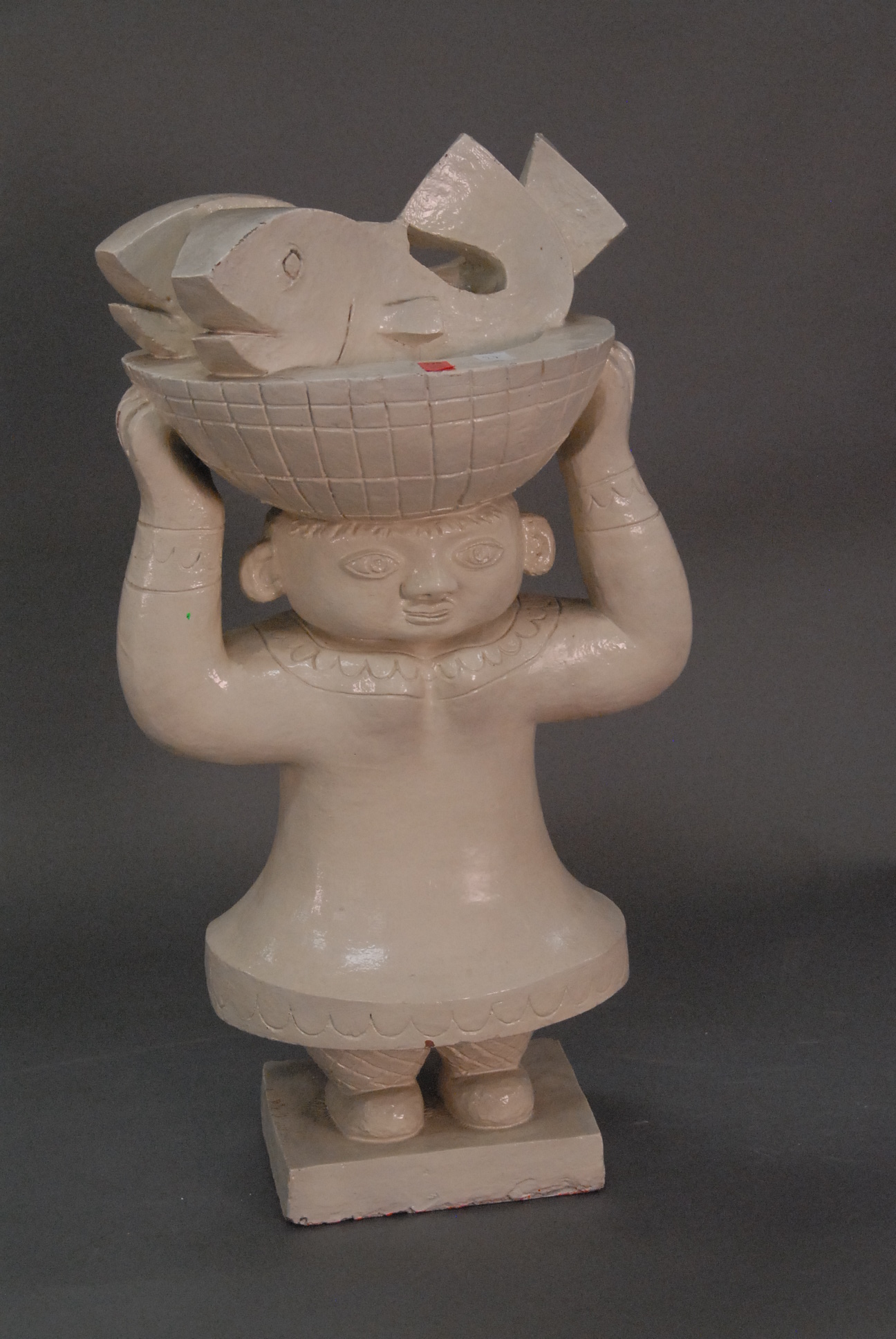 Large and whimsical wood sculpture of a round faced person in peasant costume attributed to Danish artist Bjorn Wiinblad 1918-2006. Possible later addition of paint, minor flaking consistent with use, circa 1960, ht. 28.