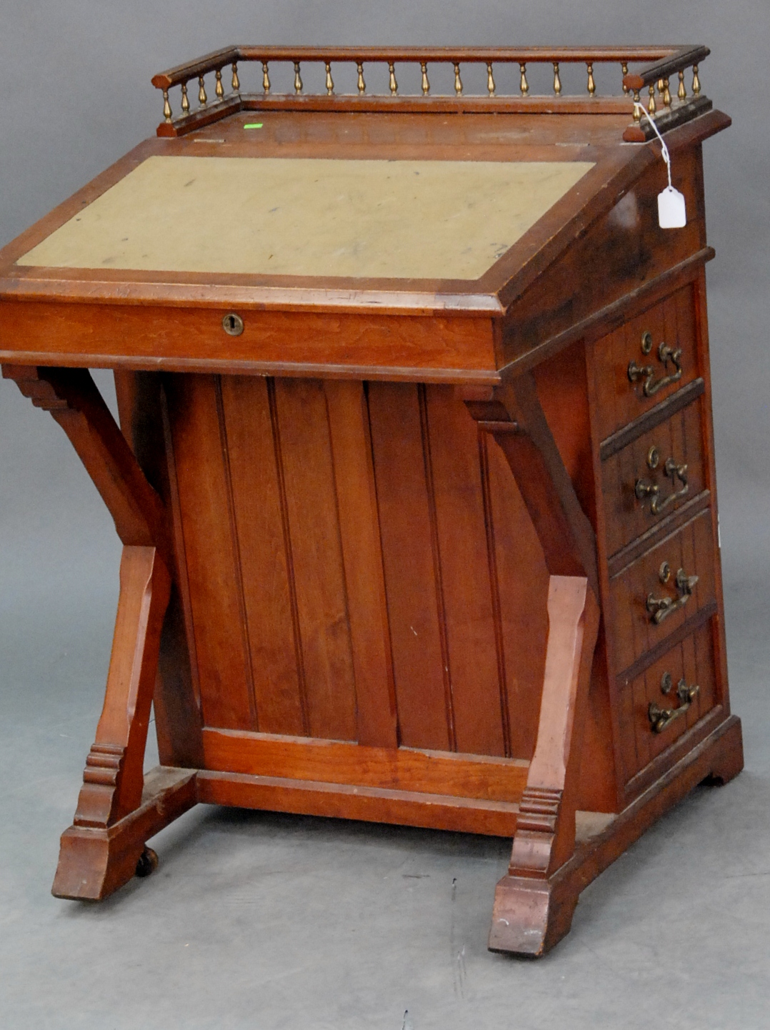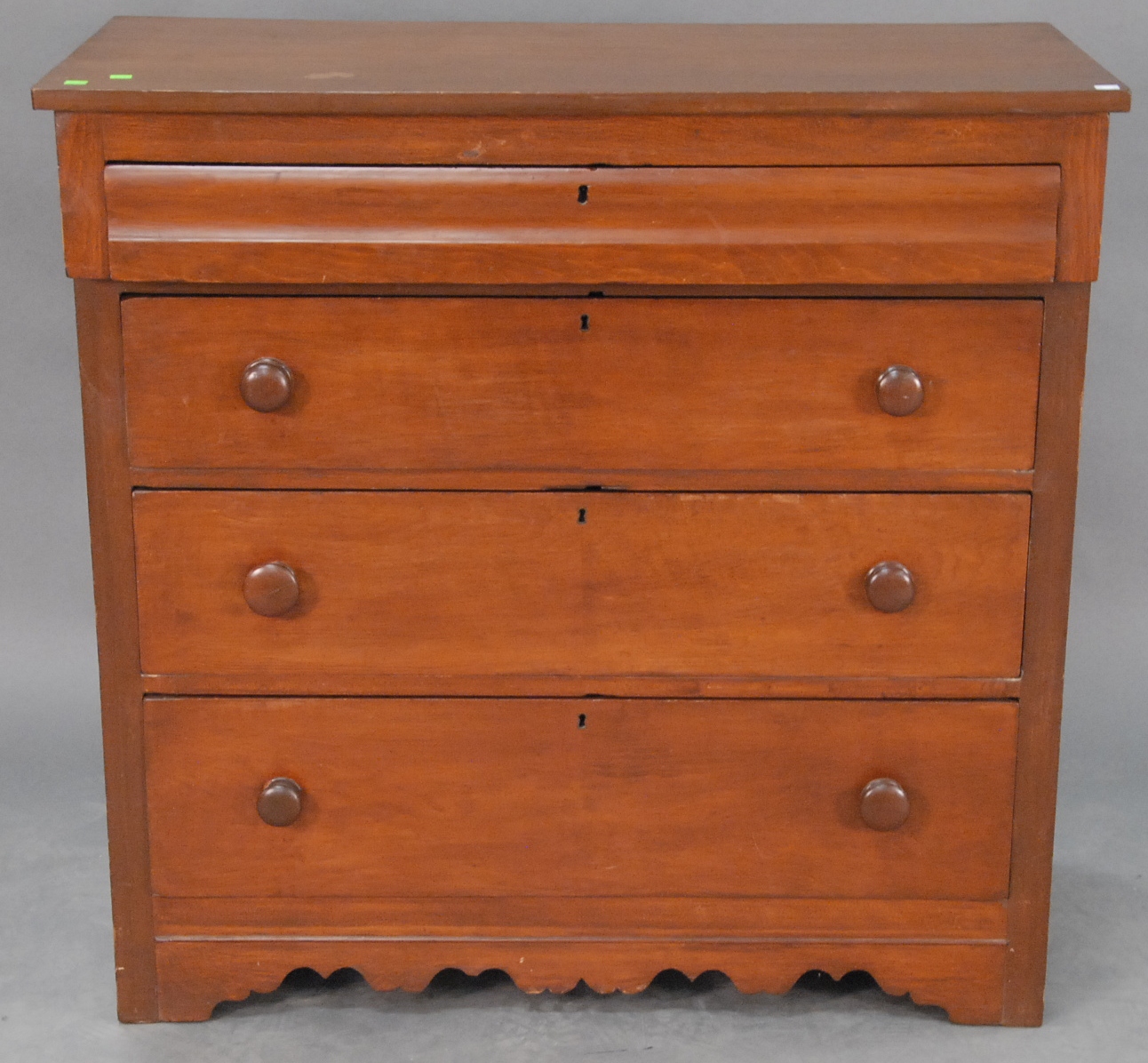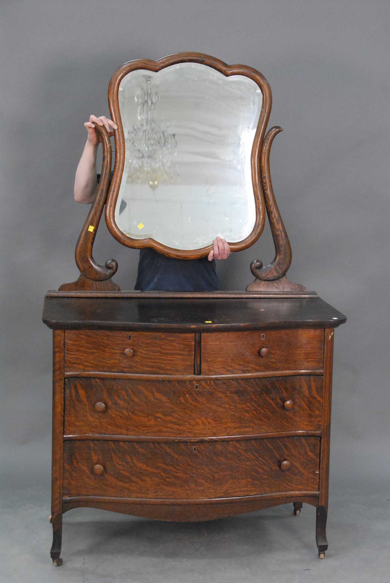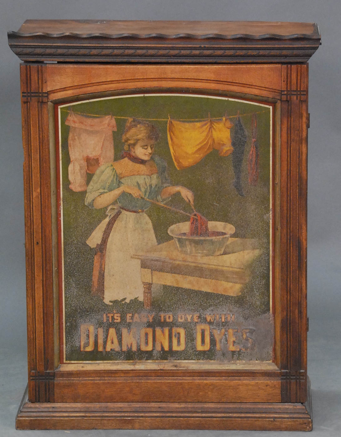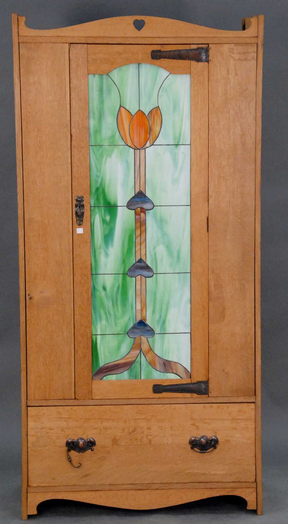 English Arts & Crafts oak armoire in the style of C.A. Voysey having a heart shaped cutout above a colored leaded glass door with copper strap hinges above a large single drawer, circa 1910, ht. 74 wd. 36.