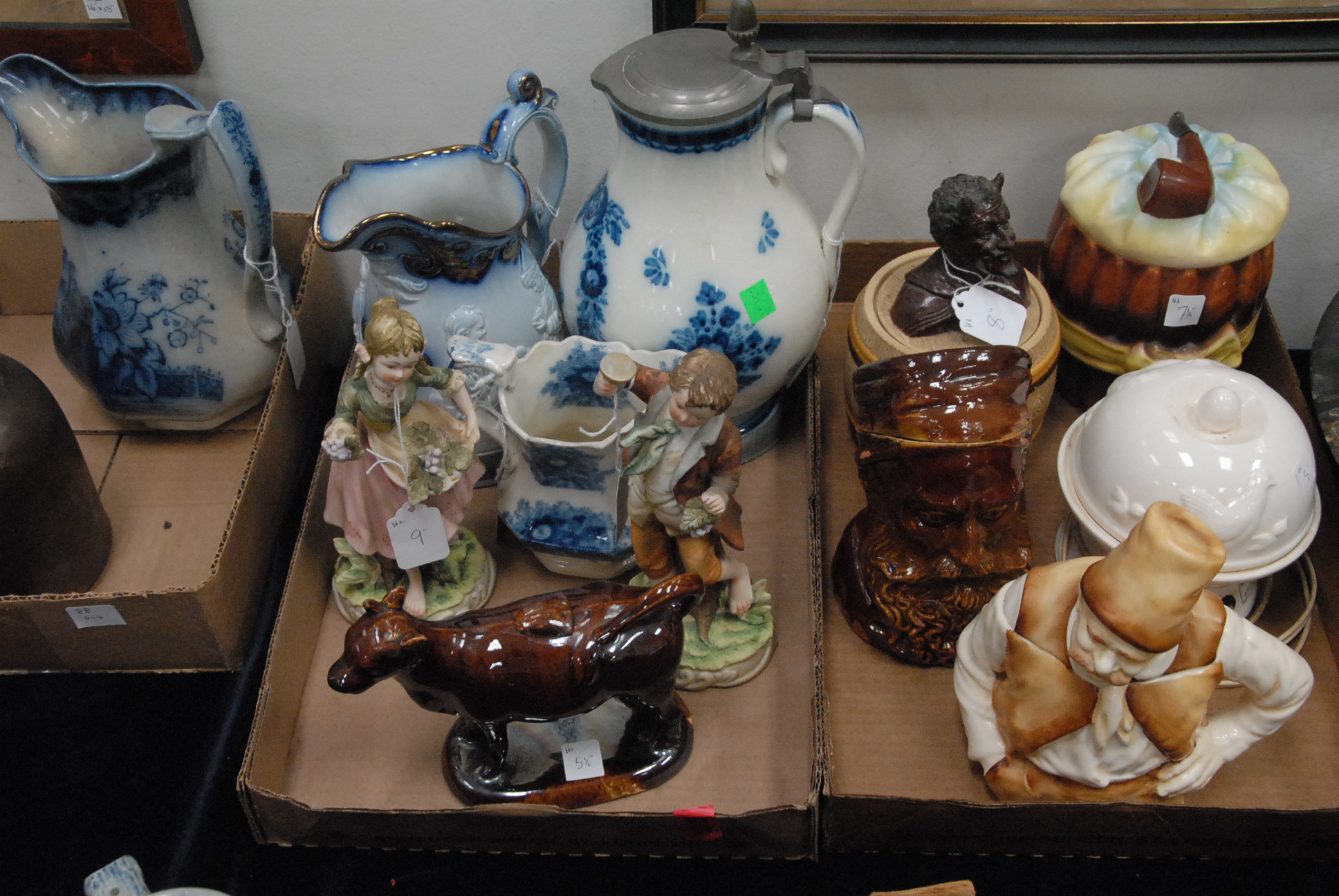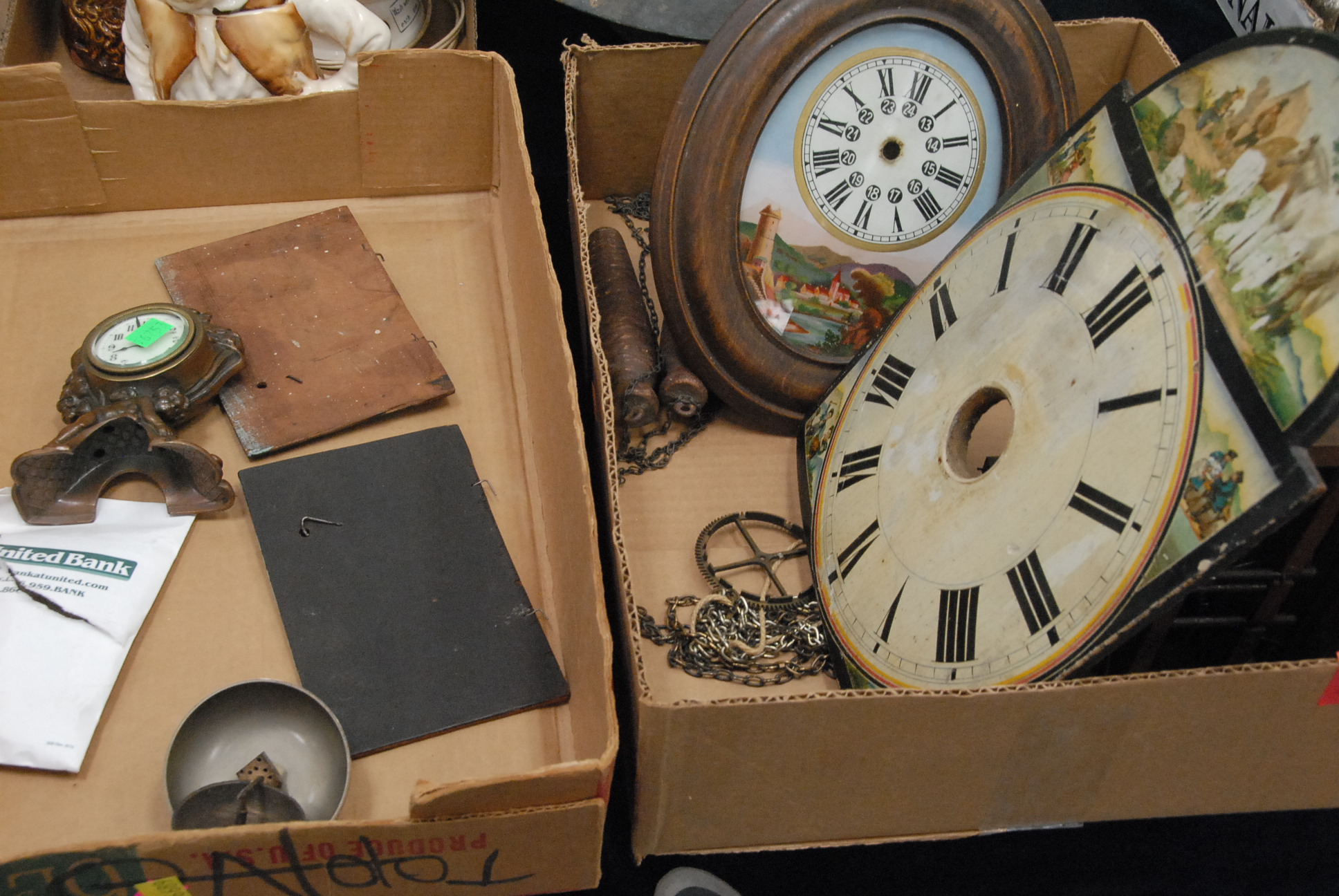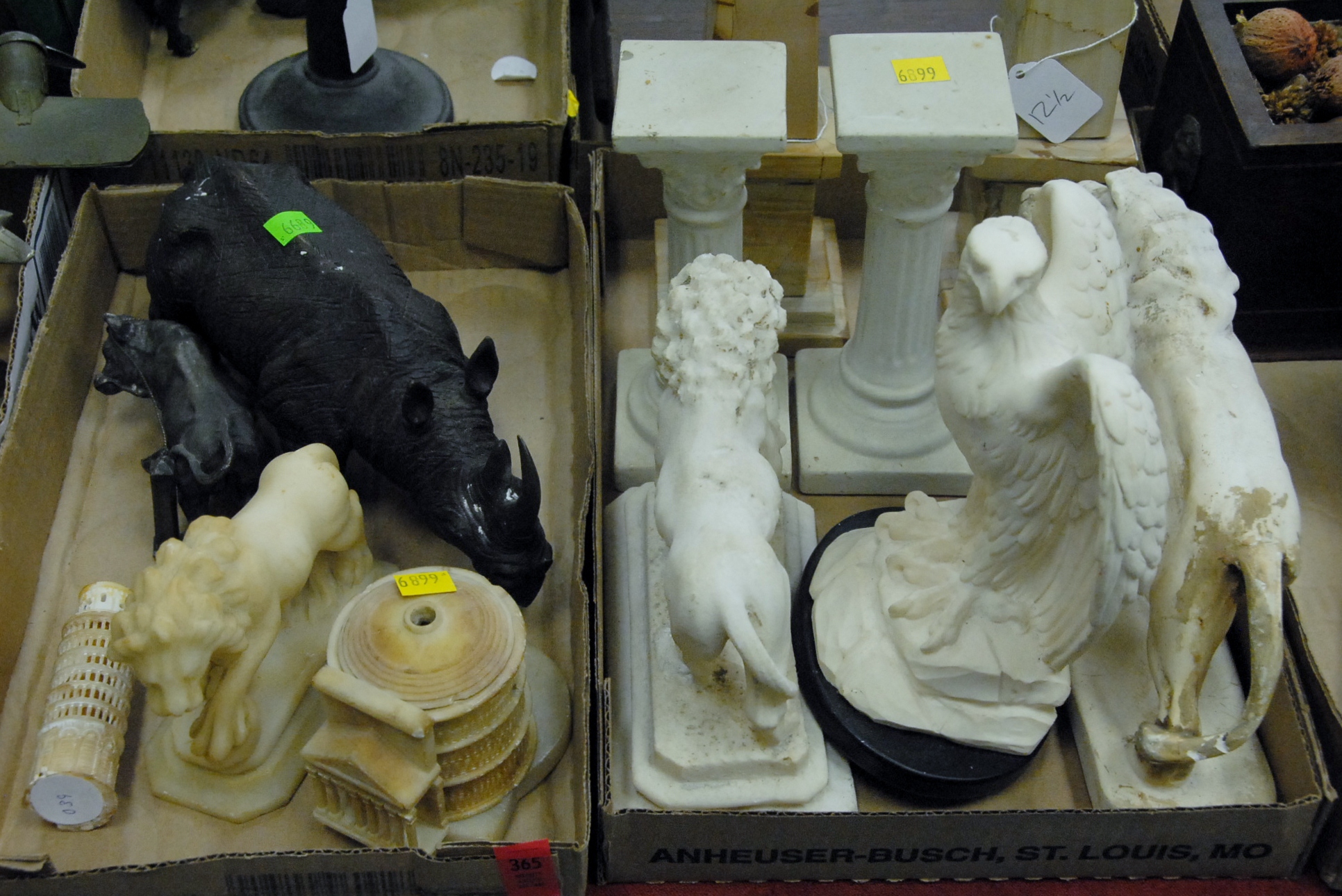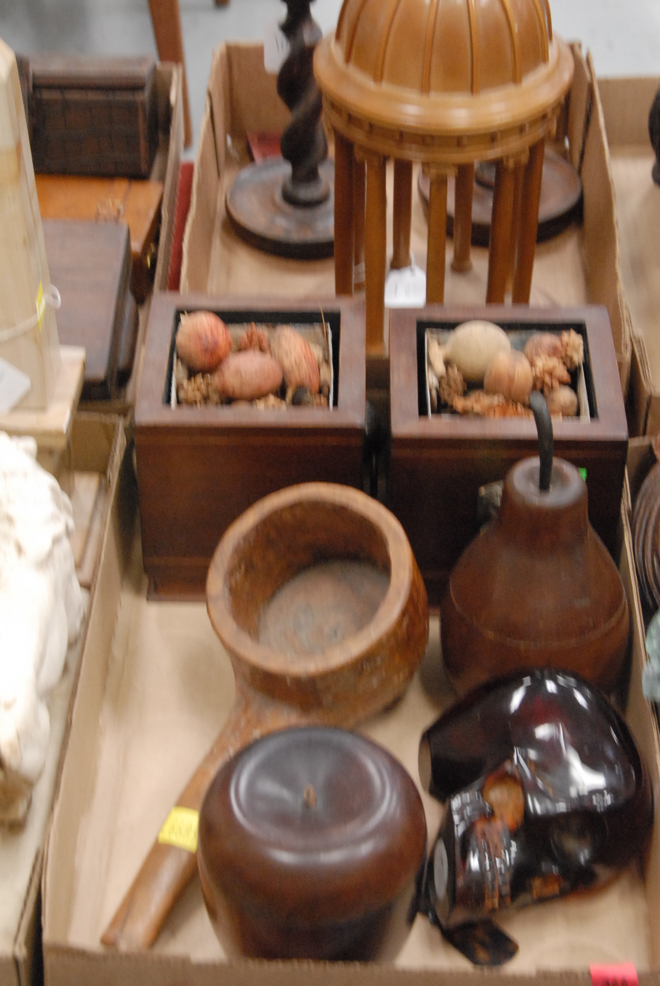 Three box lots of mostly wooden items to include two reproduction boxes, amber skull, letter opener, small wooden planter, wooden candlestick, wooden dome, and little wooden boxes.