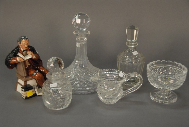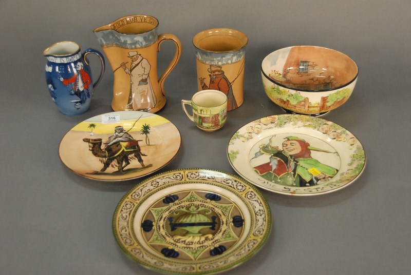 Eight pieces of Royal Doulton to include three plates, The Jester, Desert Scenes and one with an urn on it Gaffers bowl small chip on foot Dickensware cup two creamers and a sugar.
