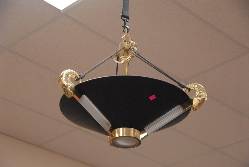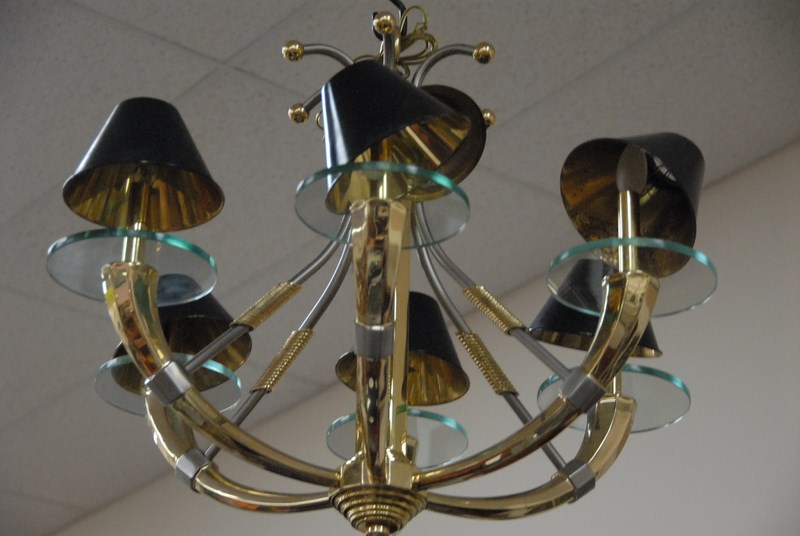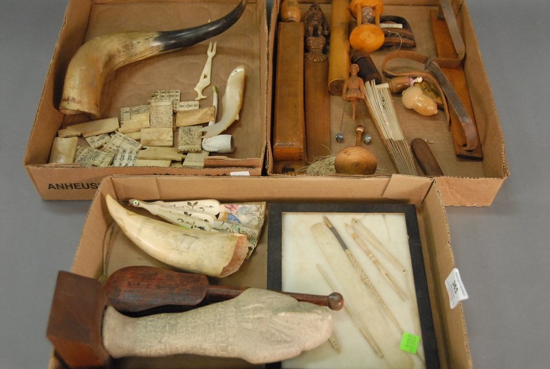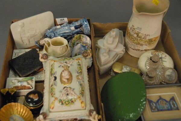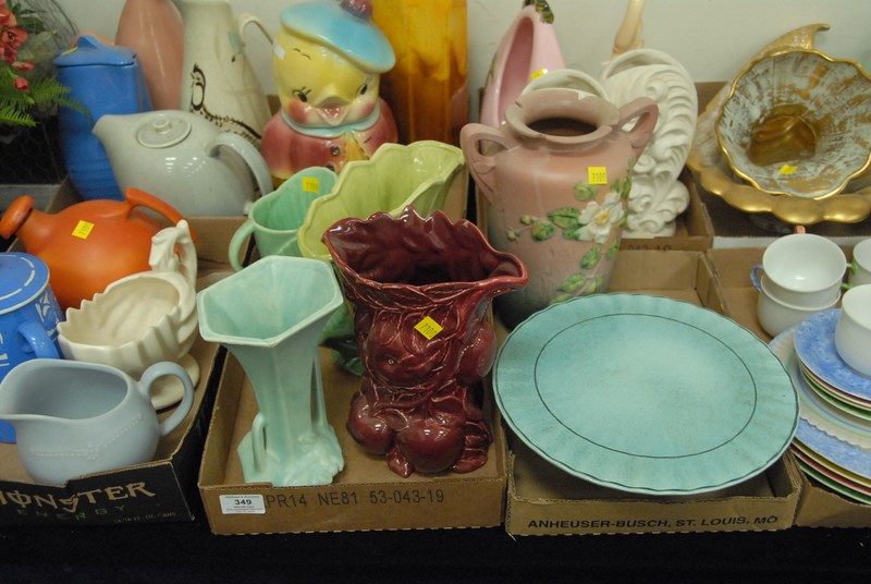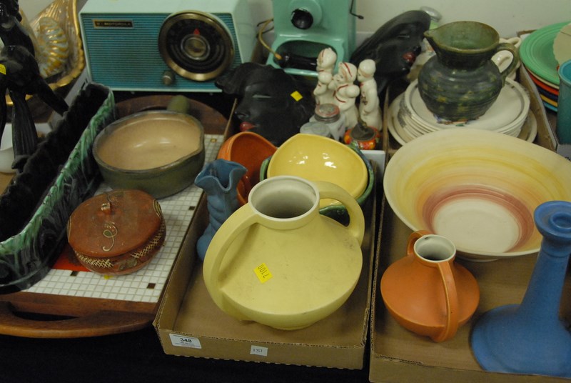 Four boxes of pottery and Mid-Century items to include Royal Haegar bowl, Coors vases, Fulper, Motorola radio, tray, two art deco hanging profiles, etc.