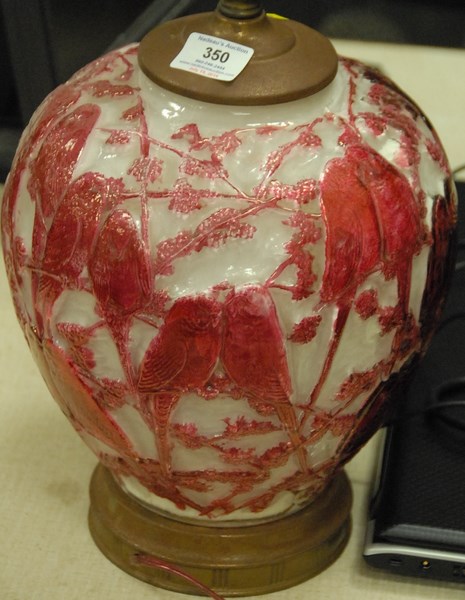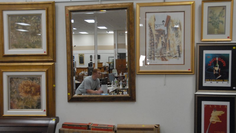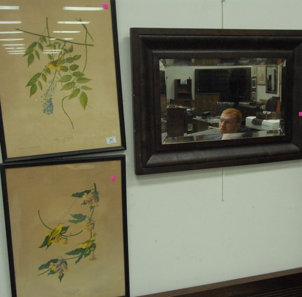 Three piece lot to include a print after J.J. Audubon Yellow Poll Warbler 24 x 17 1/2, a chromolithograph by J Bien Rathbone Warbler 24 x 17 1/2, and an Ogee mirror 23 x 33.