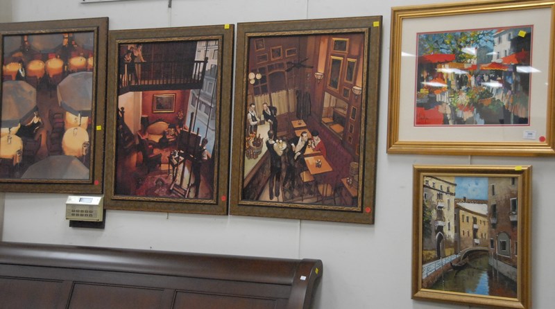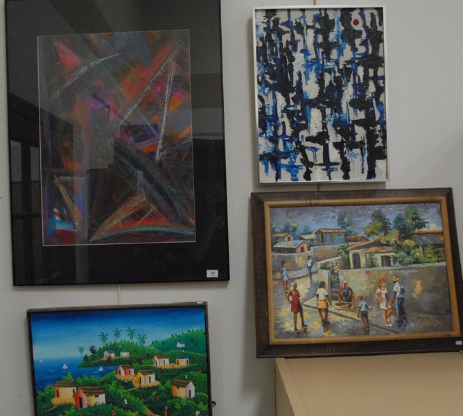 Group of four framed paintings to include an abstract blue and white Judith Hihon Alpert, Haiti oil on canvas signed Sanon, Etienne Charles street scene, and a contemporary abstract pastel, 20 x 24 to 29 x 21