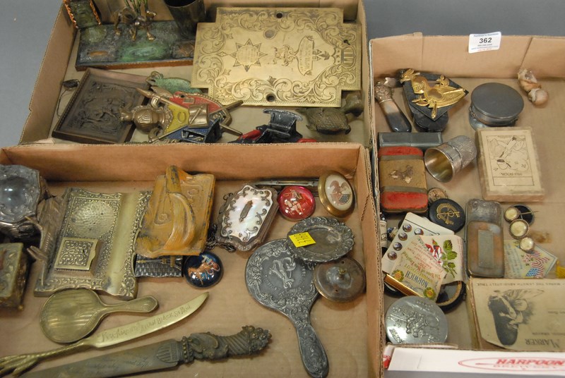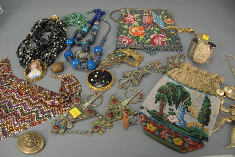 Group of jewelry to include enameled silver beaded necklace, brass fish with stone, two beeded purses, sterling bracelet with carved beetle, pocket watches, enameled Evan’s compact, etc.
