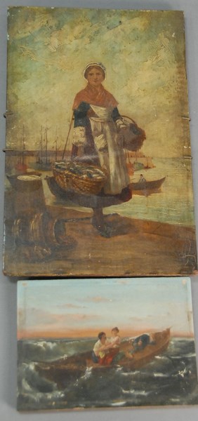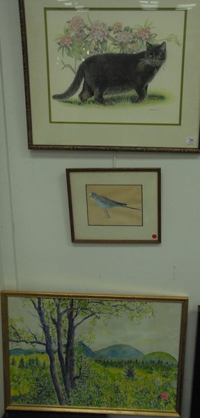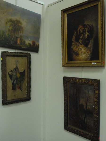 Group of four oil paintings to include an oil on board signed lower left A. Hicks Trees by the Lake 12 x 18, an oil on canvas landscape with graves as is unsigned, an oil on canvas unsigned 19th century of two birds, and an oil on canvas unsigned of a dog 20 x 15.