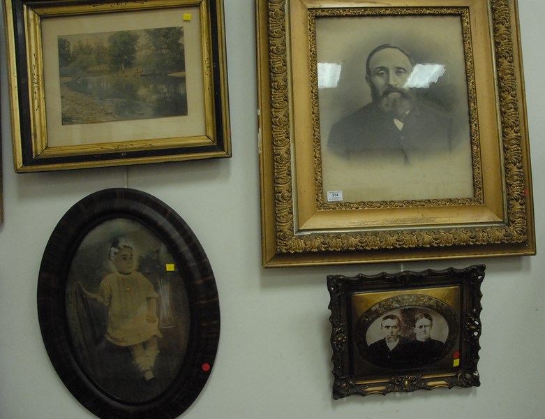 Group of five framed pieces to include a pair of Victorian framed prints, an oval framed print of a small child, a Victorian reverse painting on glass, and a Wallace Nutting print The Swimming Pond, 10 x 11 1/2 to 20 x 15 1/2.