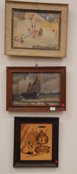 Group of three oil paintings to include Frances Austin still life in yellow oil on artist board 12 x 10, oil on canvas signed lower right R. Grant 1942 of collages post Cubist 11 x 14, and an oil on canvas of sailing vessel unsigned 10 x 15.
