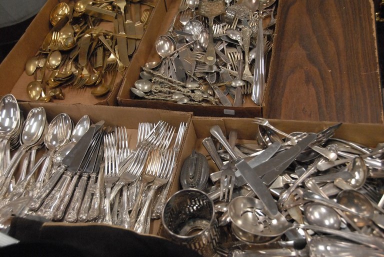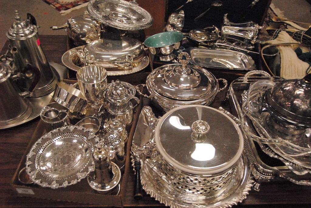 Large group of silverplate serving pieces, flatware, etc. along with a pewter tea set.