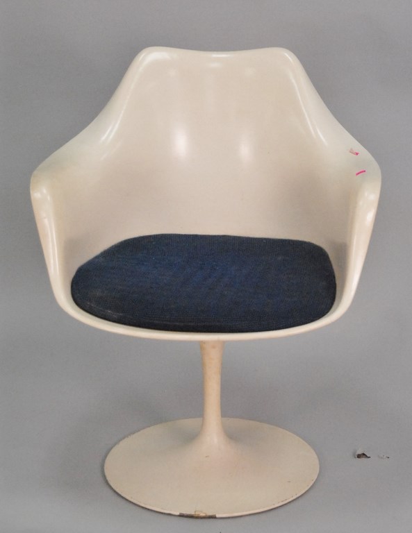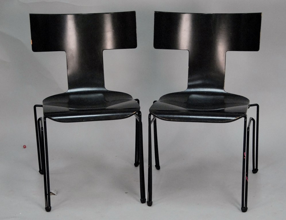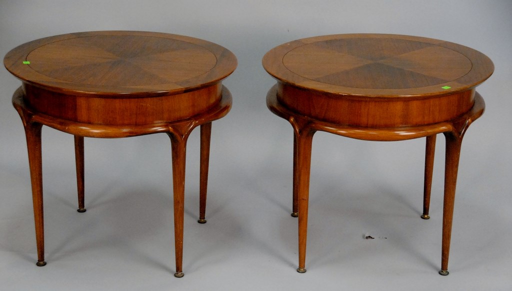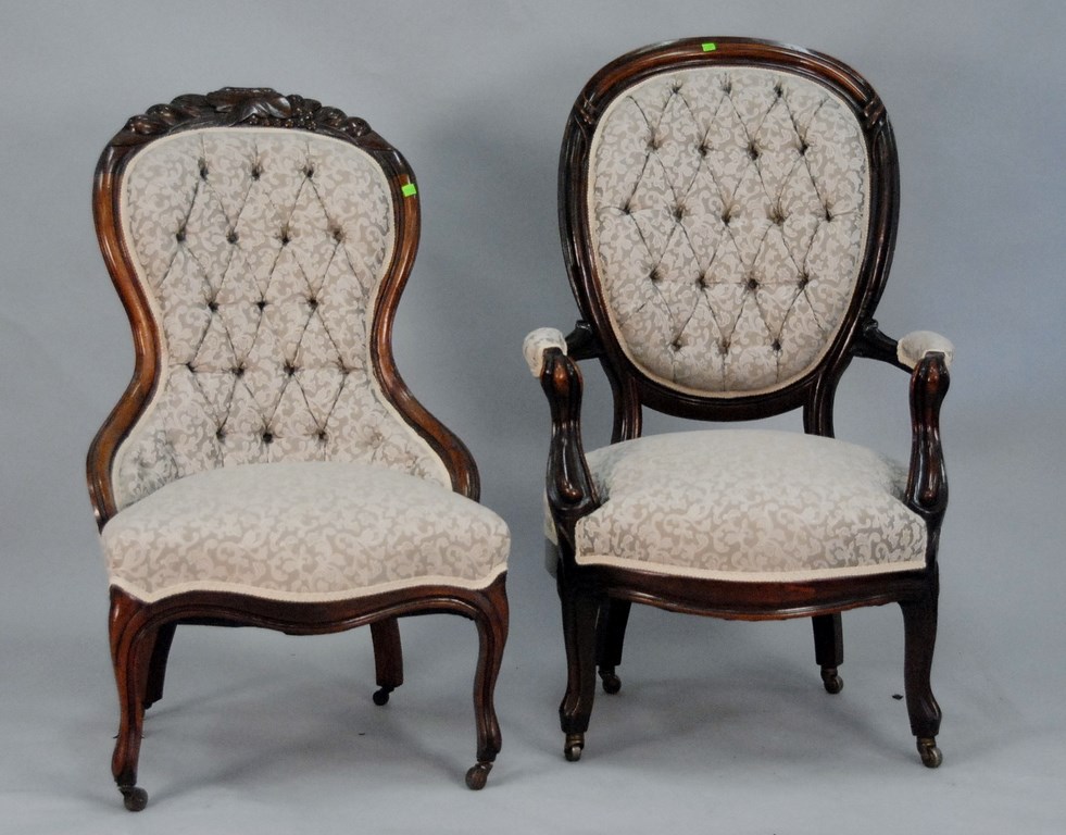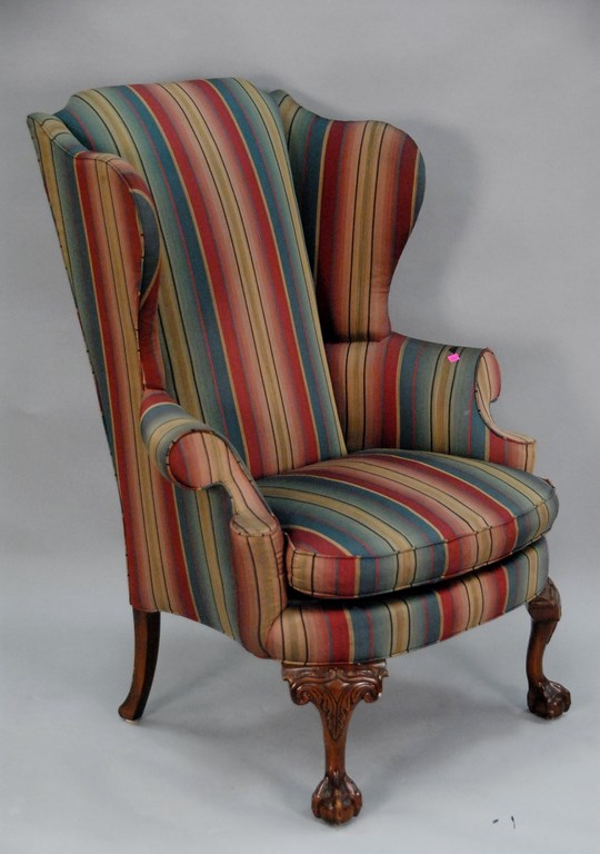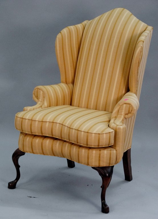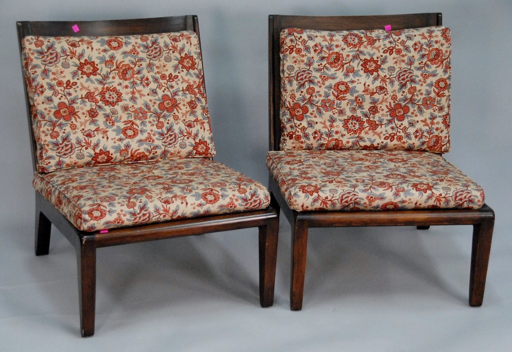 Pair of faux painted slipper chairs, bullnose cushions, bullnosed chair front.