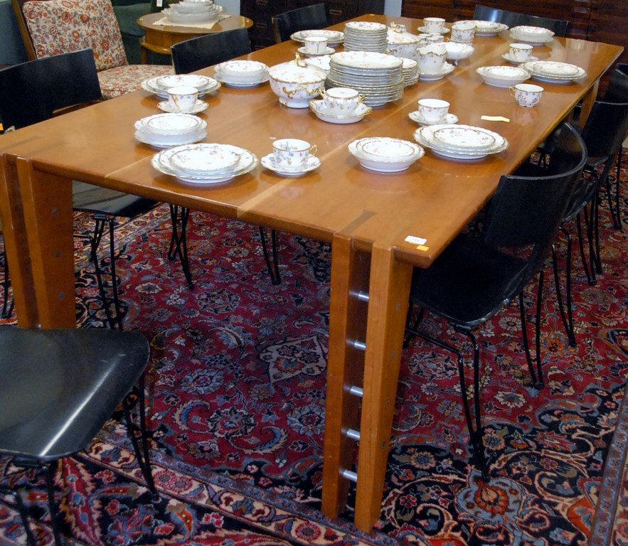 Studio Craft Movement custom dining table of solid cherry with aluminum accents with the top supported by four sets of parallel legs with aluminum spacers each leg set dovetailed in to the top at each corner, C.1990, ht. 29 1/2in. top: 48 x 96.