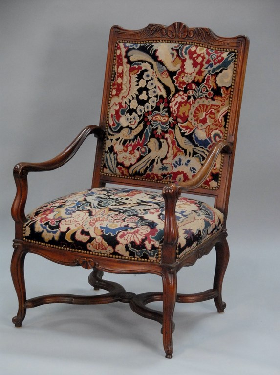 Louis XV style armchair and foot stool, all with needlepoint upholstery.
