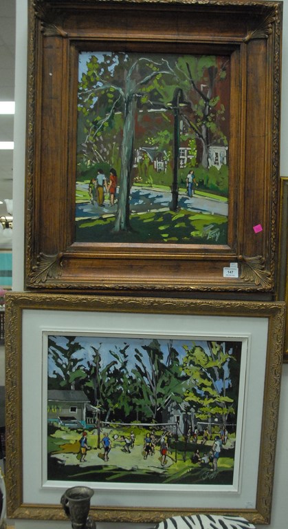Robert Roy 1957 Volleyball oil on masonite signed lower left R. Roy 16 x 19 1/2