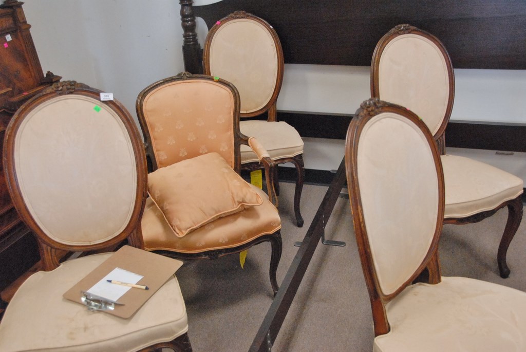 Five piece lot to include set of four cameo back Louis XV style chairs and one Louis XV style fauteuil.