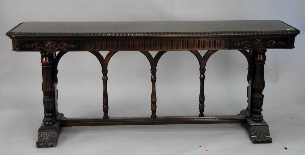 Carved walnut hall table, top: 20 x 72.