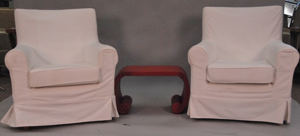 Three piece lot to include pair of vinyl upholstered wing chairs and cherry stand.