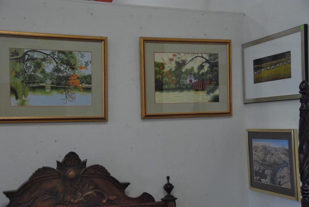 Group of six framed prints and embroideries.