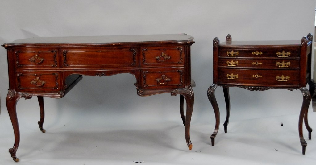 French style mahogany desk and a three drawer stand.